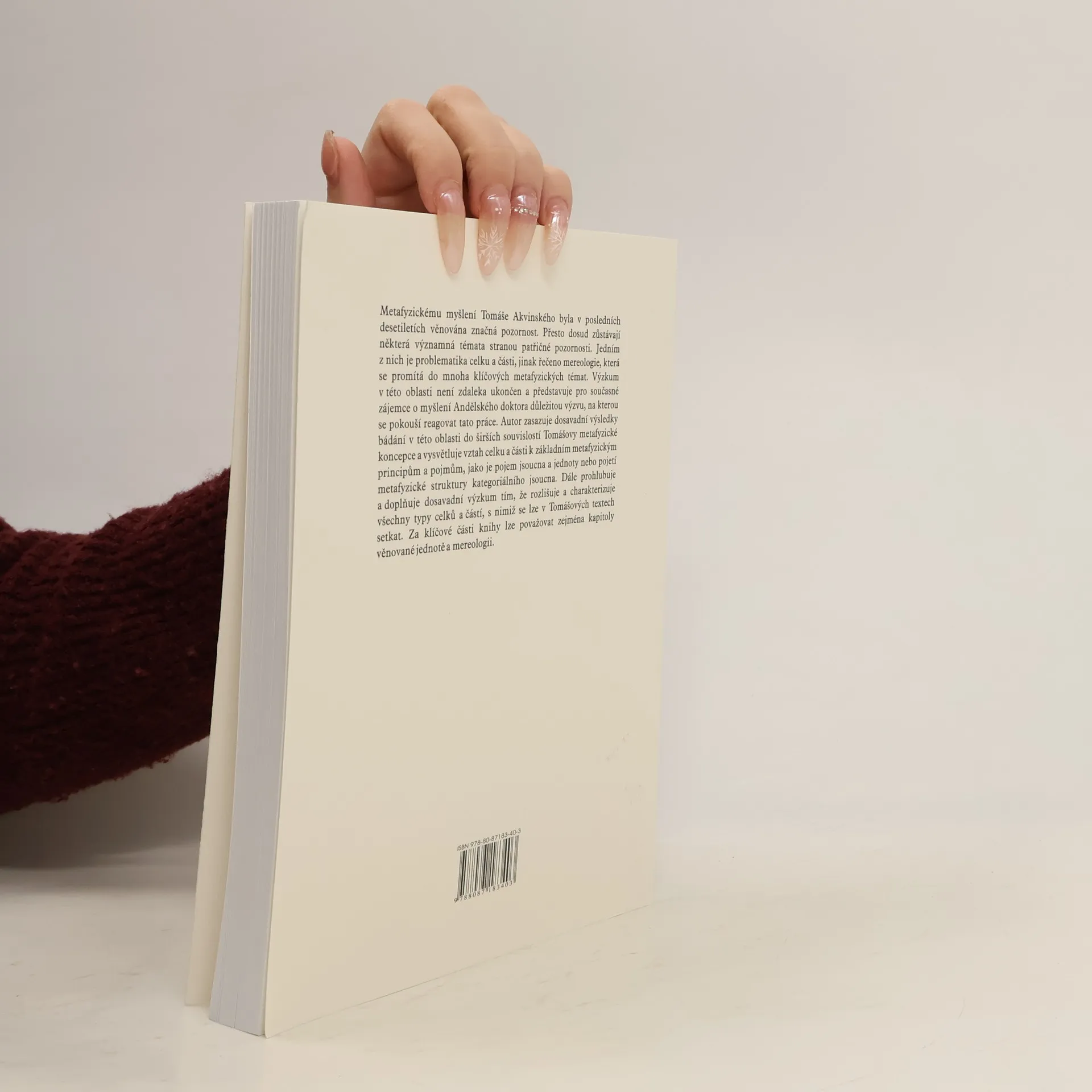 Metafyzickému myšlení Tomáše Akvinského byla v posledních desetiletích věnována značná pozornost. Přesto dosud zůstávají některá významná témata stranou patřičné pozornosti. Jedním z nich je problematika celku a části, jinak řečeno mereologie, která se promítá do mnoha klíčových metafyzických témat. Výzkum v této oblasti není zdaleka ukončen a představuje pro současné zájemce o myšlení Andělského doktora důležitou výzvu, na kterou se pokouší reagovat tato práce. Autor zasazuje dosavadní výsledky bádání v této oblasti do širších souvislostí Tomášovy metafyzické koncepce a vysvětluje vztah celku a části k základním metafyzickým principům a pojmům, jako je pojem jsoucna a jednoty nebo pojetí metafyzické struktury kategoriálního jsoucna. Dále prohlubuje a doplňuje dosavadní výzkum tím, že rozlišuje a charakterizuje všechny typy celků a částí, s nimiž se lze v Tomášových textech setkat. Za klíčové části knihy lze považovat zejména kapitoly věnované jednotě a mereologii.