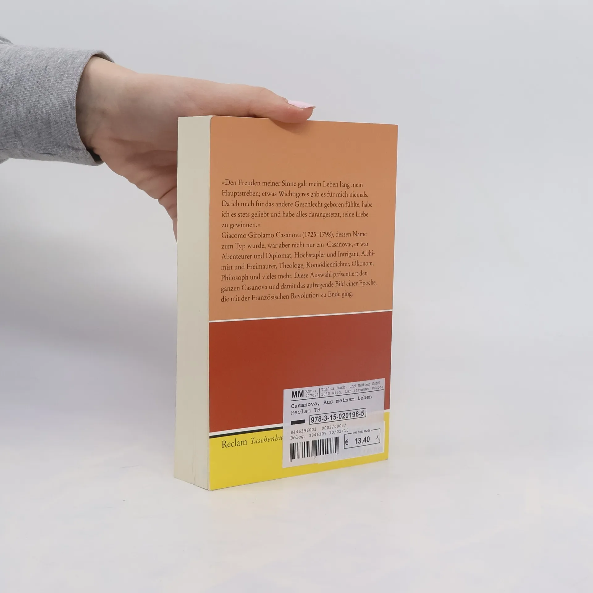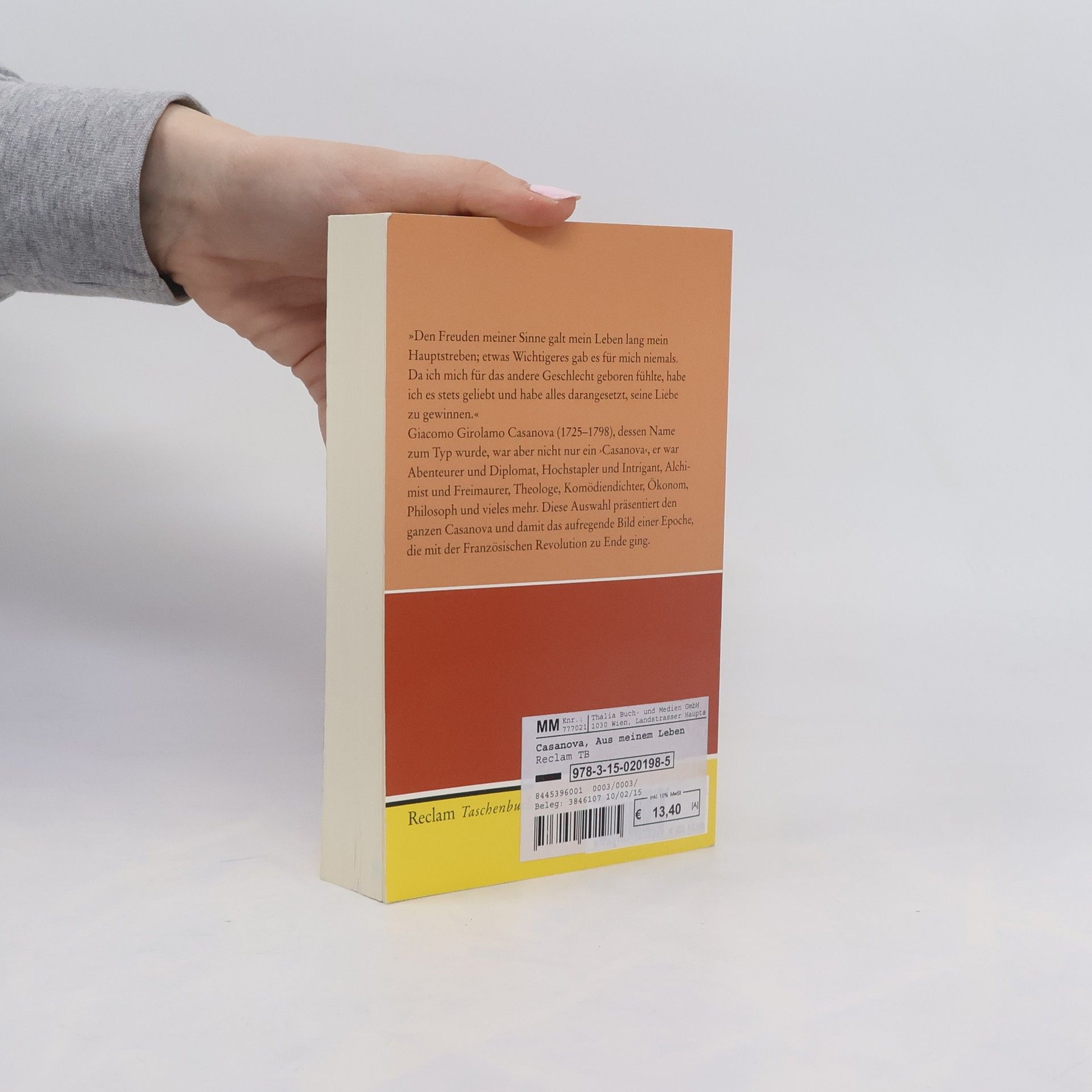 »Den Freuden meiner Sinne galt mein Leben lang mein Hauptstreben; etwas Wichtigeres gab es für mich niemals.« Giacomo Girolamo Casanova (1725–1798), dessen Name zum Typ wurde, war aber nicht nur ein ›Casanova‹, er war Abenteurer und Diplomat, Hochstapler und Intrigant, Alchimist und Freimaurer, Theologe, Komödiendichter, Ökonom, Philosoph und vieles mehr. Seinen Ruhm als der große Verführer verdankt er seinem umfangreichen Memoirenwerk, das allerdings nicht allein aus ›Stellen‹ besteht. Diese Auswahl präsentiert den ganzen Casanova und damit das aufregende Bild einer Epoche, die mit der Französischen Revolution zu Ende ging.