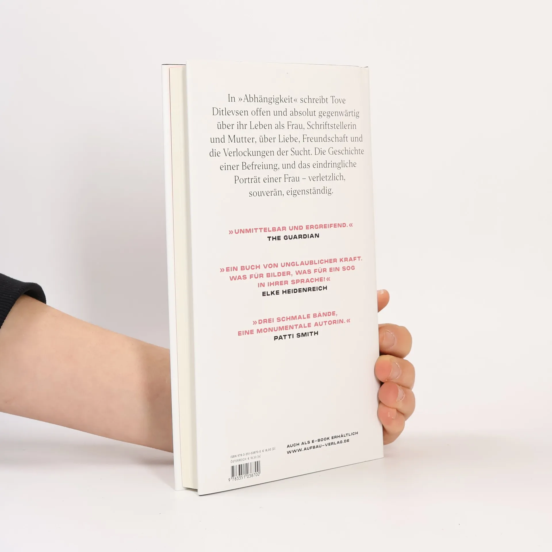 „Von atemberaubender Intensität und Schönheit. Aus dem Staub ihres Lebens leuchtet dieses Werk.“ Elke Heidenreich, Spiegel Online In „Abhängigkeit“ schreibt Tove Ditlevsen offen und absolut gegenwärtig über ihr Leben als Frau, Schriftstellerin und Mutter, über Liebe, Freundschaft und die Verlockungen der Sucht. Die Geschichte einer Befreiung, und das eindringliche Porträt einer Frau – verletzlich, souverän, eigenständig. „Unmittelbar und ergreifend.“ The Guardian „Hart und zärtlich, von grandioser Schönheit.“ The Spectator „Das Porträt einer Frau, die ihr Leben entschieden zu ihrem eigenen macht. Ein Leben, so frei und ungestüm, ich bin versunken in Tove Ditlevsens Büchern.“ Nina Hoss „Tove Ditlevsens Kopenhagen-Trilogie, so viel steht jetzt schon fest, ist eines der großen literarischen Ereignisse des Jahres.„ Süddeutsche Zeitung „Drei schmale Bände, eine monumentale Autorin.“ Patti Smith „Großartig, von hypnotischer Qualität.“ The New York Times „Was Autorinnen wie Annie Ernaux, Rachel Cusk und Deborah Levy heute tun, hat Tove Ditlevsen schon vor über 50 Jahren getan. Autobiographisches Schreiben, vor dem man sich verneigen möchte. Endlich, endlich ist Ditlevsens Trilogie auf Deutsch zu lesen!” Emilia von Senger, She said