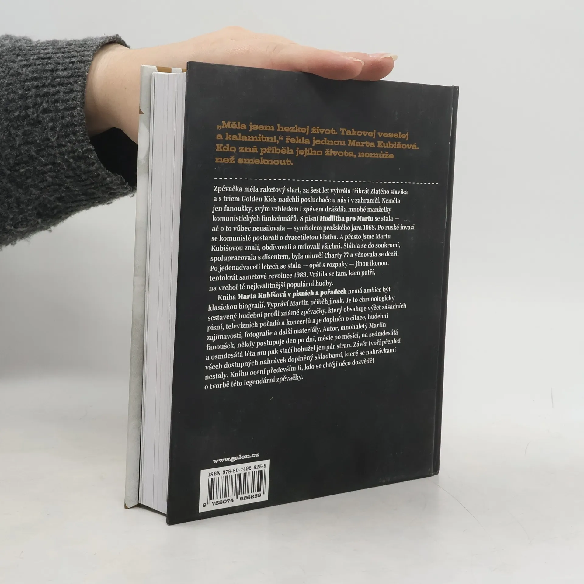 „Měla jsem hezkej život. Takovej veselej a kalamitní,“ řekla jednou Marta Kubišová. Její příběh je obdivuhodný. Zpěvačka zažila raketový start, vyhrála třikrát Zlatého slavíka a s triem Golden Kids nadchla posluchače doma i v zahraničí. Její vzhled a zpěv však dráždily manželky komunistických funkcionářů. S písní Modlitba pro Martu se nechtěně stala symbolem pražského jara 1968. Po ruské invazi následovala dvacetiletá klatba, ale Marta Kubišová zůstala v srdcích lidí. Stáhla se do soukromí, spolupracovala s disentem, stala se mluvčí Charty 77 a věnovala se dceři. Po jedenadvaceti letech se opět stala ikonou sametové revoluce 1989 a vrátila se na vrchol populární hudby. Kniha nemá ambice být klasickou biografií, ale chronologicky sestaveným hudebním profilem, který zahrnuje zásadní písně, televizní pořady a koncerty, doplněný o citace, hudební zajímavosti a fotografie. Autor, dlouholetý fanoušek, postupuje den po dni a měsíc po měsíci, přičemž na sedmdesátá a osmdesátá léta mu stačí jen pár stran. Závěr obsahuje přehled všech dostupných nahrávek a skladby, které se nahrávkami nestaly. Kniha je určena těm, kteří chtějí poznat tvorbu této legendární zpěvačky.