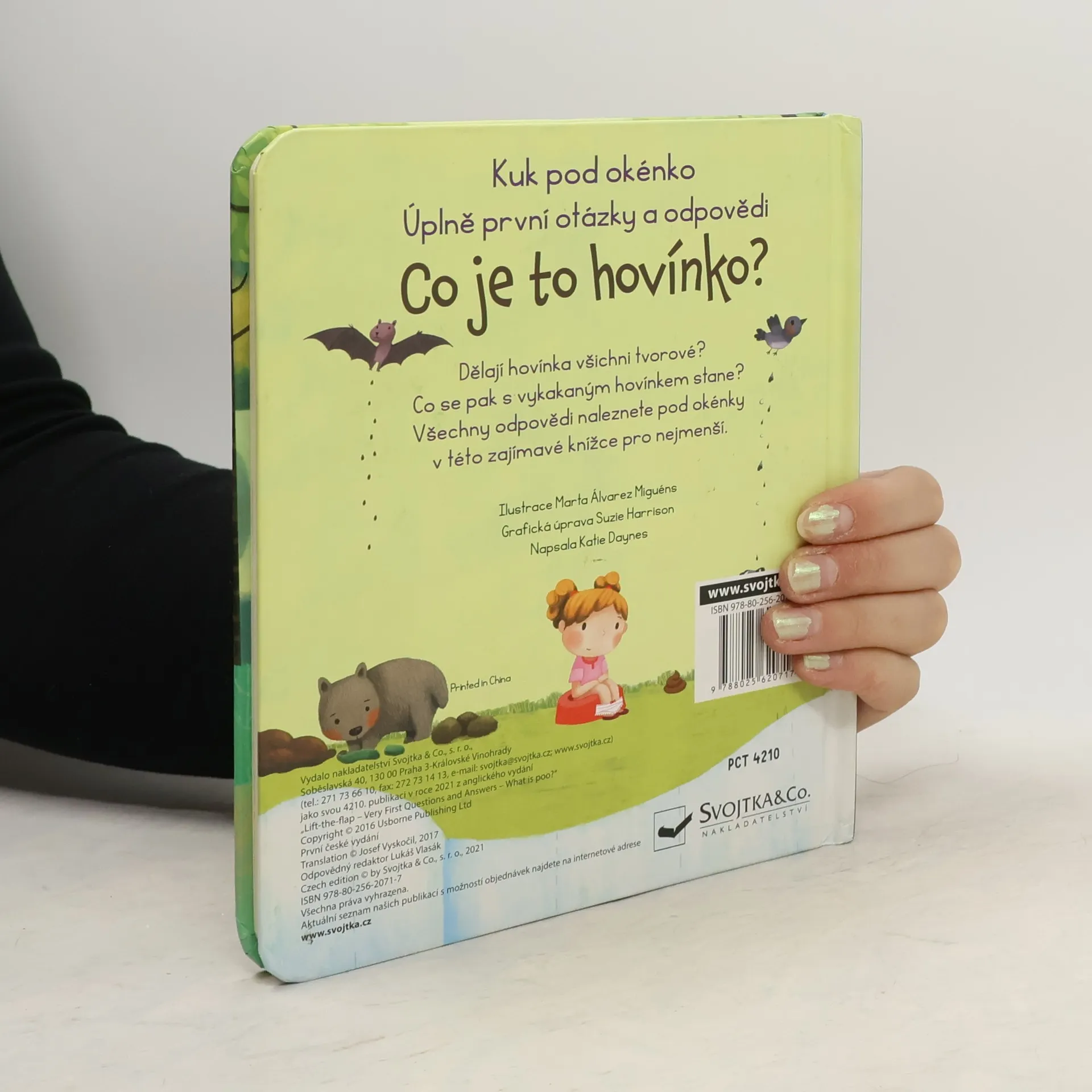Kakají všichni. Ale co se pak s vykakaným hovínkem stane? Odpovědi naleznete pod okénky v této knížce pro nejmenší. Hovínko se dělá do plíny, splachuje se do záchoda, zvířátka dělají svá hovínka venku... Ale co to vlastně hovínko je? Víš, že jsou brouci, kteří si dělají z hovínek kuličky, a že králík svoje bobky dokonce jí? Na všechny všetečné otázky dětí na téma "Co je to hovínko?" najdou bezradní rodiče odpovědi v této úžasné knížce s odklápěcími okénky.