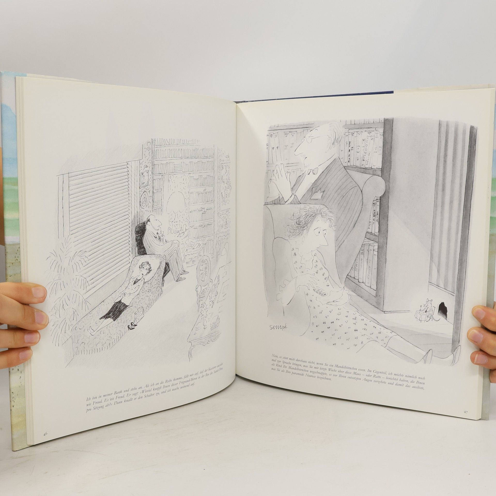 Sempés Bilder bieten mehr als nur Pointen; sie kombinieren oft Bild und Text, wobei die Bildunterschriften Geschichten erzählen. Seine liebevoll gestalteten Cartoon-Gemälde laden den Betrachter ein, in den vielen Details zu schwelgen.