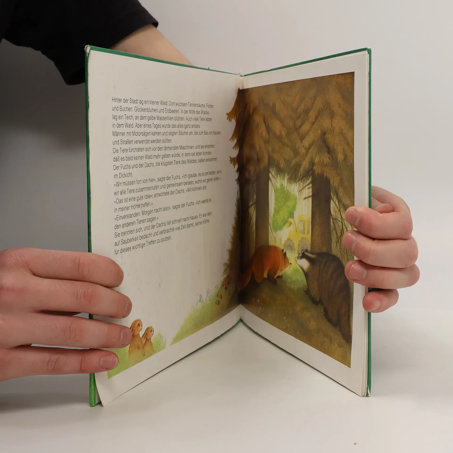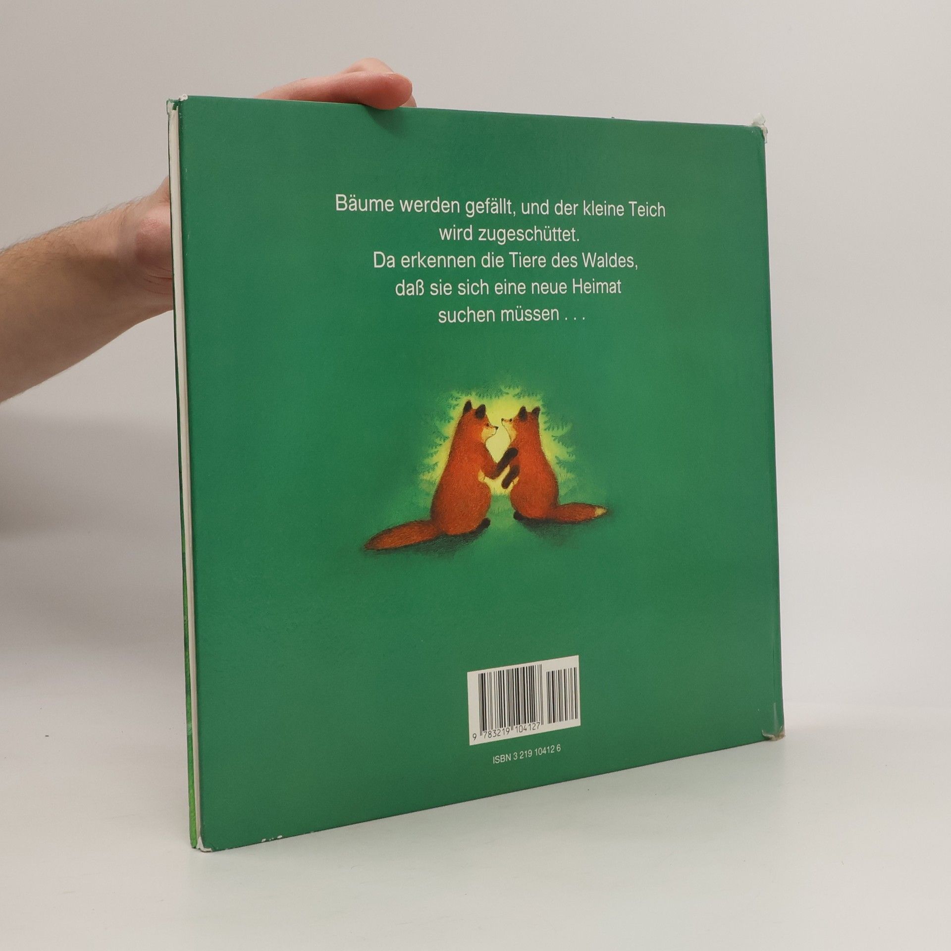 Ein kleiner Wald hinter der Stadt beherbergte Tannen, Fichten, Buchen, Blumen und einen Teich. Dort lebten viele Tiere. Doch eines Tages fällten Männer die Bäume und schütteten den Teich zu, sodass die Tiere eine neue Heimat suchen mussten.