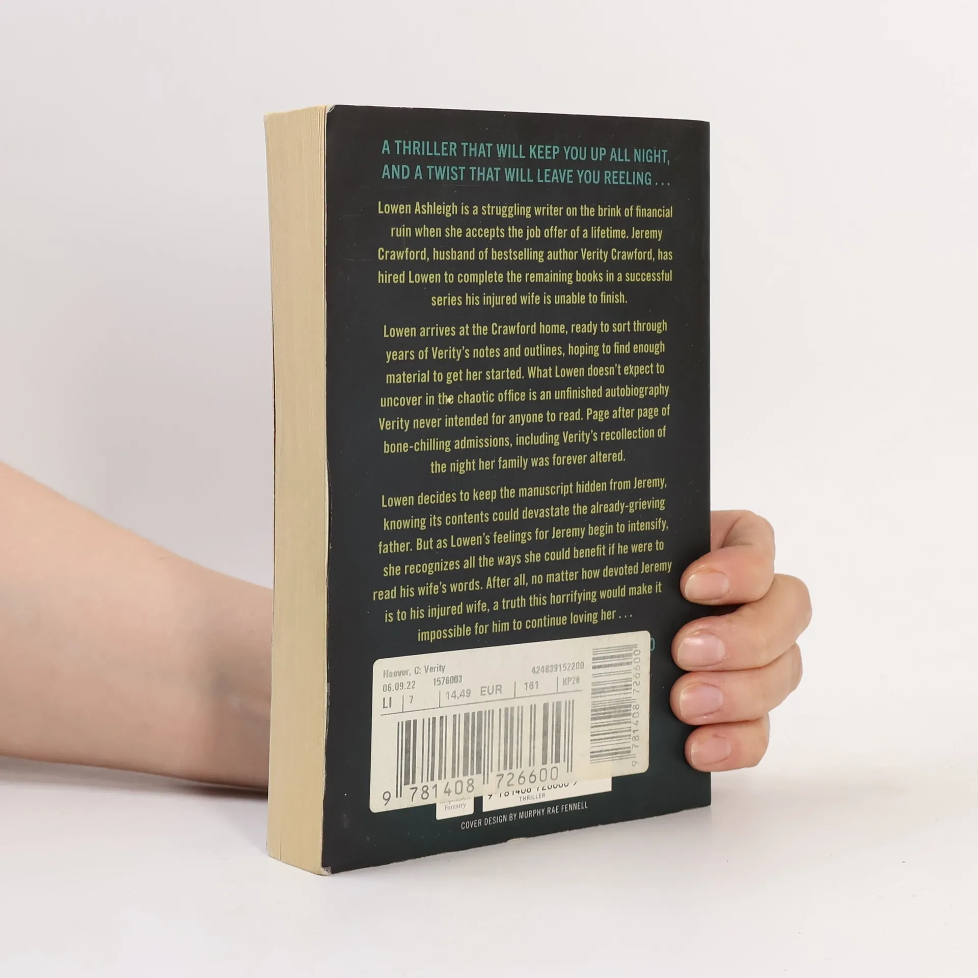 A thriller that will keep you up all night, and a twist that will leave you reeling... Lowen Ashleigh is a struggling writer on the brink of financial ruin when she accepts the job offer of a lifetime. Jeremy Crawford, husband of bestselling author Verity Crawford, has hired Lowen to complete the remaining books in a successful series his injured wife is unable to finish. Lowen arrives at the Crawford home, ready to sort through years of Verity's notes and outlines, hoping to find enough material to get her started. What Lowen doesn't expect to uncover in the chaotic office is an unfinished autobiography Verity never intended for anyone to read. Page after page of bone-chilling admissions, including Verity's recollection of the night their family was forever altered. Lowen decides to keep the manuscript hidden from Jeremy, knowing its contents would devastate the already-grieving father. But as Lowen's feelings for Jeremy begin to intensify, she recognizes all the ways she could benefit if he were to read his wife's words. After all, no matter how devoted Jeremy is to his injured wife, a truth this horrifying would make it impossible for him to continue loving her . . .
