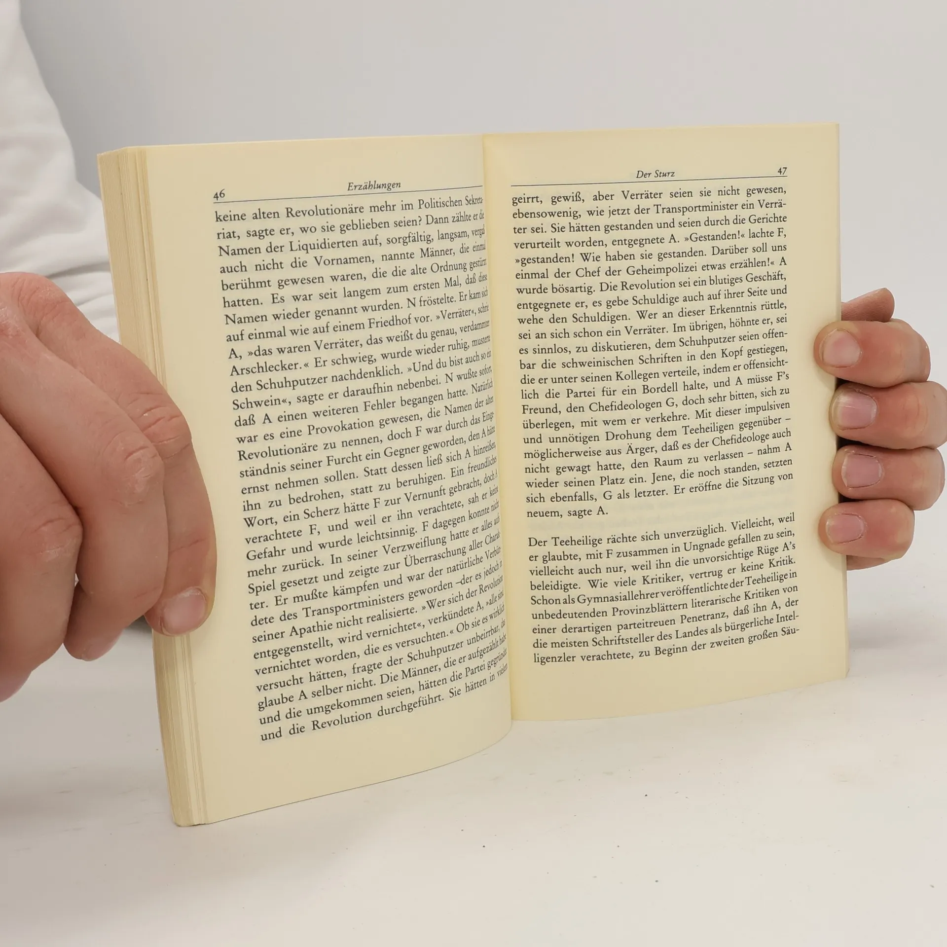 ›Der Sturz‹: »Bei der Sitzung eines politischen Sekretariats fehlt überraschend Atomminister O. Dies stürzt die übrigen Mitglieder des Kollektivs in Verwirrung, denn auf der Tagesordnung steht der Beschluß, das Sekretariat aufzulösen, und noch ist unklar, wer von der Neuordnung profitieren wird. Die Sekretariatsmitglieder argwöhnen, daß der Vorsitzende A die Macht an sich ziehen will, die Angst vor Liquidationen beherrscht die Runde, und O scheint das Opfer zu sein.«