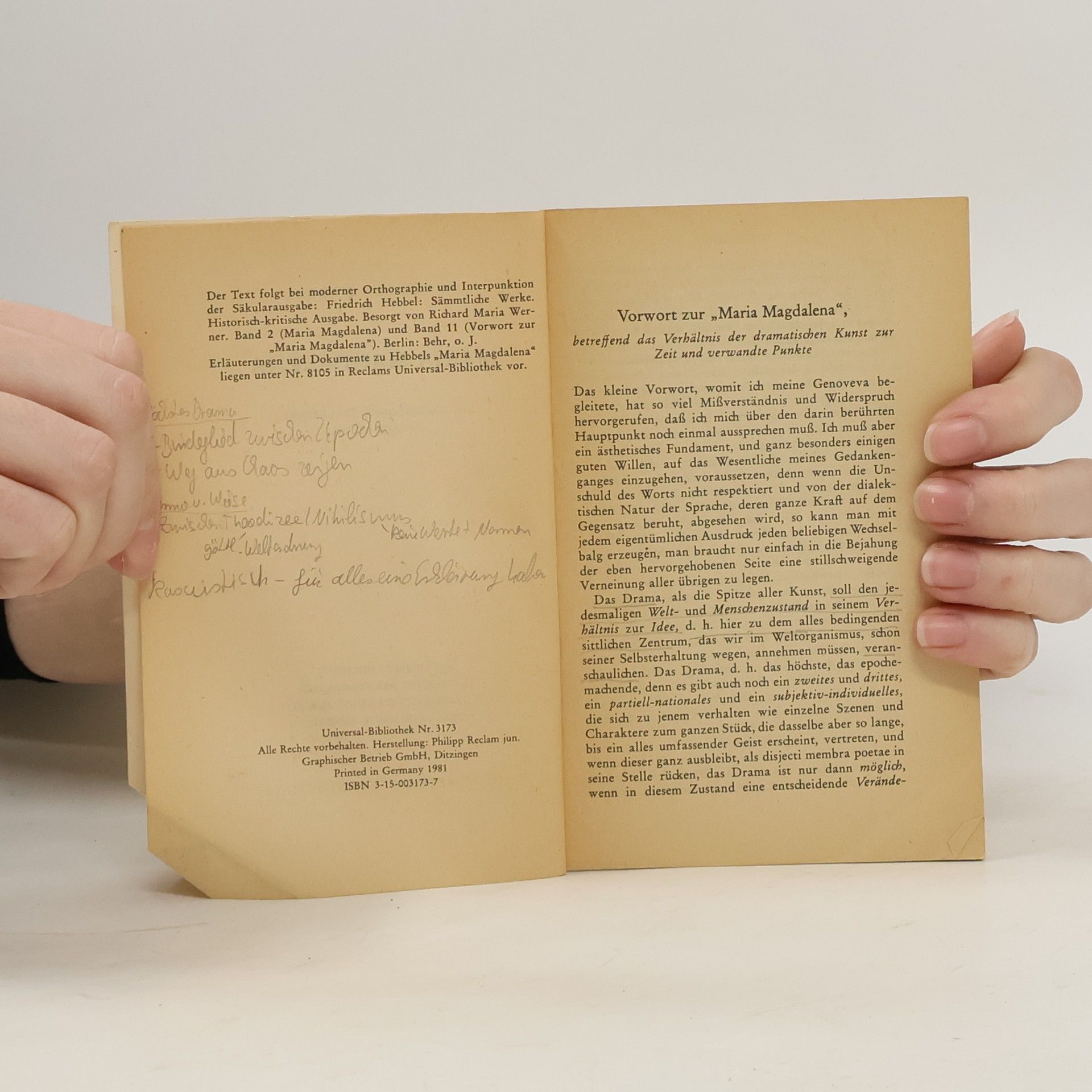 In einem Brief an Charlotte Rousseau schrieb Hebbel über sein Drama »Maria Magdalena«: „Ich denke nämlich nicht Theater- oder Lese-Futter zu liefern, sondern in einem einzigen großen Gedicht, dessen Held nicht mehr dieses oder jenes Individuum, sondern die Menschheit selbst ist und dessen Rahmen nicht einzelnen Anekdoten und Vorfälle, sondern die ganze Geschichte umschließt, den Grundstein zu einem ganz neuen, bis jetzt noch nicht dagewesenen Drama zu legen ...“ Mit Hebbels Vorwort, betreffend das Verhältnis der dramatischen Kunst zur Zeit und verwandte Punkte