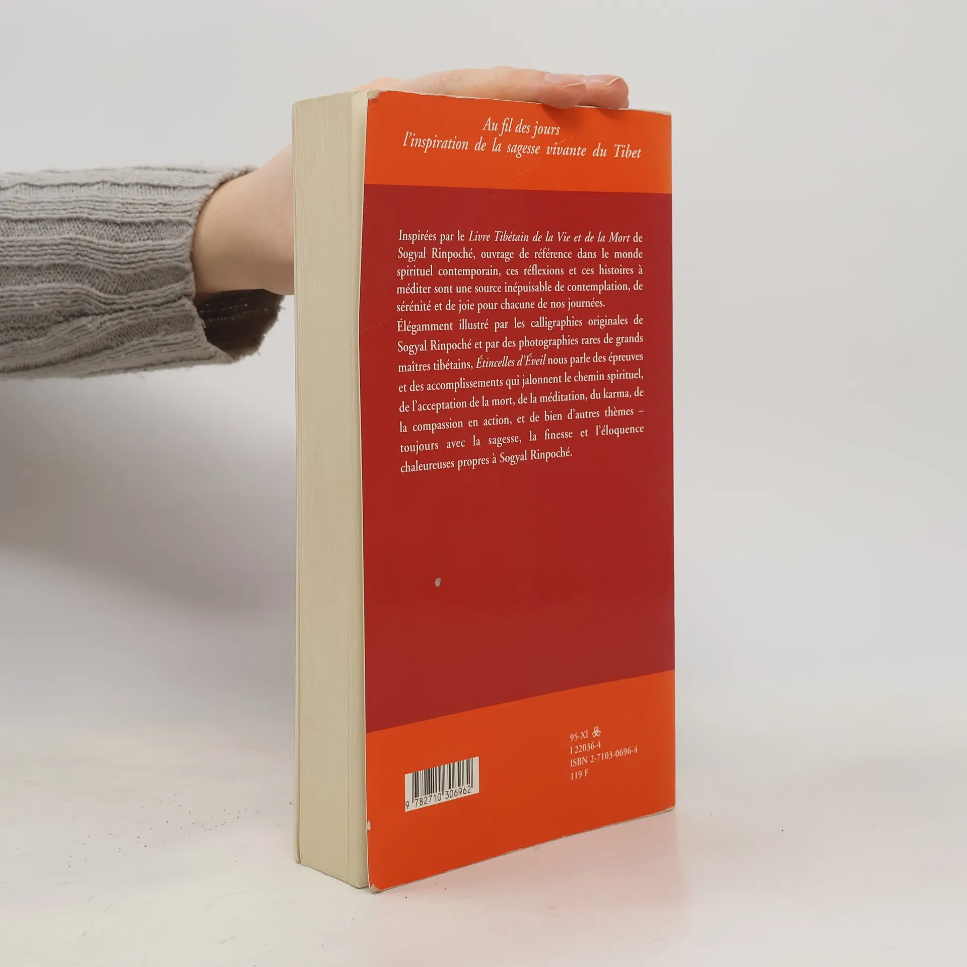 Inspirées par le Livre Tibétain de la Vie et de la Mort de Sogyal Rinpoché, ouvrage de référence dans le monde spirituel contemporain, ces réflexions et ces histoires à méditer sont une source inépuisable de contemplation, de sérénité et de joie pour chacune de nos journées. Elégamment illustré par les calligraphies originales de Sogyal Rinpoché et par des photographies rares de grands maîtres tibétains, Etincelles d'Eveil nous parle des épreuves et des accomplissements qui jalonnent le chemin spirituel, de l'acceptation de la mort, de la méditation, du karma, de la compassion en action, et de bien d'autres thèmes toujours avec la sagesse, la finesse et l'éloquence chaleureuses propres à Sogyal Rinpoché.