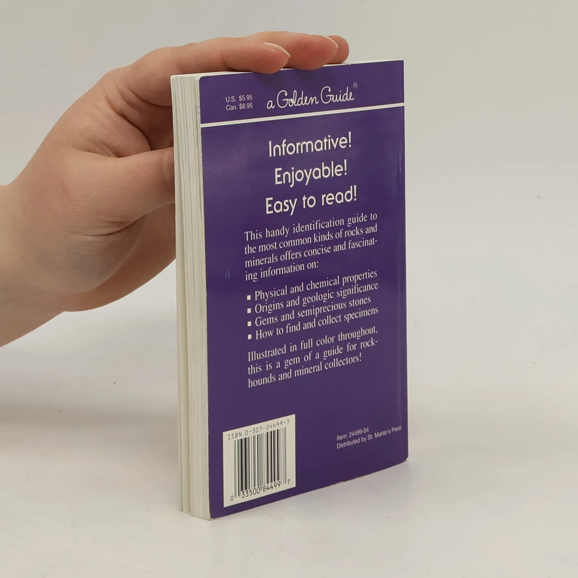 Includes information on collecting and identifying minerals, and sections on metallic, nonmetallic, gem and rock-forming minerals, and on igneous, sedimentary and metamorphic rocks.
