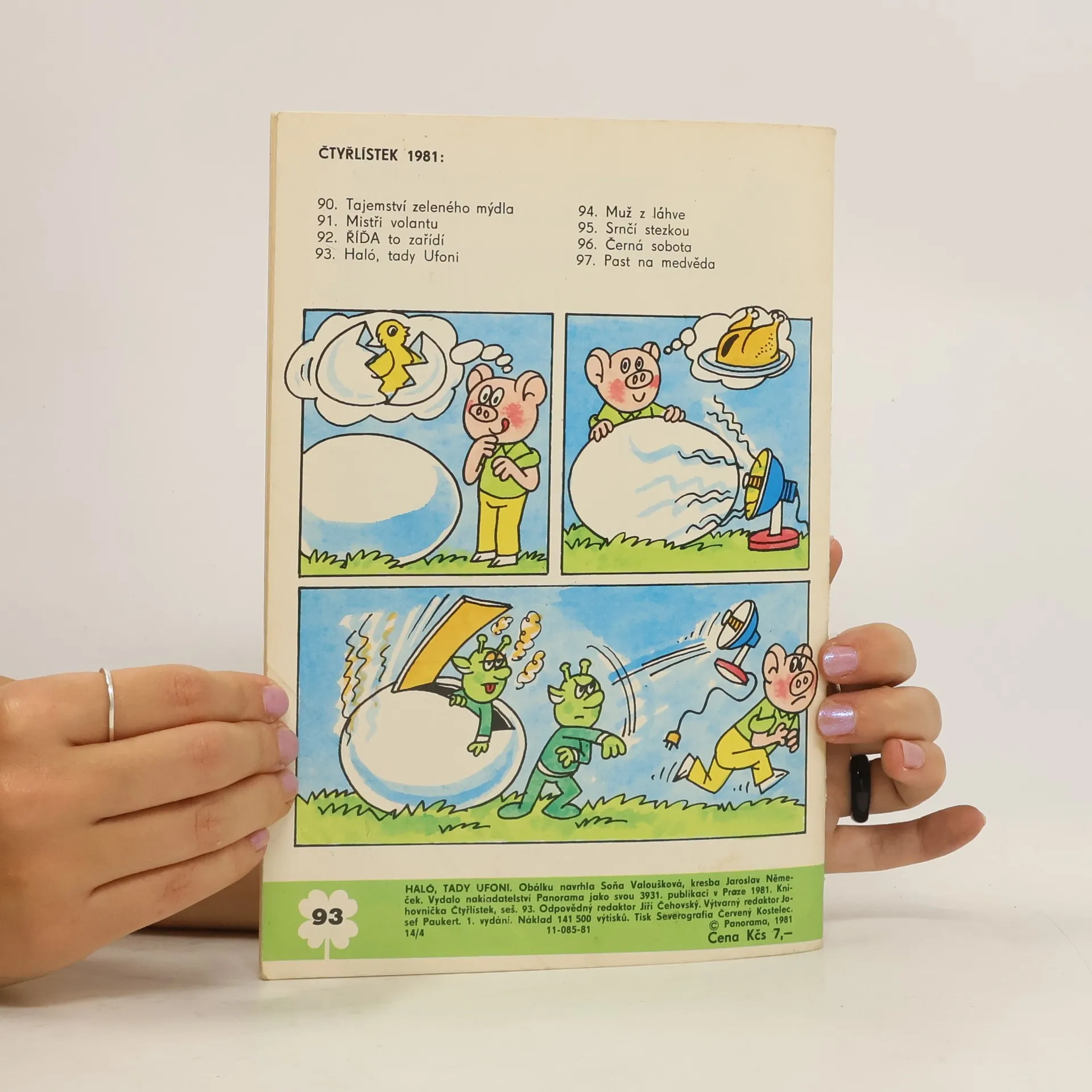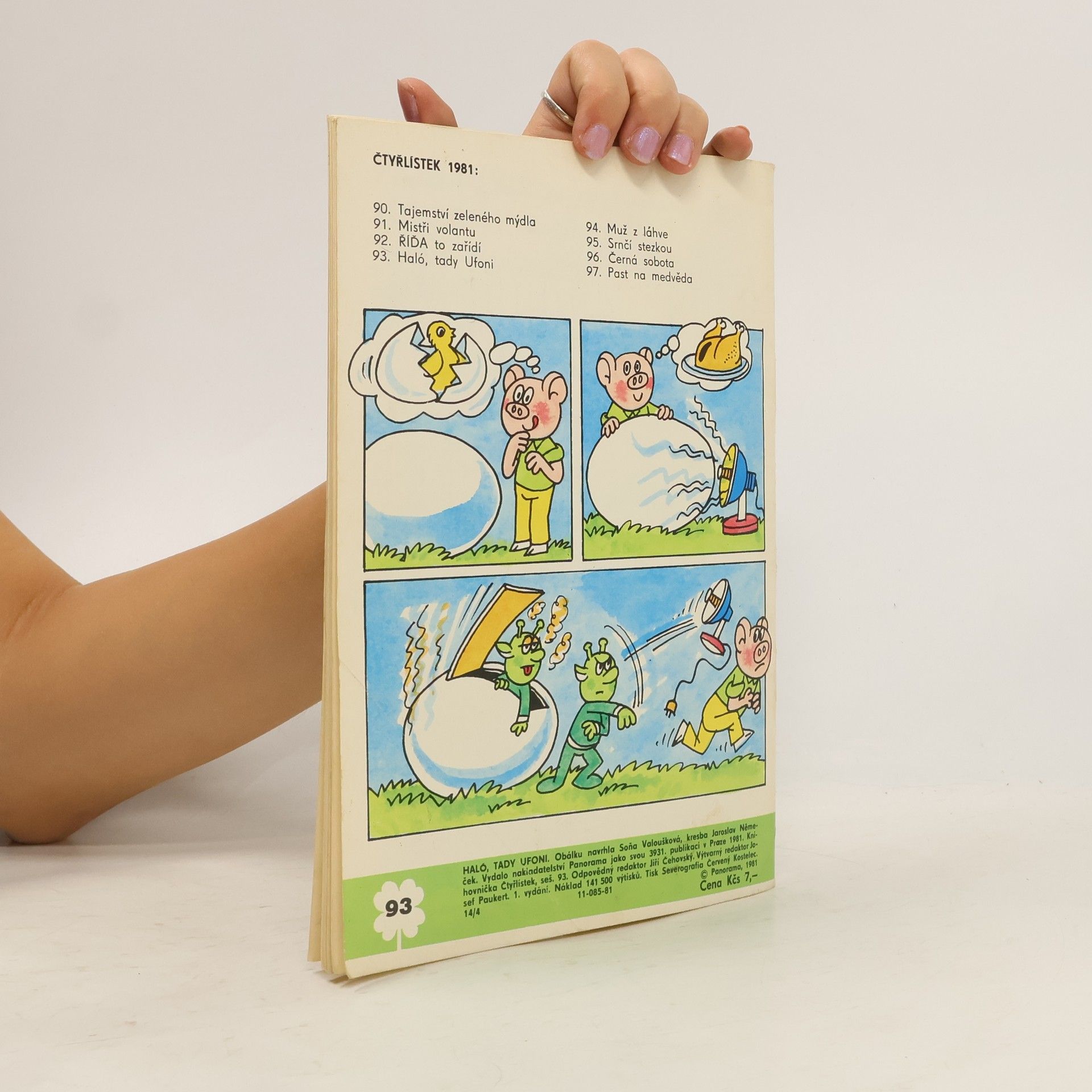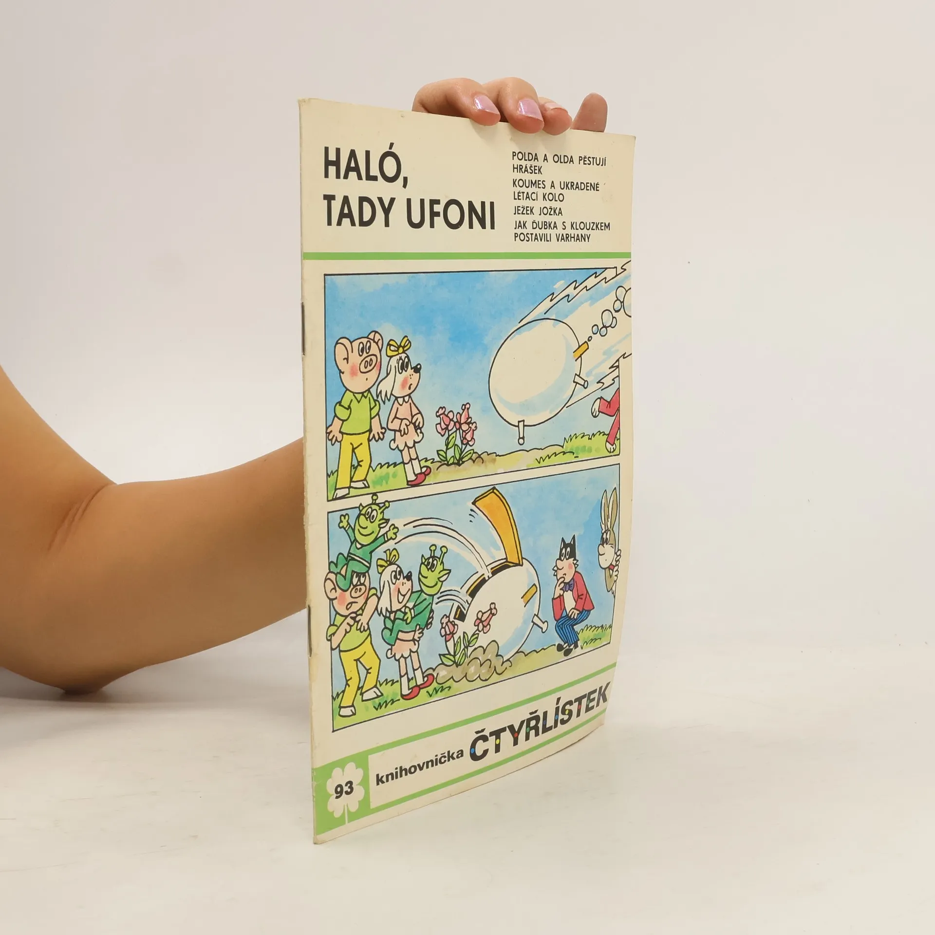 93. díl oblíbené série. Příběh Čtyřlístku Haló, tady ufoni - Ljuba Štíplová, Jaroslav Němeček. Dále Polda a Olda pěstují hrášek - Petr Chvojka, Jaroslav Malák, Koumes a ukradené létací kolo - Vladimír Kliman, Sylvie Vodáková . Ježek Jožka - Ladislav Čapek a Jak Ďubka s Klouzkem postavili varhany - Jaroslav Cita.