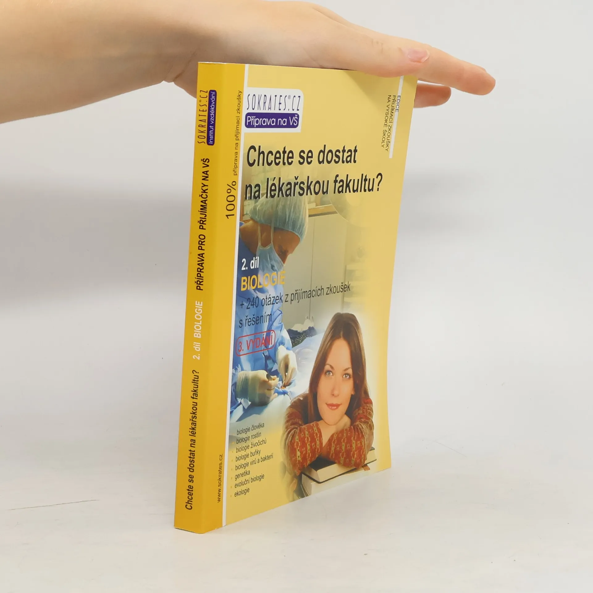 Kniha je jedinečnou pomůckou určenou uchazečům o studium na lékařských, veterinárních, farmaceutických, zdravotně sociálních, přírodovědeckých fakultách, fakultách zdravotnických studií a dalších fakultách, kde se skládají přijímací zkoušky z biologie. Obsahuje teoretické shrnutí problematiky +240 testových otázek z minulých přijímacích zkoušek s řešením, a to z biologie. Určeno: lékařské fakulty UK v Praze, Plzni a Hradci Králové, Lékařská fakulta MU v Brně, Lékařská fakulta a Fakulta zdravotnických studií UP v Olomouci, Lékařská fakulta v Ostravě, Veterinární a farmaceutická univerzita Brno, Farmaceutická fakulta v Hradci Králové, Přírodovědecká fakulta Univerzity Karlovy v Praze, Zdravotně sociální fakulta JČU v Českých Budějovicích, Fakulta zdravotnických studií ZČU v Plzni, Fakulta zdravotnických studií Univerzity Pardubice, Ústav zdravotnických studií UJEP v Ústí nad Labem, Ústav zdravotnických studií TUL a další vysoké školy. Publikaci je vhodné zkombinovat s vysvětlením problem