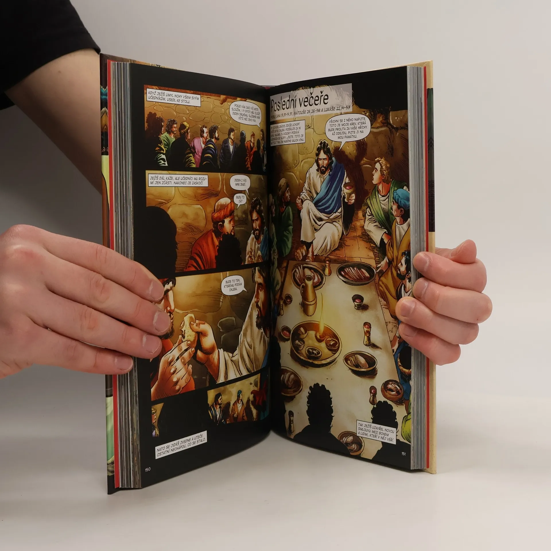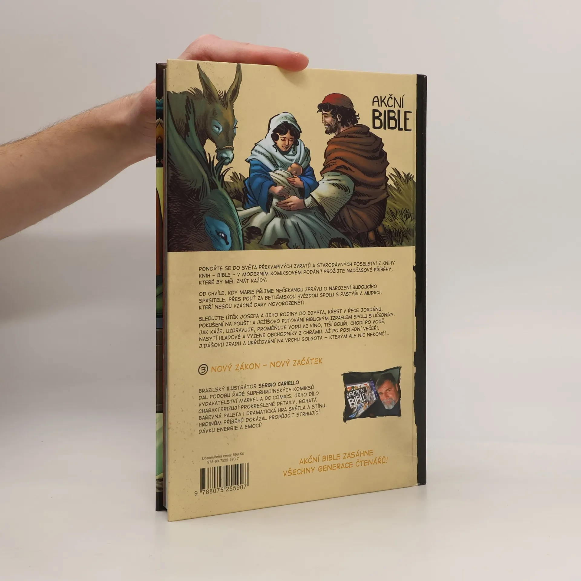 Ponořte se do světa překvapivých zvratů a starodávných poselství z knihy knih - Bible - v moderním komiksovém podání! Prožijte nadčasové příběhy, které by měl znát každý: Od chvíle, kdy Marie přijme nečekanou zprávu o narození budoucího Spasitele, přes pouť za Betlémskou hvězdou spolu s pastýři a mudrci, kteří nesou vzácné dary novorozeněti. Sledujte útěk Josefa a jeho rodiny do Egypta, křest v řece Jordánu, pokušení na poušti a Ježíšovo putování biblickým Izraelem spolu s učedníky. Jak káže, uzdravuje, proměňuje vodu ve víno, tiší bouři, chodí po vodě, nasytí hladové a vyžene obchodníky z chrámu. Až po poslední večeři, Jidášovu zradu a ukřižování na vrchu Golgota - kterým ale nic nekončí… Brazilský ilustrátor Sergio Cariello dal podobu řadě superhrdinských komiksů vydavatelství Marvel a DC Comics. Jeho dílo charakterizují prokreslené detaily, bohatá barevná paleta i dramatická hra světla a stínu. Hrdinům příběhů dokázal propůjčit strhující dávku energie a emocí!