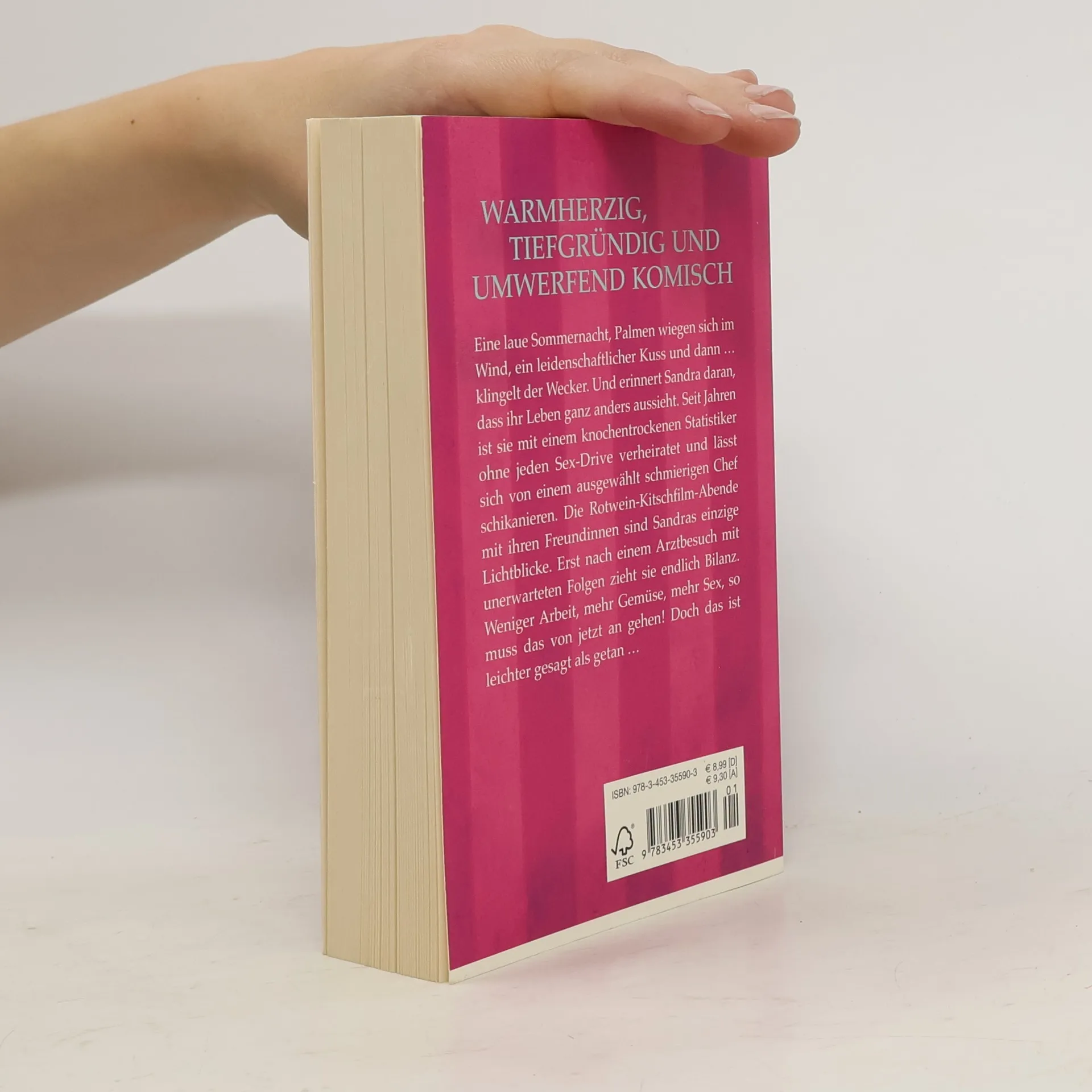 WARMHERZIG, TIEFGRÜNDIG UND DABEI UMWERFEND KOMISCHEine laue Sommernacht, Palmen wiegen sich im Wind, Thomas und Sandra versinken in einem leidenschaftlichen Kuss, und dann … klingelt der Wecker. Und erinnert Sandra daran, dass ihr Leben leider ganz anders aussieht. Seit zehn Jahren ist sie mit einem knochentrockenen Statistiker ohne jeden Sex-Drive verheiratet und lässt sich von einem ausgewählt schmierigen Chef schikanieren. Die Rotwein-Kitschfilm-Abende mit ihren drei Freundinnen sind Sandras einzige Lichtblicke. Erst nach einem Arztbesuch mit unerwarteten Folgen zieht sie endlich Bilanz. Weniger Arbeit, mehr Gemüse, mehr Sex — so muss das ab jetzt gehen! Doch das ist leichter gesagt als getan …