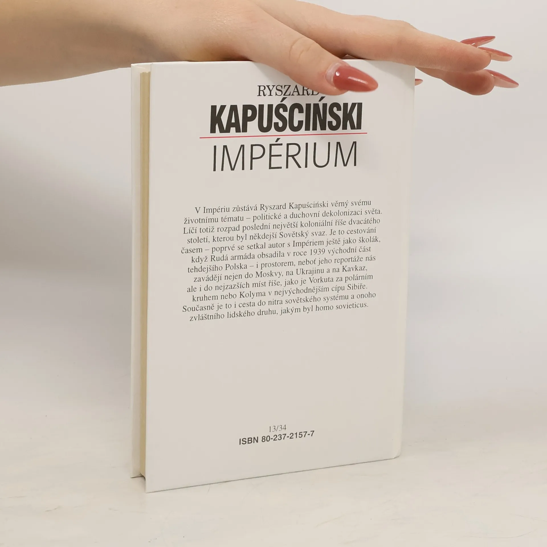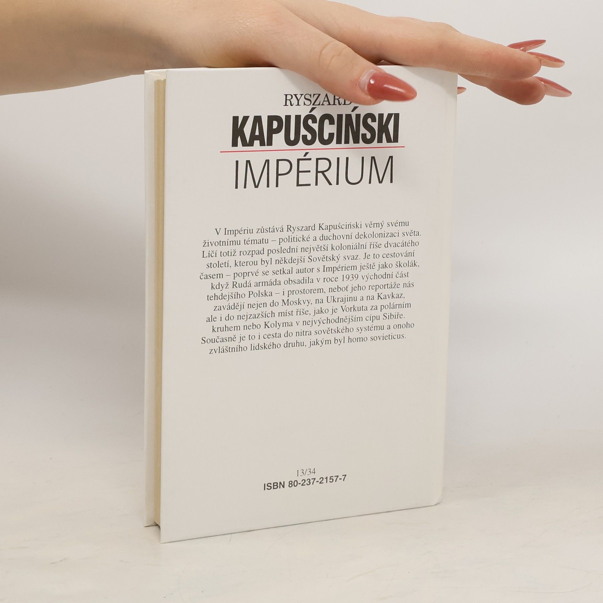 V Impériu zůstává Ryszard Kapuściński věrný svému životnímu tématu – politické a duchovní dekolonizaci světa. Líčí totiž rozpad poslední největší koloniální říše dvacátého století, kterou byl někdejší Sovětský svaz. Je to cestování časem – poprvé se setkal autor s Impériem ještě jako školák, když Rudá armáda obsadila v roce 1939 východní část tehdejšího Polska – i prostorem, neboť jeho reportáže nás zavádějí nejen do Moskvy, na Ukrajinu a na Kavkaz, ale i do nejzazších míst říše, jako je Vorkuta za polárním kruhem nebo Kolyma v nejvýchodnějším cípu Sibiře. Současně je to i cesta do nitra sovětského systému a onoho zvláštního lidského druhu, jakým byl homo sovieticus.
