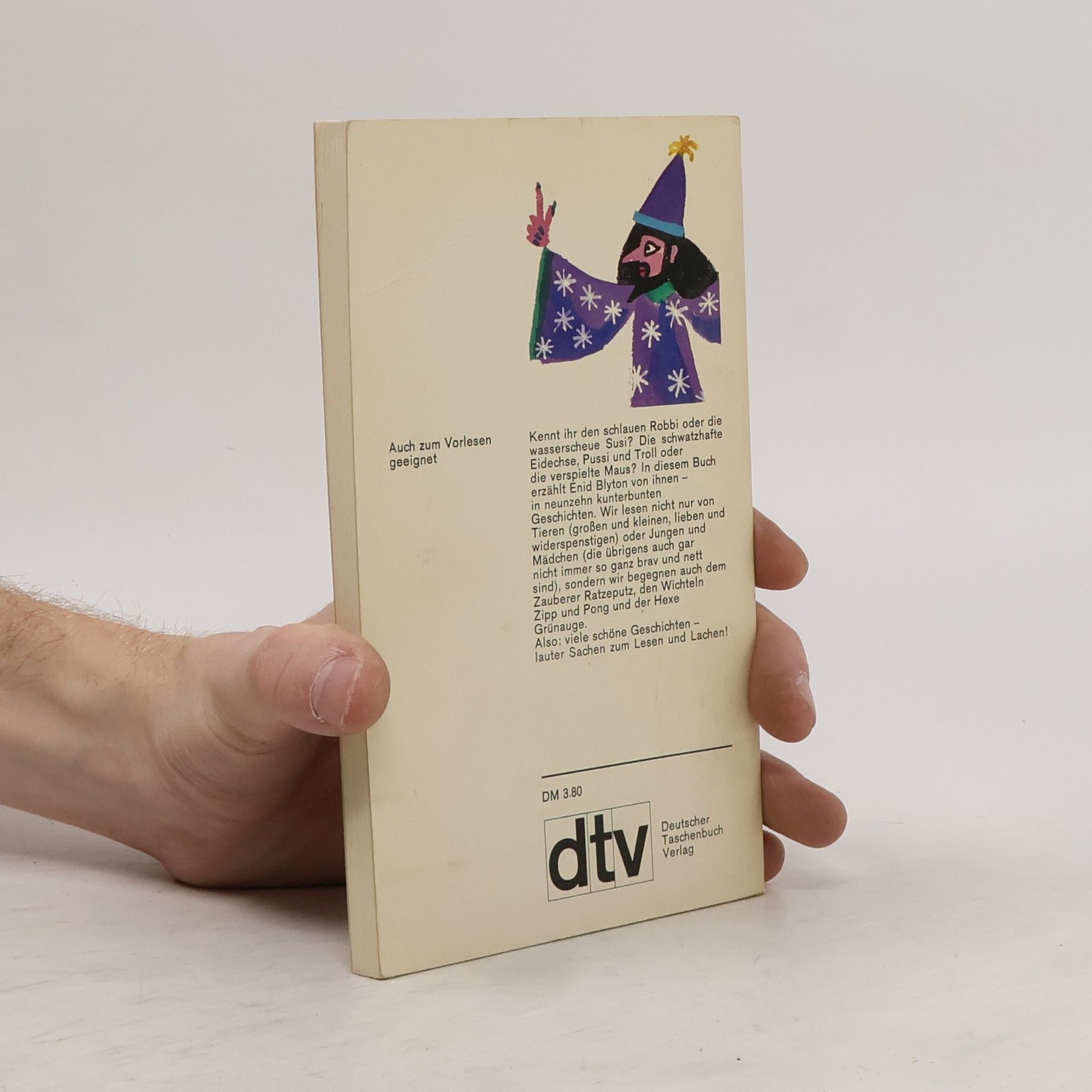 Kennt ihr den schlauen Robbi oder die wasserscheue Susi? Die schwatzhafte Eidechse, Pussi und Troll oder die verspielte Maus?In diesem Buch erzählt Enyd Blyton von ihnen - in neunzehn kunterbunten Geschichten.Wir lesen nicht nur von den Tieren (großen und kleinen, lieben und widerspenstigen) oder Jungen und Mädchen (die übrigends auch gar nicht immer so ganz brav und nett sind), sondern wir begegnem auch dem Zauberer Ratzeputz, den Wichteln Zipp und Pong und der Hexe Grünauge.Also: viele schöne Geschichten - lauter Sachen zum Lesen und Lachen!