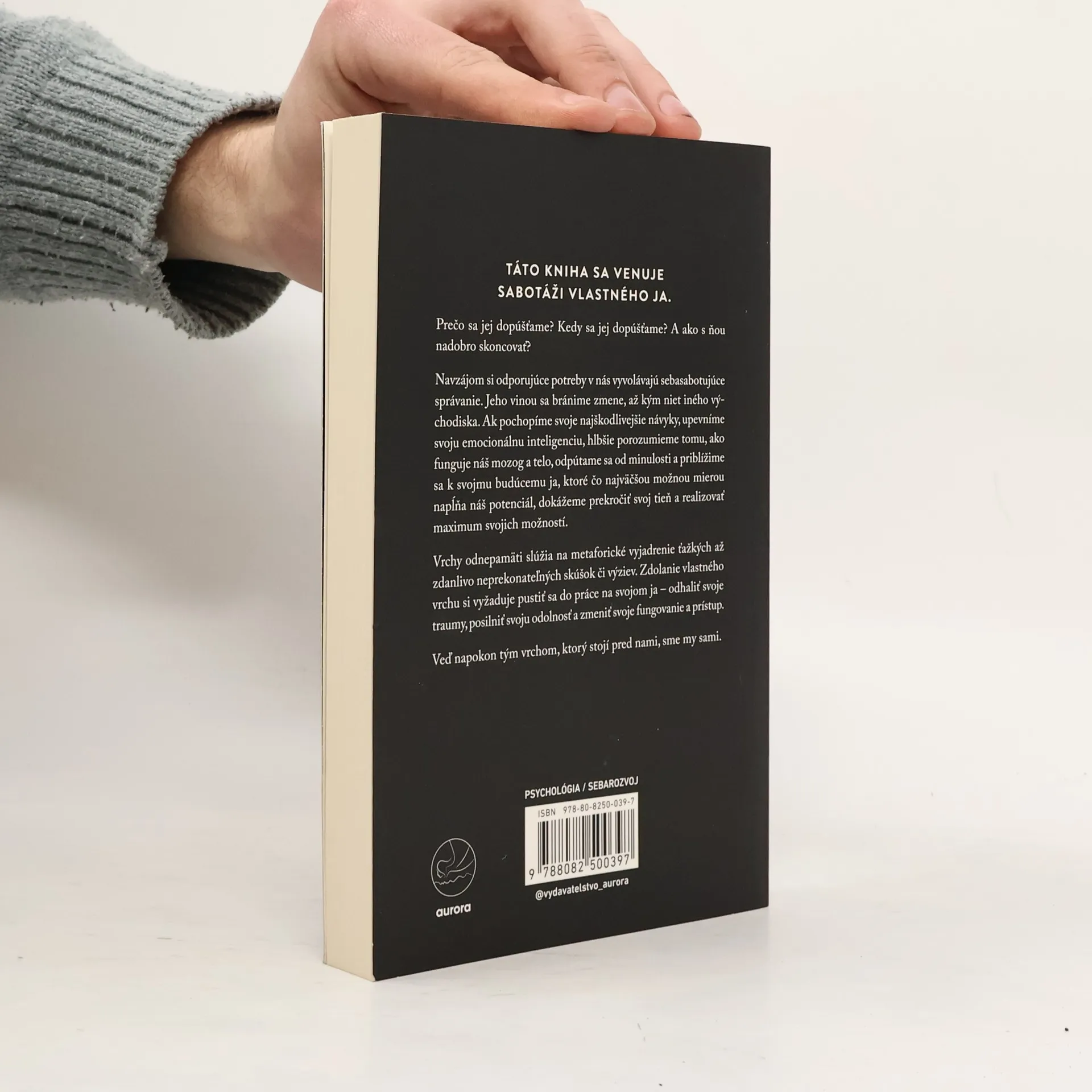Prečo sa jej dopúšťame? Kedy sa jej dopúšťame? A ako s ňou nadobro skoncovať? Navzájom si odporujúce potreby v nás vyvolávajú sebasabotujúce správanie. Jeho vinou sa bránime zmene, až kým niet iného východiska. Ak pochopíme svoje najškodlivejšie návyky, upevníme svoju emocionálnu inteligenciu, hlbšie porozumieme tomu, ako funguje náš mozog a telo, odpútame sa od minulosti a priblížime sa k svojmu budúcemu ja, ktoré čo najväčšou možnou mierou napĺňa náš potenciál, dokážeme prekročiť svoj tieň a realizovať maximum svojich možností.Vrchy odnepamäti slúžia na metaforické vyjadrenie ťažkých až zdanlivo neprekonateľných skúšok či výziev. Zdolanie vlastného vrchu si vyžaduje pustiť sa do práce na svojom ja – odhaliť svoje traumy, posilniť svoju odolnosť a zmeniť svoje fungovanie a prístup. Veď napokon tým vrchom, ktorý stojí pred nami, sme my sami.