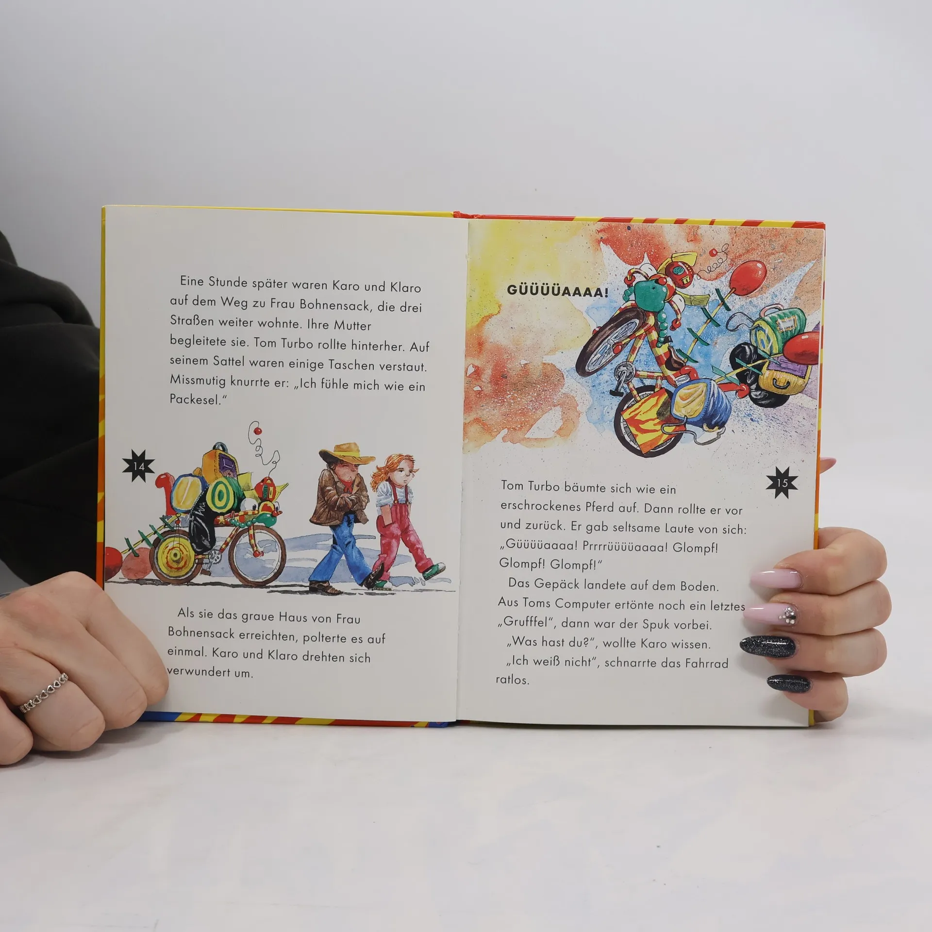 Eine grüne Mülltonne in Frau Bohnensacks Küche kann Abfälle ins Nichts auflösen und begeistert Karo, Klaro und Tom. Doch etwas stimmt nicht: Früher war alles grau und nach Sauerkraut, jetzt ist alles bunt und Frau Bohnensack sieht aus wie eine rosa Wolke.