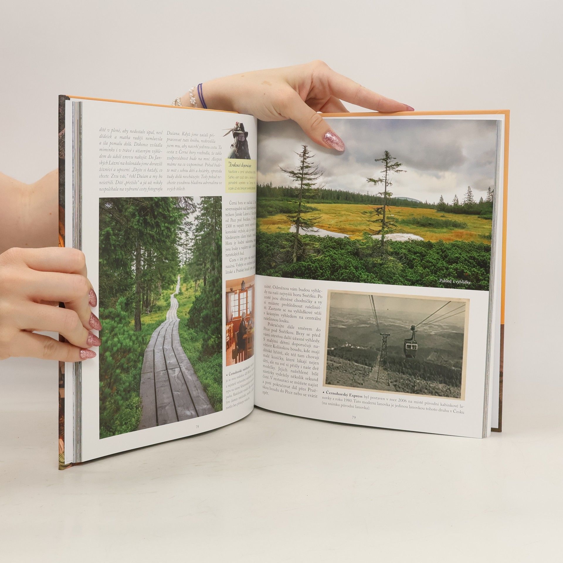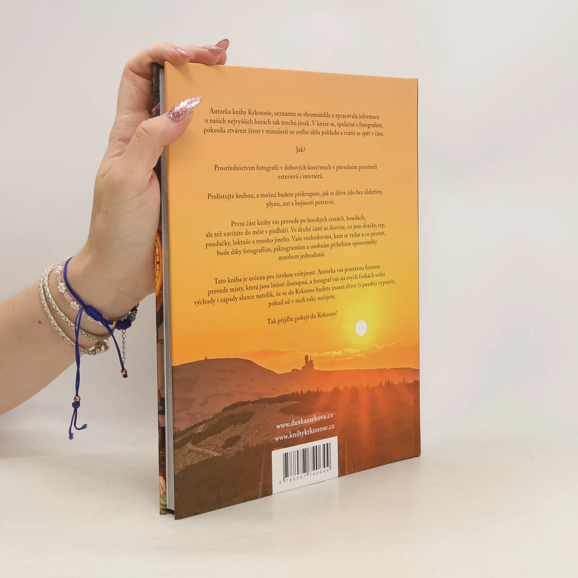 Autorka knihy Krkonoše, seznamte se! shromáždila a zpracovala informace o našich nejvyšších horách tak trochu jinak. V knize se, společně s fotografem, pokusila ztvárnit život v minulosti ze svého úhlu pohledu a vrátit se zpět v čase.Jak?Prostřednictvím fotografií v dobových kostýmech v původním prostředí exteriérů i interiérů.Prolistujte knihou, a možná budete překvapeni, jak se dříve žilo bez elektřiny, plynu, aut a hojnosti potravin.První část knihy vás provede po horských cestách, boudách, ale též zavítáte do měst v podhůří. Ve druhé části se dozvíte, co jsou dračky, srp, poudačky, loktuše a mnoho jiného. Vaše rozhodování, kam se vydat a co poznat, bude díky fotografiím, piktogramům a osobním příběhům autorky mnohem jednodušší.Tato kniha je určena pro širokou veřejnost. Autorka vás poutavou formou provede do míst, která jsou běžně dostupná, a fotograf vás na svých fotkách oslní východy i západy slunce natolik, že se do Krkonoš budete muset dříve či později vypravit, pokud už v nich roky nežijete.Tak přijďte pobejt do Krkonoš!