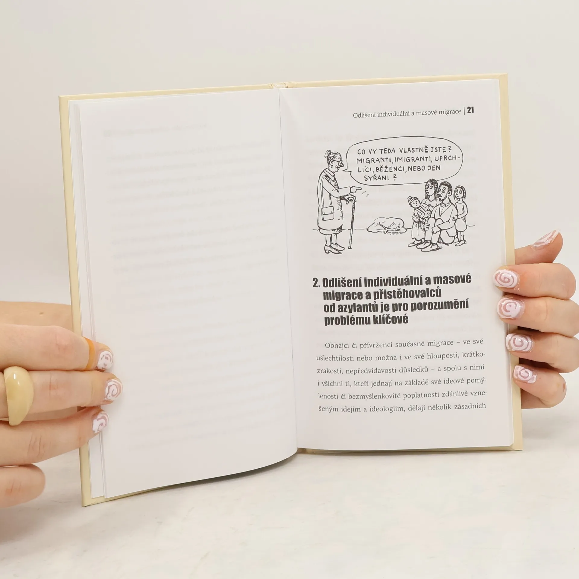 Stručný manuál k pochopení současné migrační krize Vlna ilegálního masového přistěhovalectví do zemí Evropské unie se dotýká životů stovek miliónů Evropanů. Protože to považujeme za mimořádně vážné, věnujeme tomuto nesmírně výbušnému problému tuto knížku, napsanou s nutnou mírou stručnosti a přehlednosti. Jejím primárním cílem je polemizovat se všudypřítomnou „prouprchlickou“ propagandou. Zdrželi jsme se příliš zevrubných odboček, které by text neúměrně zatížily, ale pro přidání potřebné zkratky a nadsázky jsme do ní zařadili i výstižné grafiky Jiřího Slívy. Jeho kresby ale nejsou pokusem o zlehčení vážné problematiky, nýbrž originálním komentářem atmosféry, ve které debata (nebo spíše nedebata) o migrační krizi probíhá. Jsme si vědomi, že žijeme uprostřed dějů, které mají obrovskou dynamiku. Neznáme a nemůžeme přesně znát cesty, kterými se budou dále vyvíjet. Považujeme však za svou povinnost přispět k lepší orientaci v hluku dnešní propagandy.