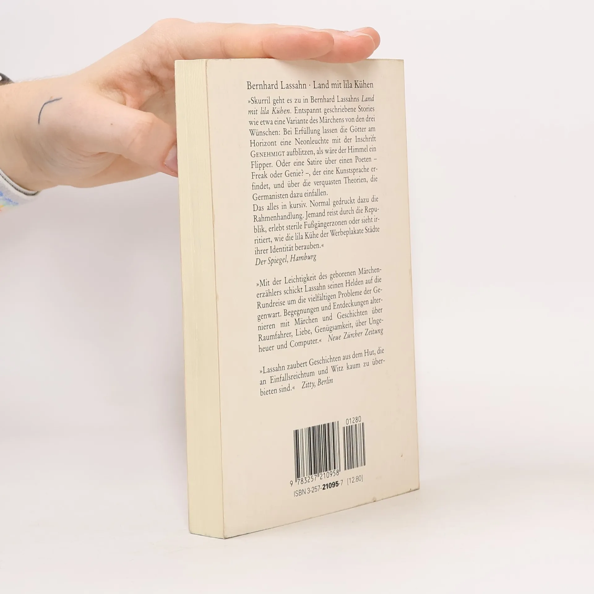 Bei einer empfindsamen Reise durch ein zerrissenes Land erleben wir ein Feuerwerk von Geistesblitzen und verbluffende Beobachtungen, die das Absurde im Alltaglichen aufflackern lassen. Dazu werden fantastische Geschichten erzahlt, als wurden zwischendurch zur Unterhaltung des verwohnten Publikums Sex- und Actionfilme eingeblendet, die von Betrugern und Falschern handeln, von einem unentschlossenen Verrater und dem Zwischenhandel fur Kusse. Es geht hoch her: Zwei Computer versuchen, sich gegenseitig umbringen, ein Liebhaber baut sich eine ideale Frau aus verschiedenen Einzelteilen zusammen, die brutalen Gummistiefel-Morder wunschen sich die Zeit zuruck, in der die alten Werte noch etwas galten. Durch die eigenwillige Mischung aus milder Melancholie und trotzigem Humor hatte das Buch immer einen gewissen Auenseiterrang. Es hatte spezielle Freunde gefunden unter Jugendlichen jeden Alters, sowohl in der alternativen Szene als auch bei denen, die immer schon anders waren als die anderen. Nun ist das "Kultbuch der sanften Rebellen," wie es damals genannt wurde, wieder da - angereichert mit Illustrationen von Uli Gleis. Thommie Bayer dazu: "Aus den weit uber tausend Buchern, die ich seither gelesen habe, leuchtet 'Land mit lila Kuhen' immer noch heraus. Es ist immer noch eins meiner Lieblingsbucher."