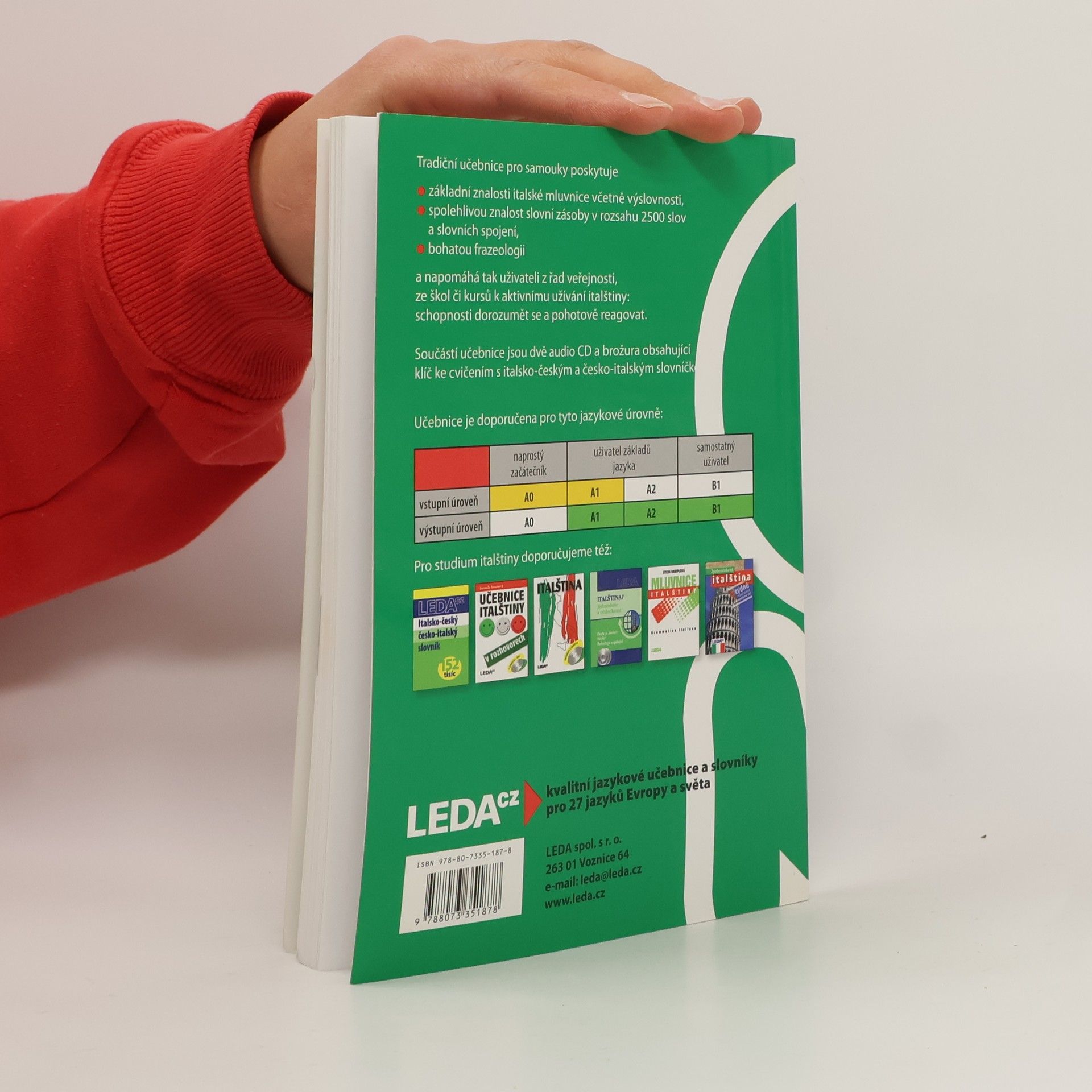 Oblíbená učebnice pro samouky obsahuje italskou mluvnici, slovní zásobu v rozsahu asi 2500 slov, frazeologii a výslovnost. Důraz je kladen na aktivní užívání italštiny, schopnost dorozumět se a pohotově reagovat v nejčastějších situacích. Každou lekci uzavírají kvizy, které mají vzbudit zájem uživatele o kulturu Itálie. Učebnice je určena také pro kursy a školy. Její součástí je klíč ke cvičením s italsko-českým a česko-italským slovníčkem v samostatné brožuře a nahrávka vybraných textů na dvou audio CD.