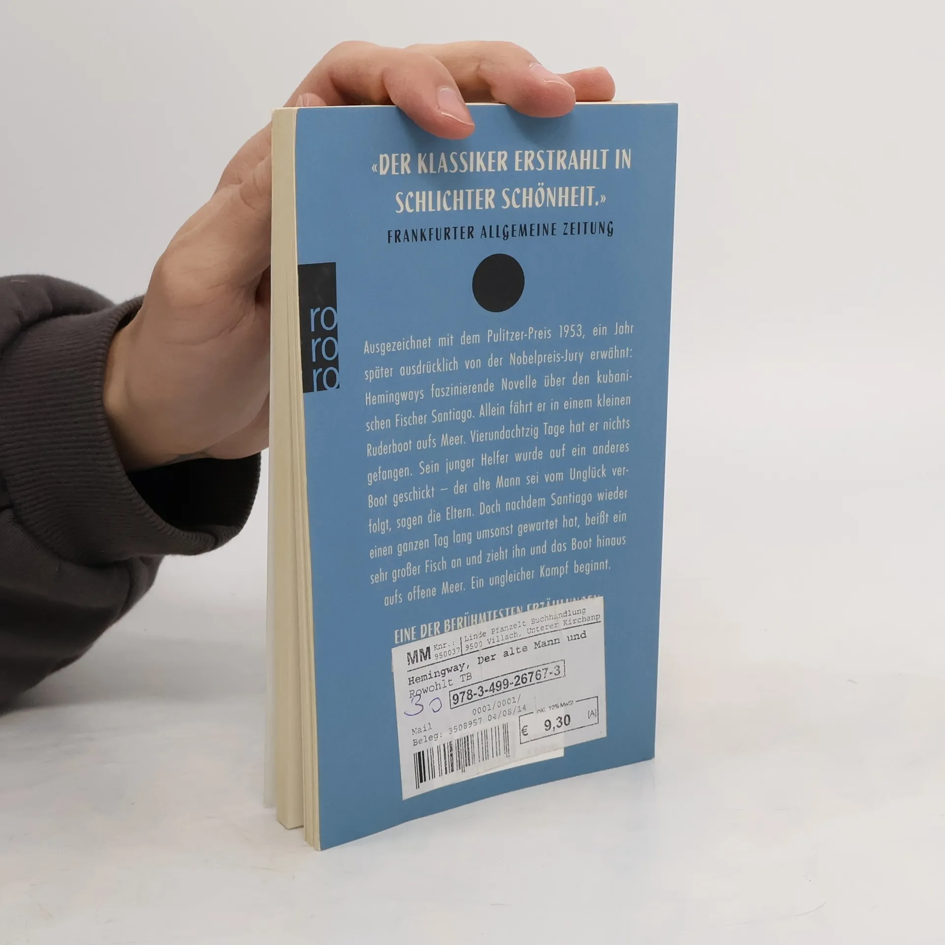 Ausgezeichnet mit dem Pulitzer-Preis 1953, ein Jahr später ausdrücklich von der Nobelpreis-Jury erwähnt: Hemingways faszinierende Novelle über den kubanischen Fischer Santiago. Allein fährt der in einem kleinen Ruderboot aufs Meer. Vierundachtzig Tage hat er nichts gefangen. Sein junger Helfer wurde auf ein anderes Boot geschickt – der alte Mann sei vom Unglück verfolgt, sagen die Eltern. Doch nachdem Santiago wieder einen ganzen Tag lang umsonst gewartet hat, beißt ein sehr großer Fisch an und zieht ihn und das Boot hinaus aufs offene Meer. Ein ungleicher Kampf beginnt. Eine der berühmtesten Erzählungen der modernen Weltliteratur in neuer Übersetzung.
