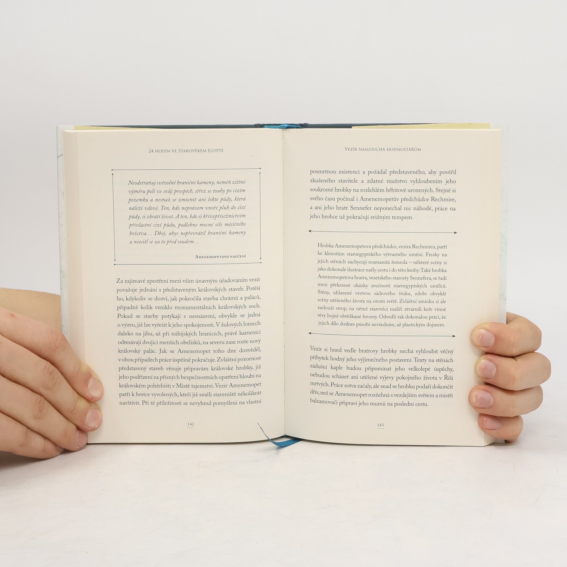 Během jednoho dne ve starověkém městě Théby, dnešním Luxoru, prožijeme příběhy 24 lidí různých společenských vrstev – od krále po pekaře, od kněžky po rybáře, od vojáka po porodní asistentku – abychom poznali, jaký byl život a běžný den v této dávné civilizaci. Archeolog Donald P. Ryan vytvořil na základě skutečných nálezů a egyptologických poznatků nečekaně živý a zábavný portrét starověkého Egypta očima jeho obyvatel. Příběh se odvíjí minutu za minutou a hodinu za hodinou a budete jej číst jedním dechem.