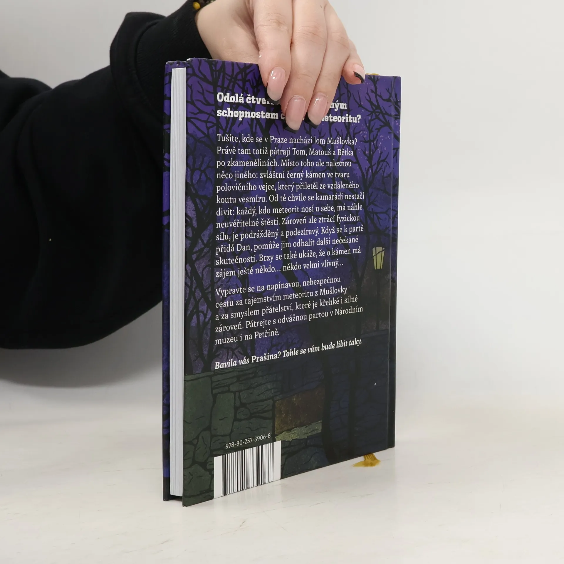 Tušíte, kde se v Praze nachází lom Mušlovka? Právě tam totiž pátrají Tom, Matouš a Bětka po zkamenělinách. Kdyby tak našli dinosauří kost! To by byl objev! Místo toho ale naleznou něco jiného. Zvláštní černý kámen ve tvaru vejce, který přiletěl ze vzdáleného kouta vesmíru. Od té chvíle se kamarádi nestačí divit: každý, kdo ho nosí u sebe, má náhle neuvěřitelné štěstí. Už žádné čekání na autobus nebo tramvaj, všechno jede jako na zavolanou. Žádné špatné známky, s kamenem děti při zkoušení ve škole vypočítají i ty nejsložitější příklady. Jenže všechno je za něco. Ten, kdo má kámen u sebe, ztrácí fyzickou sílu, a navíc podezírá všechny kolem, že mu zázračný meteorit chtějí ukrást. Když se do party připojí Dan, počítačový nerd, od svých kontaktů na internetu zjistí, že o kámen má zájem ještě někdo… někdo velmi vlivný… Vypravte se na napínavou, nebezpečnou cestu za tajemstvím meteoritu z Mušlovky a za smyslem přátelství, které je křehké i silné zároveň. Pátrejte s odvážnou čtveřicí v Národním muzeu i na Petříně. Bavila vás Prašina? Tohle se vám bude líbit taky.