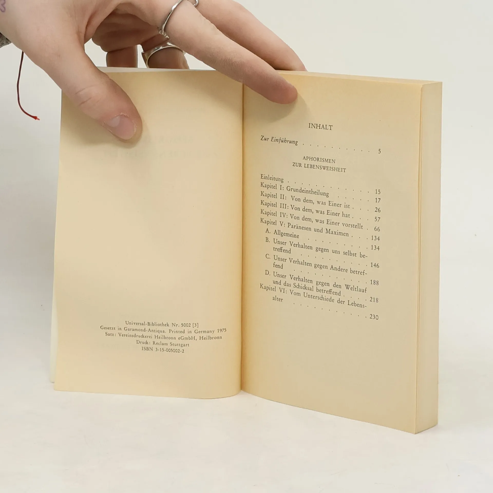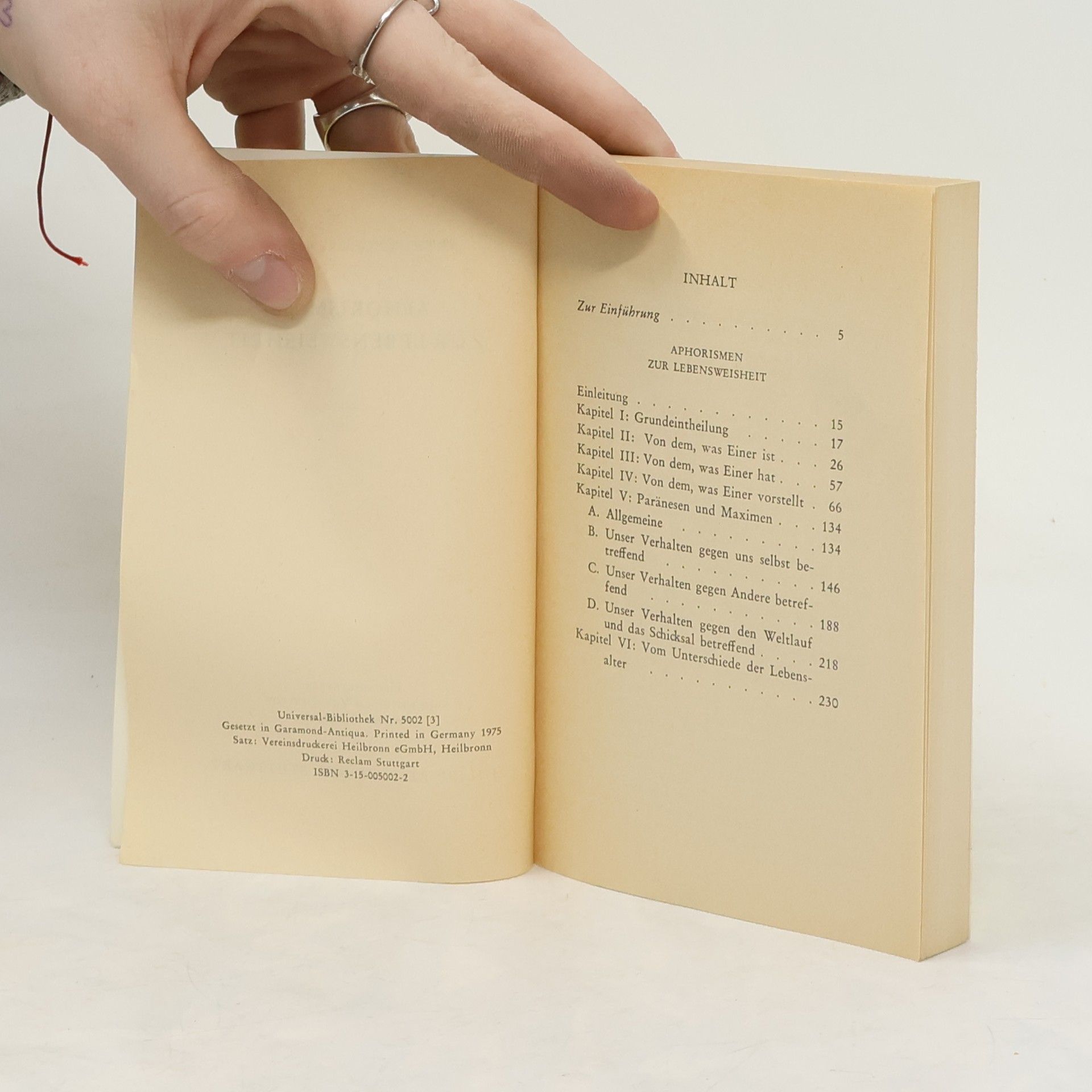 InhaltsverzeichnisZur Einführung Aphorismen zur Lebensweisheit Einleitung Kapitel I. Grundeintheilung Kapitel II. Von Dem, was Einer ist Kapitel III. Von Dem, was Einer hat Kapitel IV. Von Dem, was Einer vorstellt Kapitel V. Paränesen und Maximen A. Allgemeine B. Unser Verhalten gegen uns selbst betreffend C. Unser Verhalten gegen Andere betreffend D. Unser Verhalten gegen den Weltlauf und das Schicksal betreffend Kapitel VI. Vom Unterschiede der Lebensalter Register