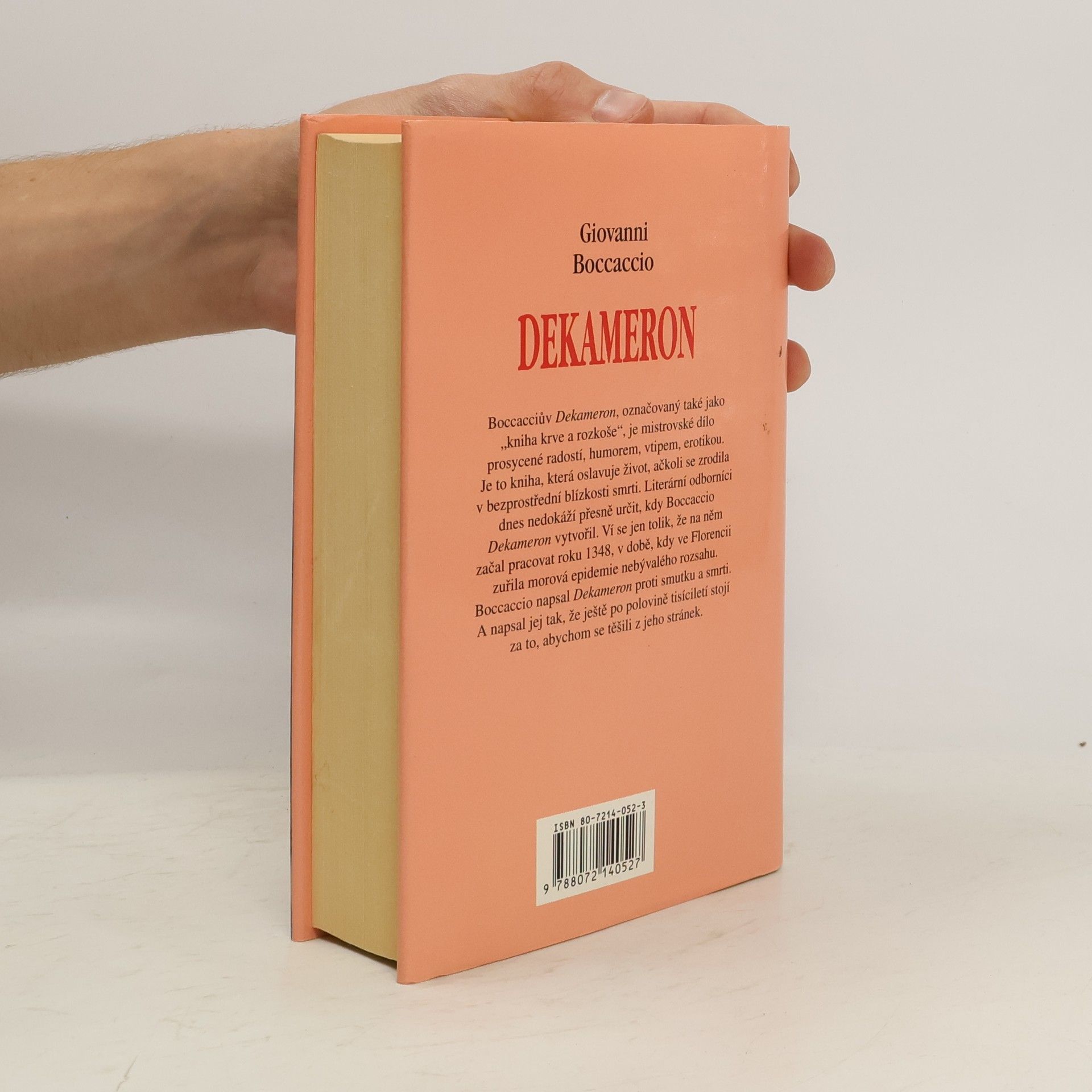 Boccaciův Derameron, označovaný také jako " kniha krve a rozkoše". Je to mistrovské renesanční dílo, prosycené radostí, humorem, vtipem, erotikou - dílo, které oslavuje život. Tím víc překvapuje, že se zrodilo v bezprostředním střetu se smrtí. Literární odborníci dnes nedokáží přesně určit, kdy Boccacio Dekameron vytvořil. Ví se jen tolik, že na něm začal pracovat roku 1348, v době, kdy ve Florencii zuřila morová epidemie nebývalého rozsahu. Boccacio napsal Dekameron proti smutku a nemoci. A napsal jej tak, že ještě po polovině tisíciletí stojí za to, abychom se těšili z jeho stránek.