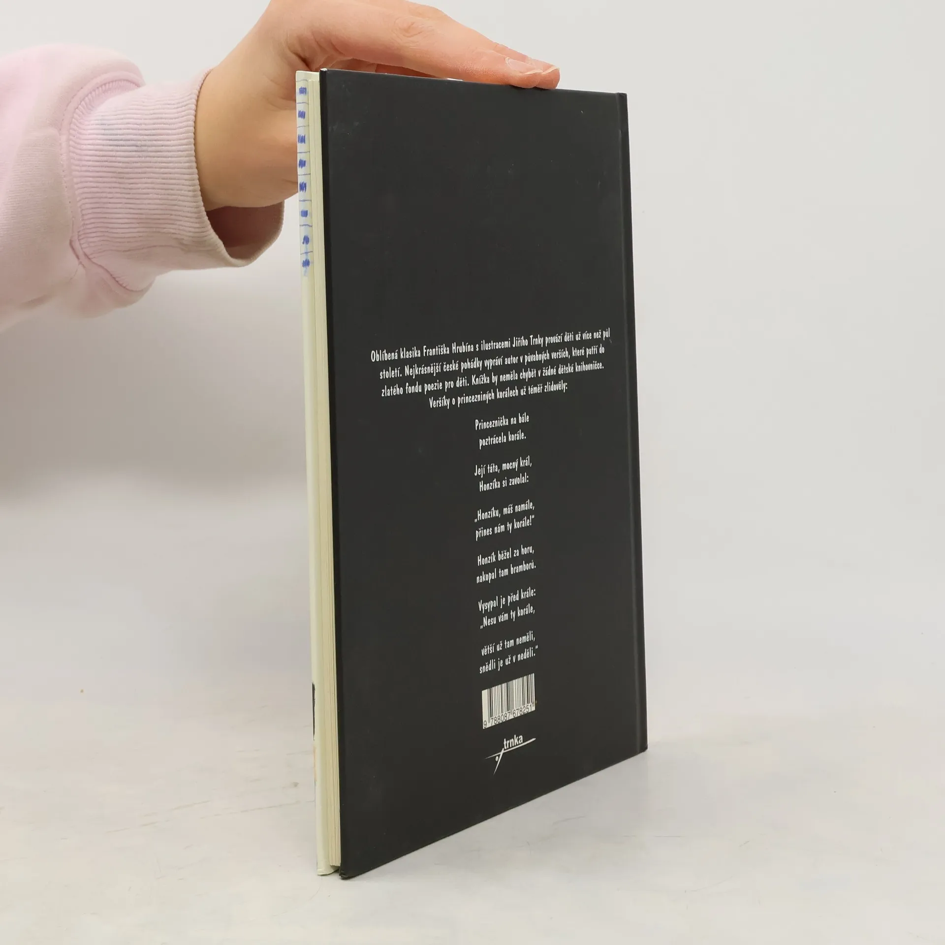 Oblíbená klasika Františka Hrubína s ilustracemi Jiřího Trnky provází děti už více než půl století. Nekrásnější české pohádky vypráví autor v půvabných verších, které patří do zlatého fondu poezie pro děti. V hravých a dobře zapamatovatelných verších se děti skamarádí s Červenou karkulkou, Budulínkem, Otesánkem, Palečkem i Smolíčkem, ochutnají Perníkovou chaloupku, Dědečkův koblížek i Velikou řepu, proběhnou se s kuřátkem v obilí a se zvířátky v začarovaném lese. Půvabná a nestárnoucí knížka, po níž je stále sháňka, je vhodná k předčítání i pro první samostatné čtení.