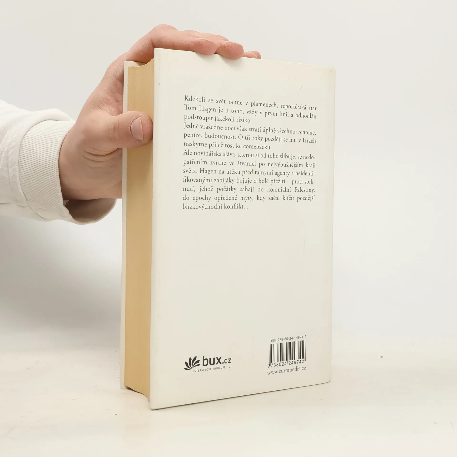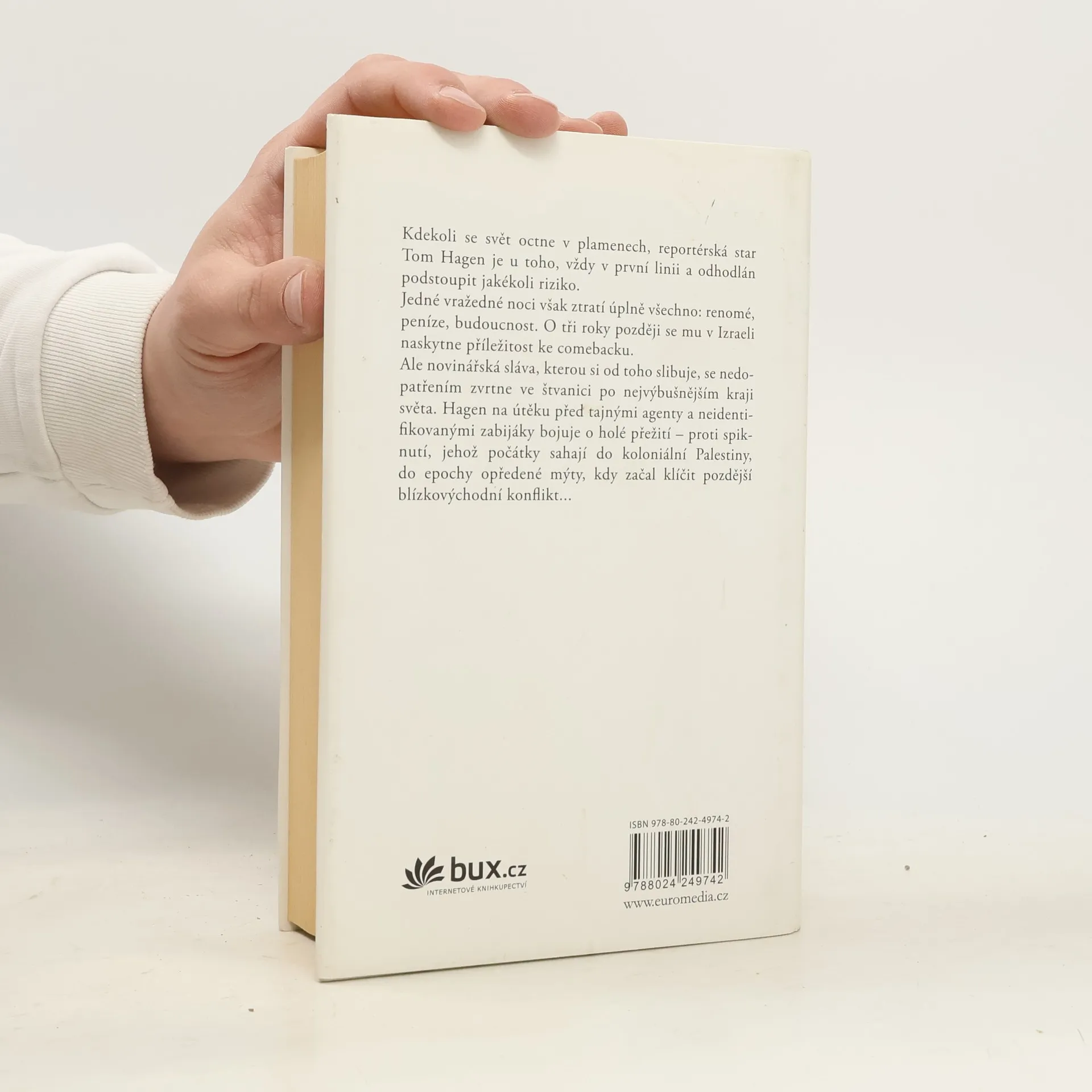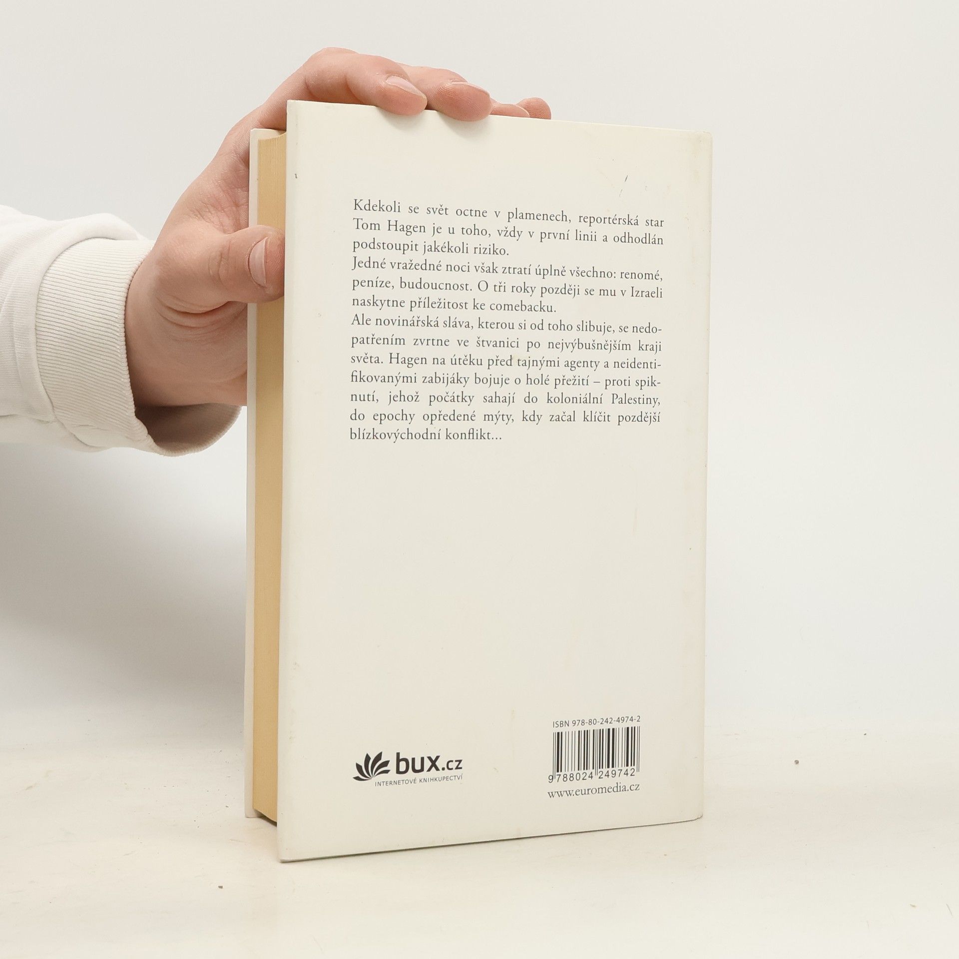 Tom Hagen, reportérská hvězda mezi válečnými zpravodaji, je vždy v první linii a odhodlán podstoupit jakékoli riziko. Specializuje se na země Blízkého východu a referuje odtud přímo z pekla. Jenže v Afghánistánu ho štěstí opustí. Jeho pověst se octne v troskách a zoufale bojuje o svůj comeback. O tři roky později se mu v Izraeli naskytne příležitost. Ale novinářská sláva, kterou si od toho slibuje, se nedopatřením zvrtne ve štvanici. Hagen na útěku před tajnými agenty a nebezpečnými zabijáky bojuje o holé přežití – proti spiknutí, jehož počátky sahají do koloniální Palestiny, kdy začal klíčit pozdější blízkovýchodní konflikt...