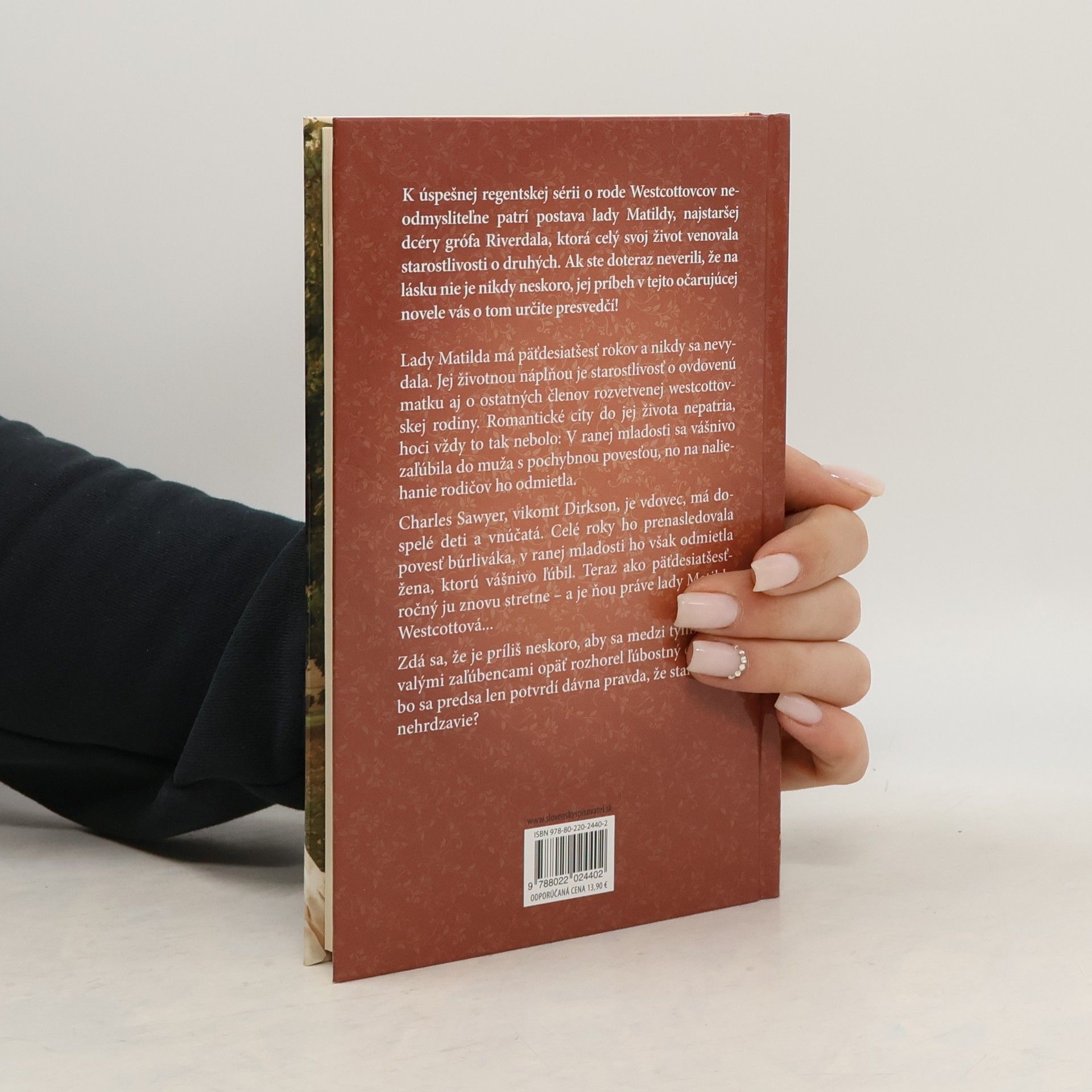 K úspešnej regentskej sérii o rode Westcottovcov neodmysliteľne patrí postava lady Matildy, najstaršej dcéry grófa Riverdala, ktorá celý svoj život venovala starostlivosti o druhých. Ak ste doteraz neverili, že na lásku nie je nikdy neskoro, jej príbeh v tejto očarujúcej novele vás o tom určite presvedčí!Lady Matilda má päťdesiatšesť rokov a nikdy sa nevydala. Jej životnou náplňou je starostlivosť o ovdovenú matku aj o ostatných členov rozvetvenej westcottovskej rodiny. Romantické city do jej života nepatria, hoci vždy to tak nebolo: V ranej mladosti sa vášnivo zaľúbila do muža s pochybnou povesťou, no na naliehanie rodičov ho odmietla.Charles Sawyer, vikomt Dirkson, je vdovec, má dospelé deti a vnúčatá. Celé roky ho prenasledovala povesť búrliváka, v ranej mladosti ho však odmietla žena, ktorú vášnivo ľúbil. Teraz ako päťdesiatšesťročný ju znovu stretne – a je ňou práve lady Matilda Westcottová…Zdá sa, že je príliš neskoro, aby sa medzi týmito bývalými zaľúbencami opäť rozhorel ľúbostný cit. Alebo sa predsa len potvrdí dávna pravda, že stará láska nehrdzavie?Série - Westcottovci p.č. 6.5