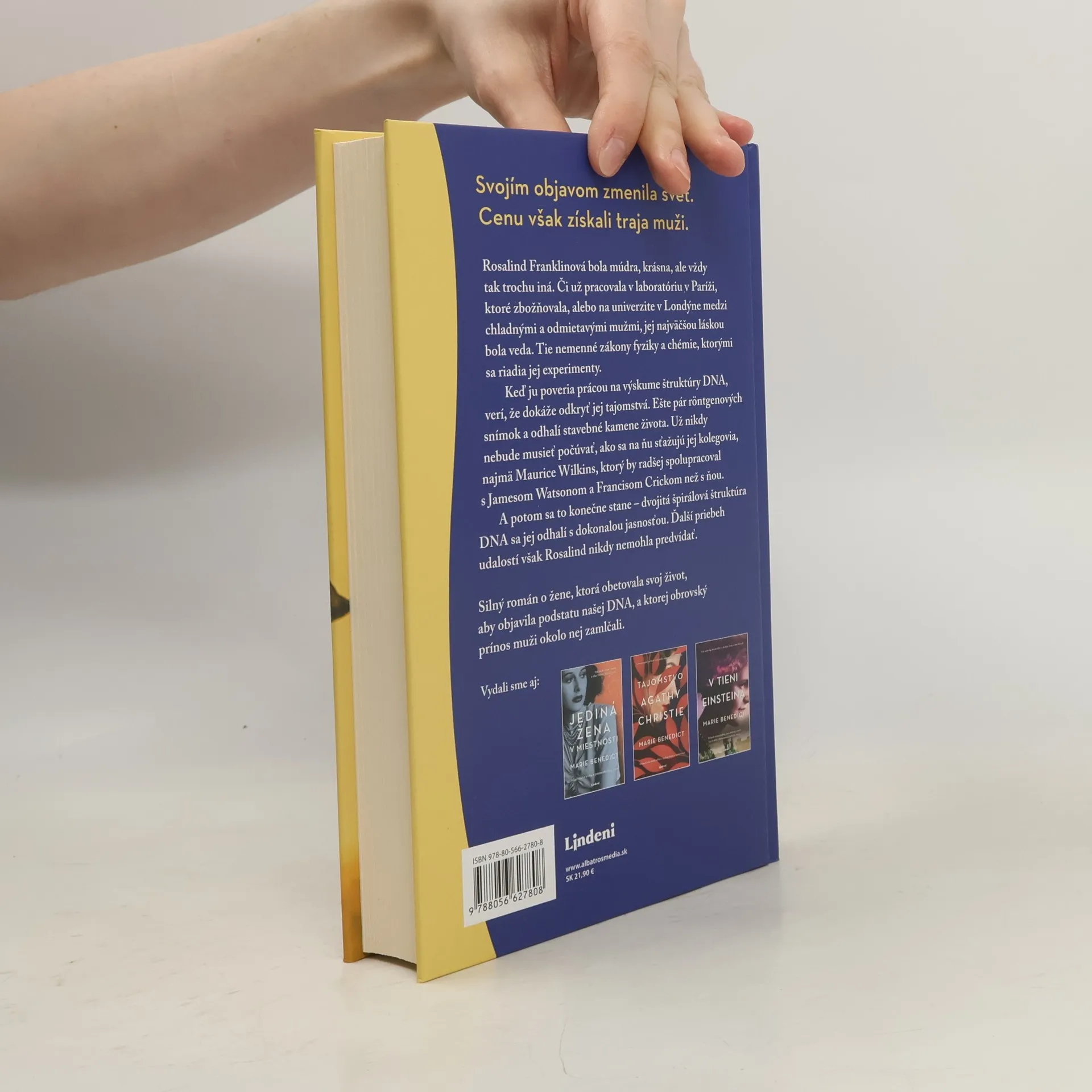 Svojím objavom zmenila svet. Cenu však získali traja muži. Rosalind Franklinová bola múdra, krásna, ale vždy tak trochu iná. Či už pracovala v laboratóriu v Paríži, ktoré zbožňovala, alebo na univerzite v Londýne, medzi chladnými a odmietavými mužmi, jej najväčšou láskou bola veda. Tie nemenné zákony fyziky a chémie, ktorými sa riadia jej experimenty. Keď je poverená prácou na výskume štruktúry DNA, verí, že dokáže odkryť jej tajomstvá. Ešte pár röntgenových snímok a odhalí stavebné kamene života. Už nikdy nebude musieť počúvať, ako sa na ňu sťažujú jej kolegovia, najmä Maurice Wilkins, ktorý by radšej spolupracoval s Jamesom Watsonom a Francisom Crickom, než s ňou. A potom sa to konečne stane – dvojitá špirálová štruktúra DNA sa jej odhalí s dokonalou jasnosťou. Ďalší priebeh udalostí však Rosalind nikdy nemohla predvídať. Silný román o žene, ktorá obetovala svoj život, aby objavila podstatu našej DNA, a ktorej obrovský prínos muži okolo nej zamlčali.