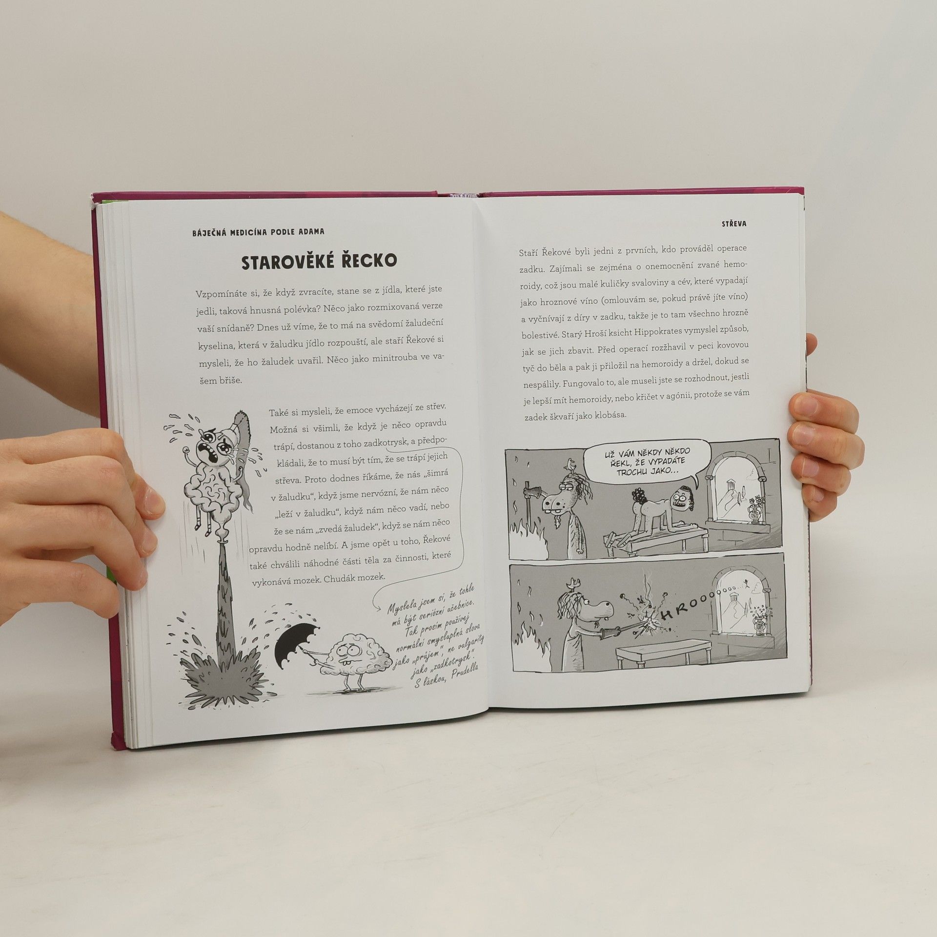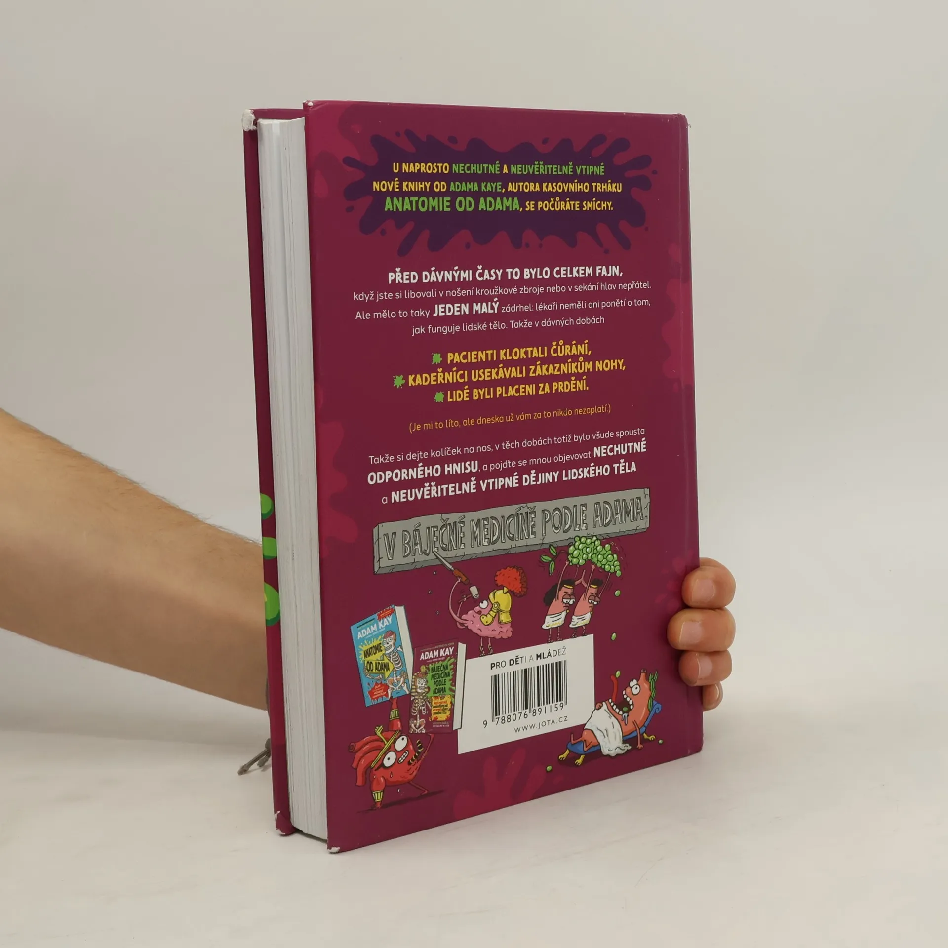 Tahle úžasně odporná učebnice biologie vás zaručeně bude bavit!Nechutné a neuvěřitelně vtipné dějiny lidského těla v podání autora bestselleru Anatomie od Adama.Kdysi dávno to byla fakt zábava, tedy pokud rádi nosíte kroužkovou zbroj nebo sekáte hlavy, jenže kdysi dávno měli taky takový MALINKATÝ PROBLÉMEČEK… doktoři tehdy vůbec netušili, jak funguje lidské tělo.Je na čase zjistit, proč si staří Egypťané mysleli, že mozek je jen nanicovatá nádivka lebky, která by se klidně dala vyhodit do popelnice, proč učitelé nutili své žáky kouřit cigarety, proč holiči svým zákazníkům uřezávali nohy a proč se dřív platilo za prdění. (Je mi to líto, ale dneska už vám za to nikdo nezaplatí.)Dostanete odpovědi na otázky, které by vás ani nenapadly, jako třeba:Proč pacienti kloktali čůrání?Jak doktor zachránil životy pomocí pračky, plechovky od fazolí a páru starých párků?Čemu se říkalo velký puch? (Ne, nebojte, doktoři tak neříkají vašemu zadku.)Jestli jste připravení, dejte si kolíček na nos (v těch dobách totiž byla všude spousta smradlavého hnisu), vezměte si holínky (také tam bylo hodně hovínek, co si budeme říkat), umyjte si ruce (protože oni si je tenkrát nemyli a jak dopadli!) a pojďte objevovat nechutné a příšerné dějiny lidského těla!