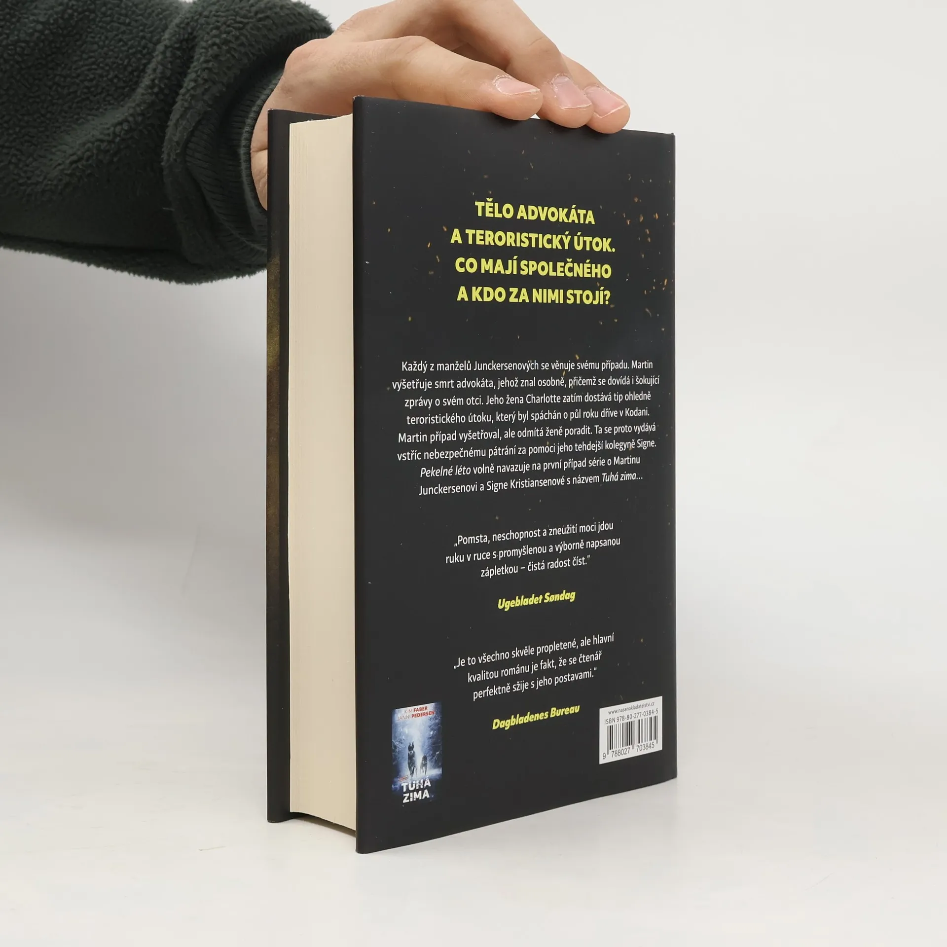 Je léto a příšerné vedro. Juncker i po smrti otce zůstává v Sandstedu a nedaří se mu nejlépe. V parku je nalezeno tělo místního advokáta a Juncker se pustí do vyšetřování. Ukáže se nejen, že mrtvého znal, ale dozví se i více o svém otci. Jeho žena Charlotte, investigativní novinářka, dostane anonymní tip, který naznačuje, že teroristickému útoku v Kodani, který zničil vánoční pohodu v Dánsku před půl rokem, se dalo zabránit. Charlotte zavětří dobrý příběh, obrátí se tedy na svého muže, který případ vyšetřoval. Juncker ví, co se tenkrát stalo, ale nechce ženě pomoci, protože má pocit, že by je to oba mohlo ohrozit. Nakonec novinářce začne s případem pomáhat Signe, Junckerova bývalá parťačka, která se vyšetřování také zúčastnila, ale na rozdíl od Junckera má pocit, že je potřeba pravdu odkrýt. Obě ženy začnou pátrat a dostanou se do dramatických situací. Pekelné léto volně navazuje na první případ série o Martinu Junckersenovi a Signe Kristiansenové Tuhá zima.