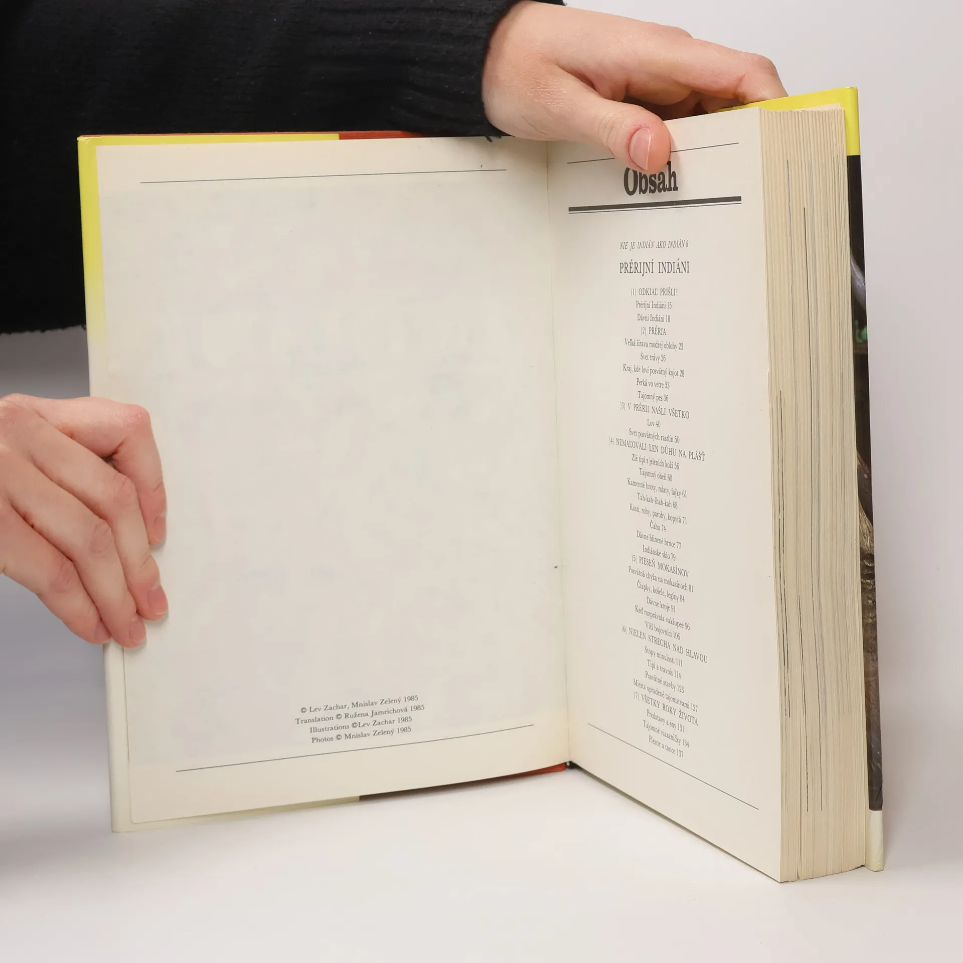 Obraz života prérijných a pralesných Indiánov dokresľuje množstvo pôvodných farebných a čiernobielych fotografií Mnislava Zeleného, kresieb Leva Zachara a dokumentárnych reprodukcií. Kto chce poznať pravdu o Indiánoch, o ich skutočnom živote a osudoch, určite siahne po tejto encyklopedickej knihe so záujmom.