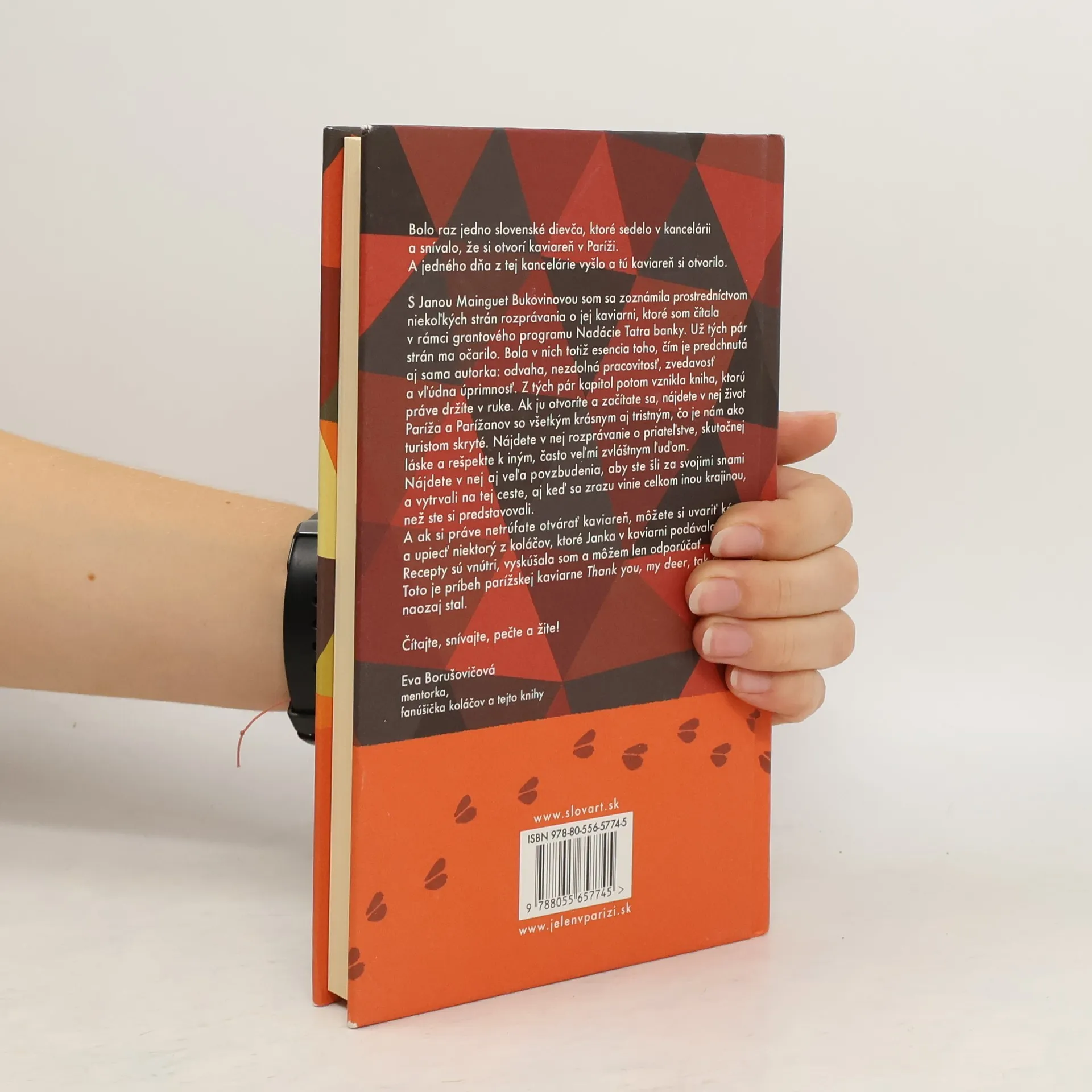 Príbeh jednej kaviarne.Jeleň v Paríži opisuje príbeh, ktorý sa naozaj stal. Je to príbeh kaviarne, ktorú si v Paríži autorka knihy otvorila a niekoľko rokov úspešne prevádzkovala. Zaznamenáva príbehy ľudí, čo v kaviarni pracovali a zanechali v nej svoju stopu, ale i príbehy hostí, susedov, priateľov, ktorí vstúpili nielen do života kaviarne, ale aj jej majiteľky. Vôňu kávy, bezlepkového chleba i koláčov z kaviarne so zvláštnym názvom Thank you, my deer zacítite i zo strán knihy. Jeleň v Paríži je príbehom o odvahe a túžbe podávať ľuďom jedlo a kávu a sledovať, ako im to robí dobre na duši, a aj o tom, že sny si treba plniť.