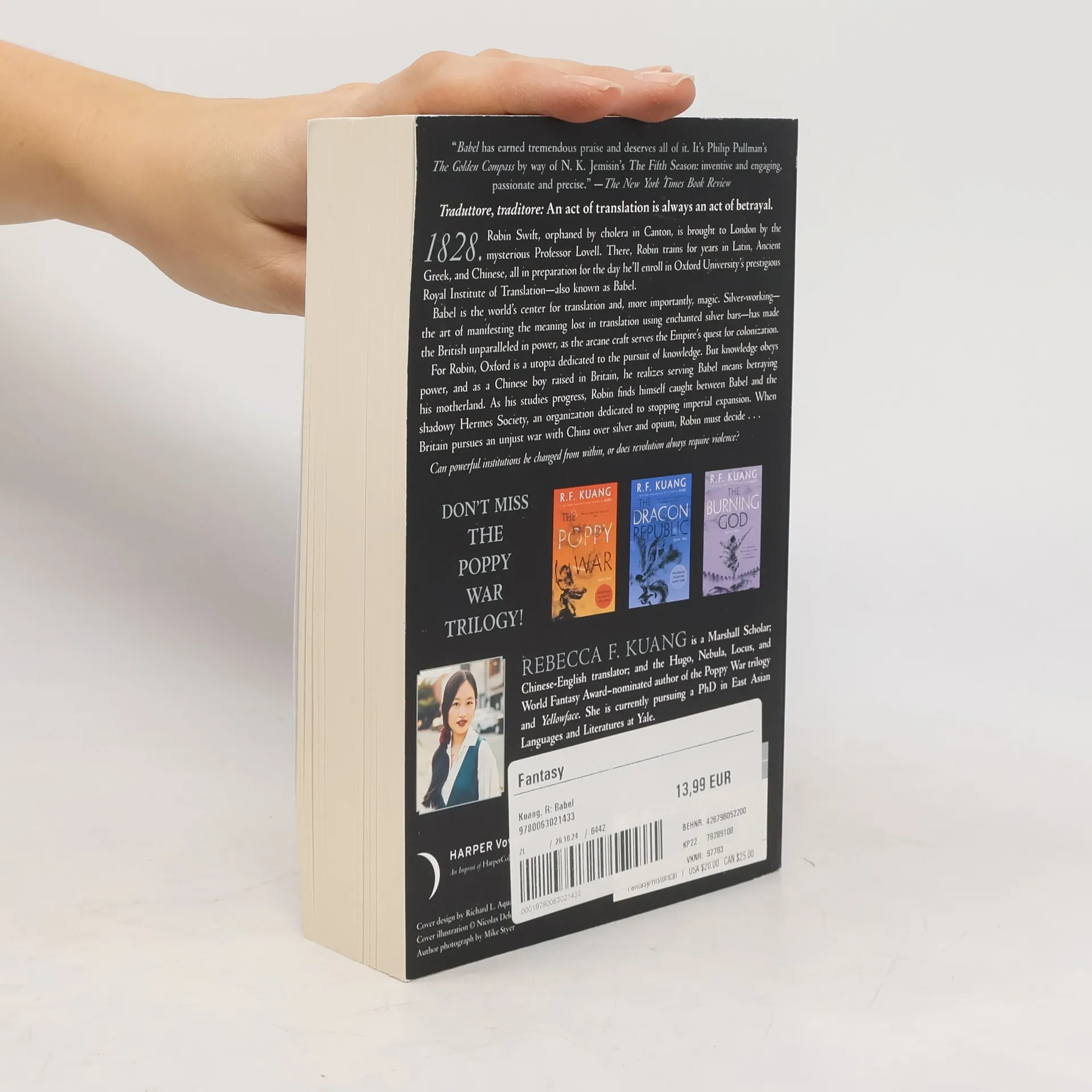Instant #1 New York Times Bestseller from the author of The Poppy War "Absolutely phenomenal. One of the most brilliant, razor-sharp books I've had the pleasure of reading that isn't just an alternative fantastical history, but an interrogative one; one that grabs colonial history and the Industrial Revolution, turns it over, and shakes it out." -- Shannon Chakraborty, bestselling author of The City of Brass From award-winning author R. F. Kuang comes Babel, a thematic response to The Secret History and a tonal retort to Jonathan Strange & Mr. Norrell that grapples with student revolutions, colonial resistance, and the use of language and translation as the dominating tool of the British empire. Traduttore, traditore: An act of translation is always an act of betrayal. 1828. Robin Swift, orphaned by cholera in Canton, is brought to London by the mysterious Professor Lovell. There, he trains for years in Latin, Ancient Greek, and Chinese, all in preparation for the day he'll enroll in Oxford University's prestigious Royal Institute of Translation--also known as Babel. Babel is the world's center for translation and, more importantly, magic. Silver working--the art of manifesting the meaning lost in translation using enchanted silver bars--has made the British unparalleled in power, as its knowledge serves the Empire's quest for colonization. For Robin, Oxford is a utopia dedicated to the pursuit of knowledge. But knowledge obeys power, and as a Chinese boy raised in Britain, Robin realizes serving Babel means betraying his motherland. As his studies progress, Robin finds himself caught between Babel and the shadowy Hermes Society, an organization dedicated to stopping imperial expansion. When Britain pursues an unjust war with China over silver and opium, Robin must decide... Can powerful institutions be changed from within, or does revolution always require violence?