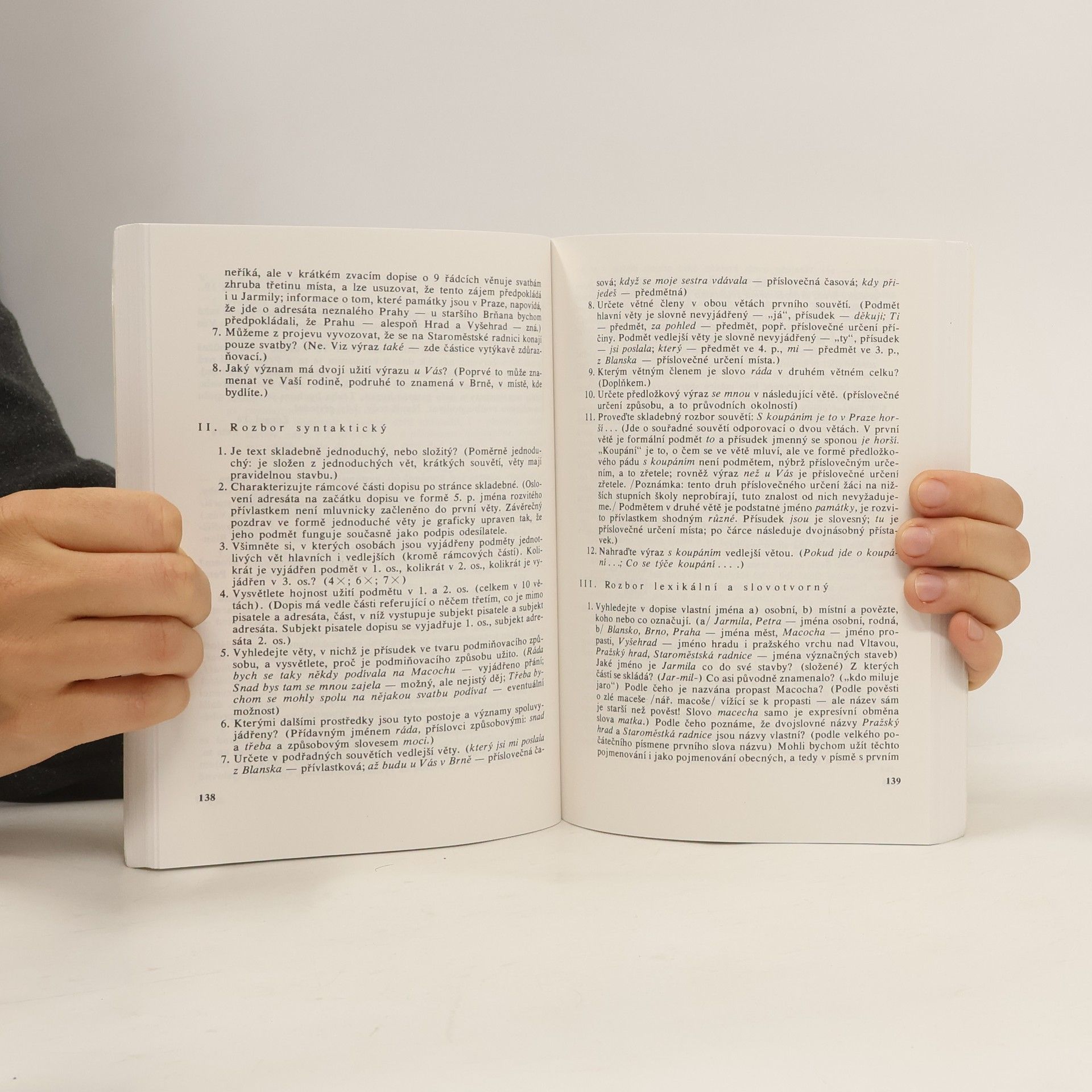 Komplexně pojatý jazykový rozbor usiluje o kofrontaci pohledu příjemce textu a jeho produktora. Pomocí jazykového rozboru mají být rozvíjeny a zdokonalovány analytické a vyjadřovací schopnosti žáků. Kniha je rozdělena na teoretickou a praktickou část. Autoři v této části usilují o objasnění nových pojmů, s nimiž se širší veřejnost v tradičních gramatických příručkách nesetkala nebo které předpokládají bližší vysvětlení (větné vztahy významové a formální). Praktická část obsahuje dva zapsané projevy mluvené bez předešlé úpravy. Na výchozí text navazuje Rozbor komunikační situace a závěr tvoří Rozbor stylistický (M. Čechová a K. Hausenblas), dále Rozbor syntaktický (J. Hrbáček), Rozbor lexikální a slovotvorný (M. Dokulil), Rozbor slovnědruhový a tvaroslovný (Vl.Styblík) a nakonec, netradičně zařazený Rozbor zvukové a grafické stránky (F.Daneš).
