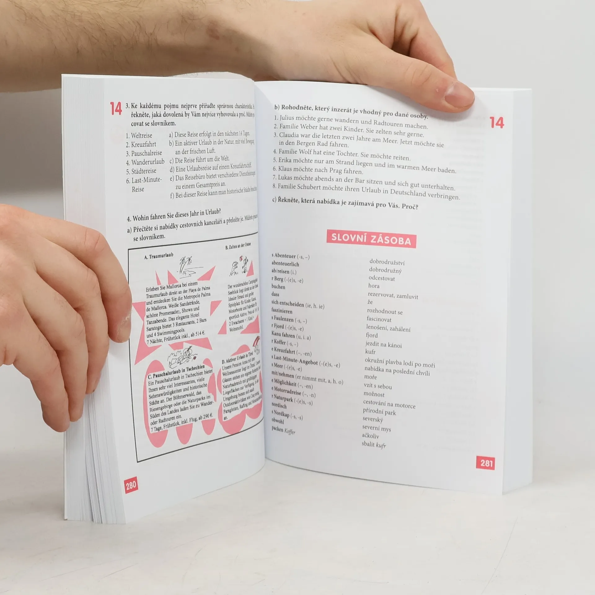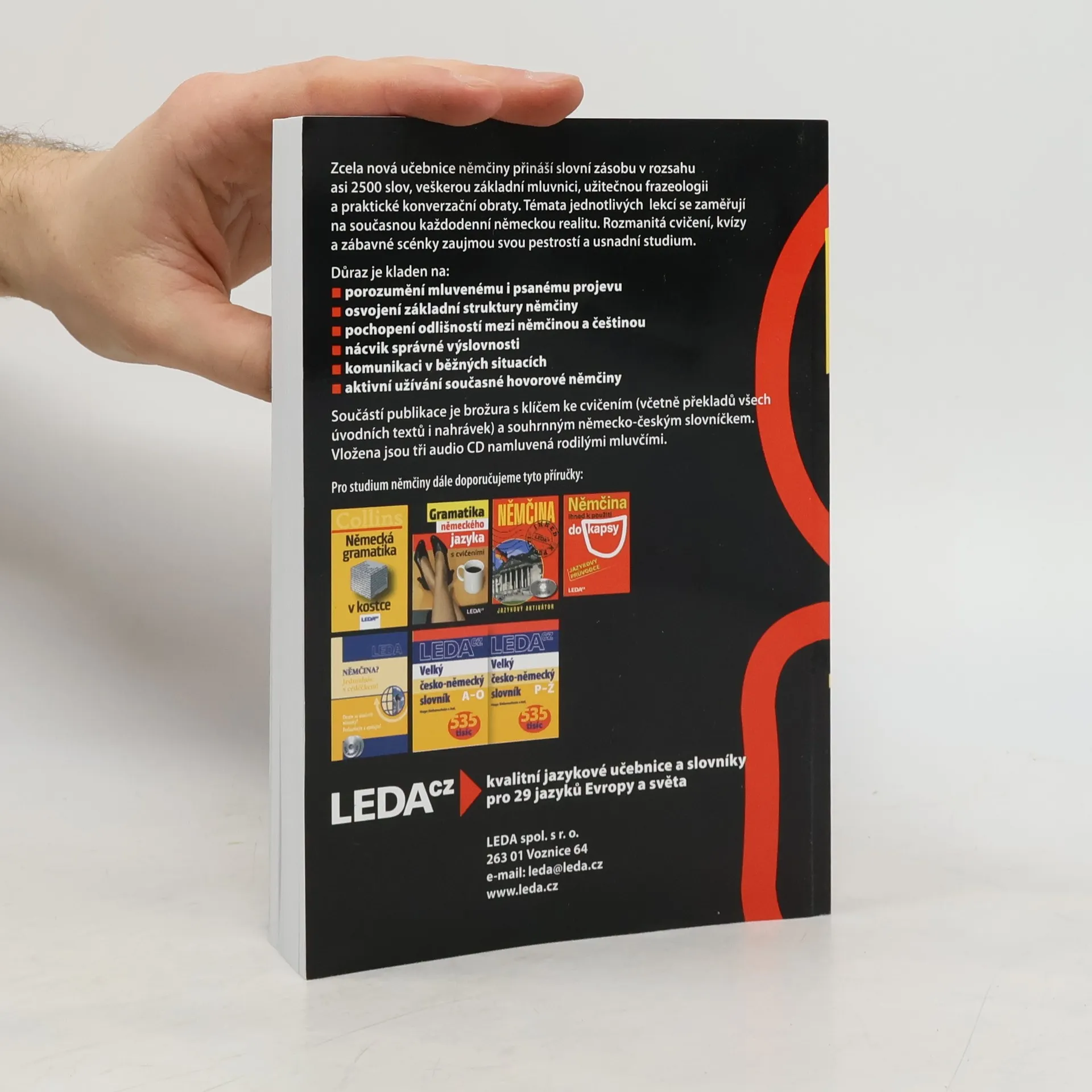 Zcela nová učebnice němčiny přináší slovní zásobu v rozsahu asi 2500 slov, veškerou základní mluvnici, užitečnou frazeologii a praktické konverzační obraty. Témata jednotlivých lekcí reflektují současný každodenní život se zaměřením na německou realitu. Rozmanitá cvičení, kvízy a zábavné scénky zaujmou svou pestrostí a usnadní studium. Důraz je kladen na: - porozumění mluvenému i psanému projevu - osvojení základní struktury němčiny - pochopení odlišností mezi němčinou a češtinou - nácvik správné výslovnosti - zvládnutí komunikace v běžných situacích - aktivní užívání současné hovorové němčiny Součástí publikace je brožura s klíčem ke cvičením (včetně překladů všech úvodních textů i nahrávek) a souhrnným německo-českým slovníčkem. Vložena jsou tři audio CD namluvená rodilými mluvčími. Učebnice je vhodná jak pro samouky, tak pro studium pod vedením učitele. Určena je pro uživatele se vstupní úrovní A1 až B1 (začátečník až mírně pokročilý), dosáhnout lze stupně pokročilosti B1 až C1 (mírně pokročilý až pokročilý).