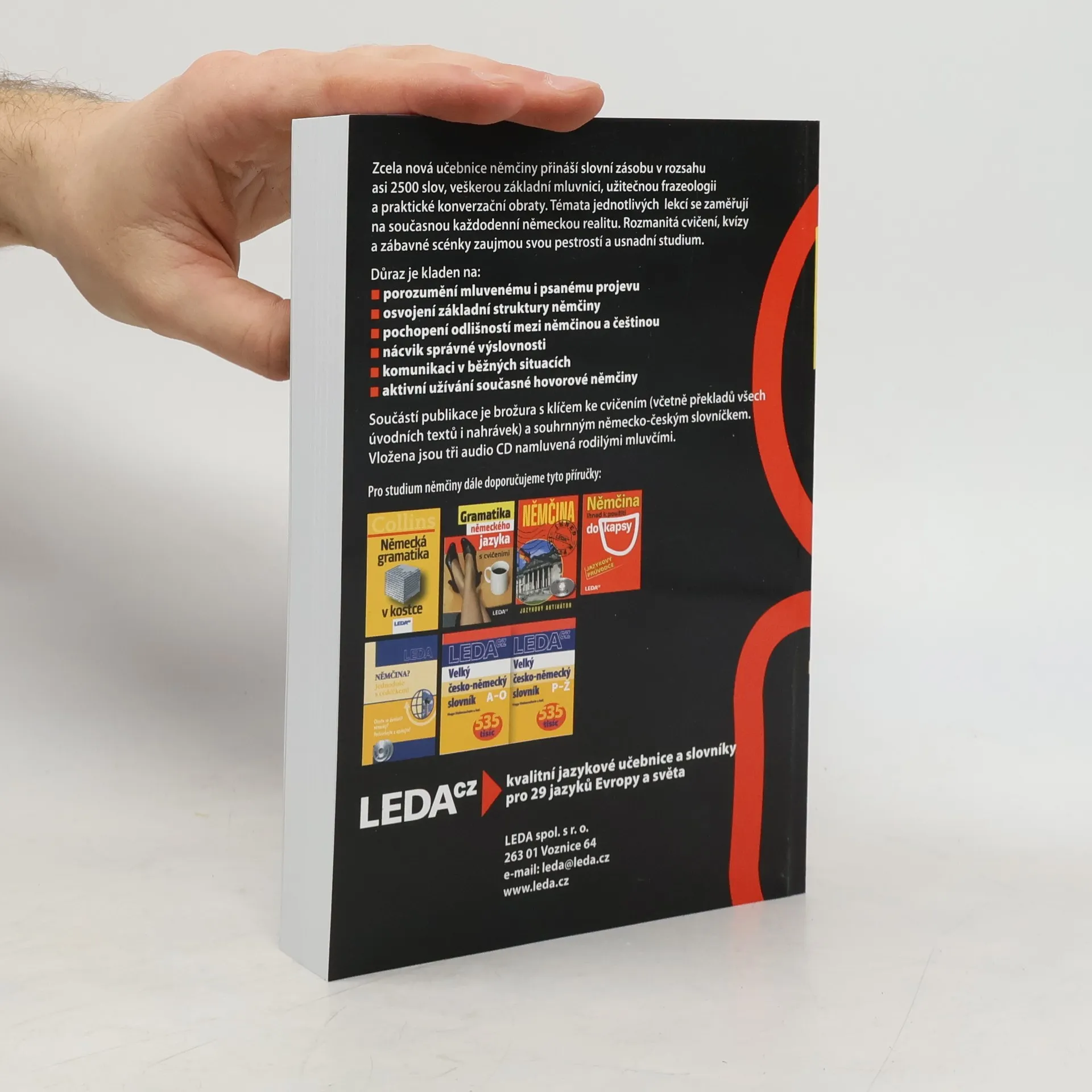Zcela nová učebnice němčiny přináší slovní zásobu v rozsahu asi 2500 slov, veškerou základní mluvnici, užitečnou frazeologii a praktické konverzační obraty. Témata jednotlivých lekcí reflektují současný každodenní život se zaměřením na německou realitu. Rozmanitá cvičení, kvízy a zábavné scénky zaujmou svou pestrostí a usnadní studium. Důraz je kladen na: - porozumění mluvenému i psanému projevu - osvojení základní struktury němčiny - pochopení odlišností mezi němčinou a češtinou - nácvik správné výslovnosti - zvládnutí komunikace v běžných situacích - aktivní užívání současné hovorové němčiny Součástí publikace je brožura s klíčem ke cvičením (včetně překladů všech úvodních textů i nahrávek) a souhrnným německo-českým slovníčkem. Vložena jsou tři audio CD namluvená rodilými mluvčími. Učebnice je vhodná jak pro samouky, tak pro studium pod vedením učitele. Určena je pro uživatele se vstupní úrovní A1 až B1 (začátečník až mírně pokročilý), dosáhnout lze stupně pokročilosti B1 až C1 (mírně pokročilý až pokročilý).