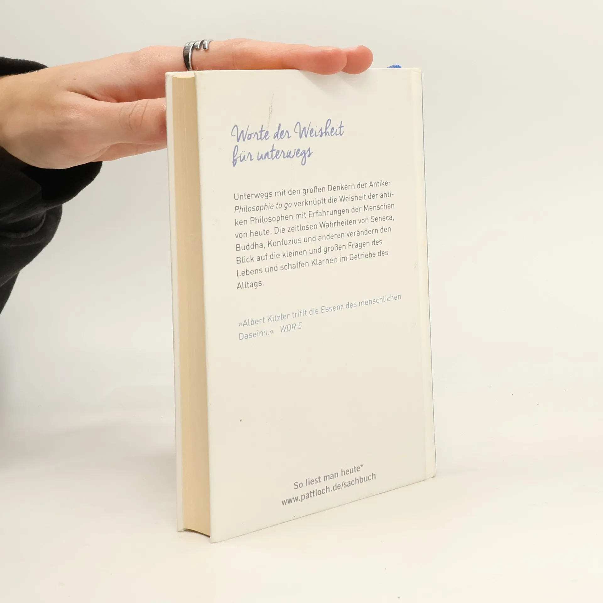 Philosophie für die Pause zwischendurchUnterwegs sein mit den großen Denkern der Antike: Albert Kitzler präsentiert die Weisheit der großen Philosophen aus West und Ost, aus Griechenland, Rom, Indien und China, in kleinen Häppchen und verknüpft sie mit Alltags-Erfahrungen von heute. So gewinnen die Leser neue Sichtweisen auf die kleinen und großen Fragen des Lebens und finden ihre Mitte im Getriebe des Alltags. „Philosophie to go“ – das sind Auszeiten und kleine Pausen mit Seneca, Buddha, Konfuzius und vielen anderen, die beim Innehalten helfen und wichtige Impulse für die alltägliche Lebensführung geben.