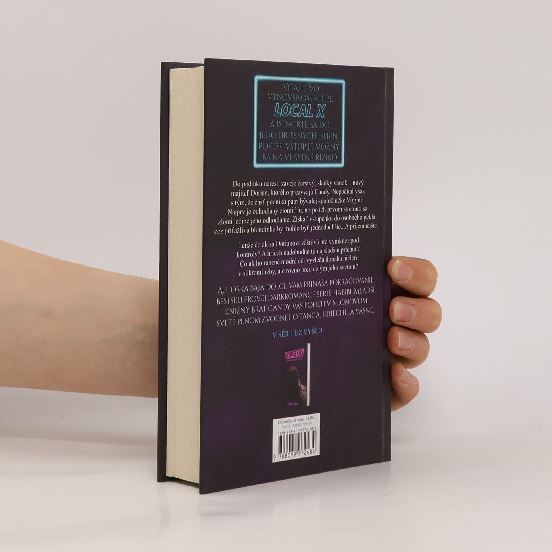 Vitajte vo vynovenom klube LocalX a ponorte sa do jeho hriešnych hlbín. Pozor! Vstup je možný iba na vlastné riziko.Do podniku nerestí zaveje čerstvý, sladký vánok ‒ nový majiteľ Dorian, ktorého prezývajú Candy. Nepočítal však s tým, že časť podniku patrí bývalej spoločníčke Virginii. Najprv je odhodlaný zlomiť ju, no po ich prvom stretnutí sa zlomí jedine jeho odhodlanie. Získať vstupenku do osobného pekla cez príťažlivú blondínku by mohlo byť jednoduchšie... A príjemnejšie.Lenže čo ak sa Dorianovi vášnivá hra vymkne spod kontroly? A hriech nadobudne tú najsladšiu príchuť? Čo ak ho ranené modré oči vyzlečú donaha nielen v súkromí izby, ale rovno pred celým jeho svetom?Autorka Baja Dolce vám prináša pokračovanie bestsellerovej darkromance série Habibi. Mladší knižný brat Candy vás pohltí v neónovom svete plnom zvodného tanca, hriechu a vášne.