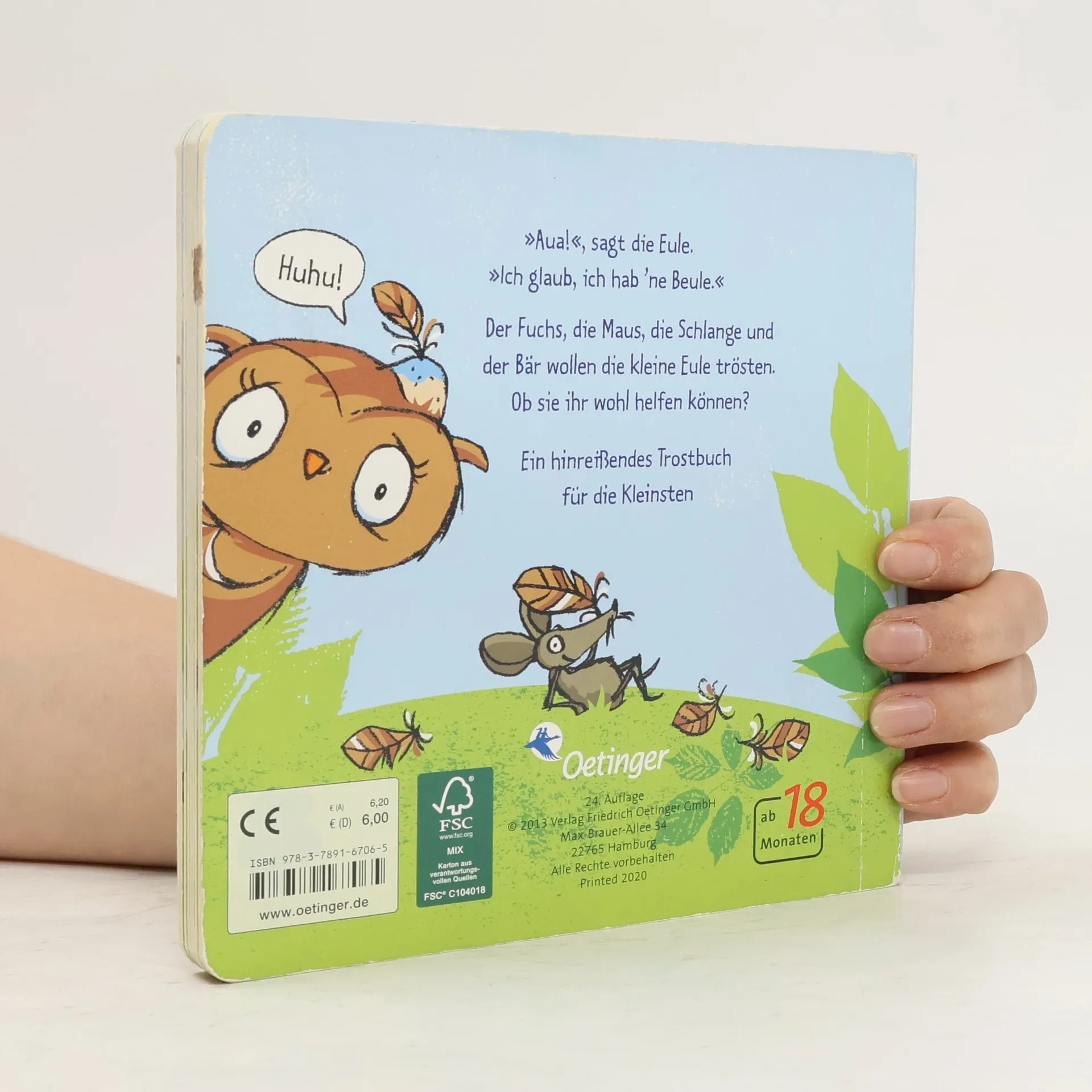 Arme kleine Eule! Ein wunderbares Trostbuch. Die kleine Eule hat eine Beule. Der Fuchs pustet, die Maus bringt ein Pflaster und die Schlange streichelt ihr die Wange. Doch was hilft am besten? Natürlich ein Kuss von der Mama! Ein absolutes Lieblingsbuch für kleine Kinder mit der süßesten Eule der Welt. Einfach zum Liebhaben und Mitfühlen! Klare Bilder und einfache Reime zum Mitsprechen sorgen für viel Spaß beim Lesen.