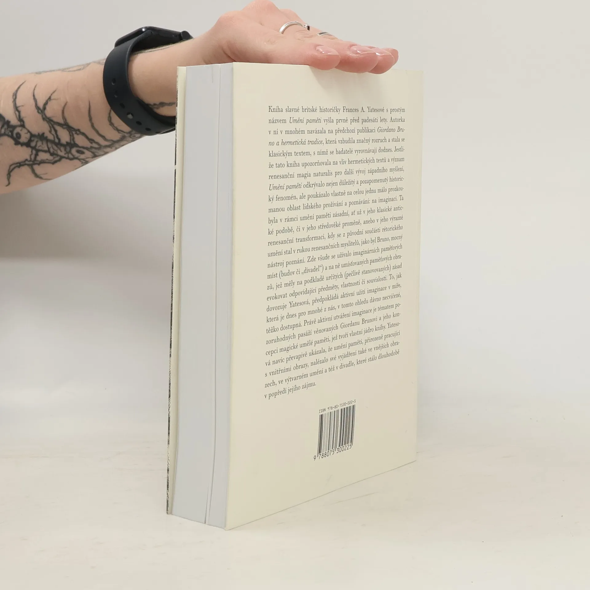 Kniha britské historičky Frances A. Yatesové se zaměřuje na umění paměti, které navazuje na její předchozí práci o Giordanu Brunovi a hermetické tradici. Zatímco předchozí publikace zkoumala vliv hermetických textů a renesanční magia naturalis, tato kniha odhaluje zapomenutý historický fenomén a málo prozkoumanou oblast lidského poznání: imaginaci. Ta hrála klíčovou roli v umění paměti, a to jak v antice, tak ve středověku a renesanci, kdy se stala mocným nástrojem poznání. Renesanční myslitelé, včetně Bruna, využívali imaginární paměťová místa a paměťové obrazy, které podle pečlivě stanovených zásad evokovaly odpovídající objekty a souvislosti. Yatesová ukazuje, že aktivní užití imaginace, které je dnes pro mnohé obtížné, bylo v minulosti zásadní. Téma aktivního utváření imaginace se podrobně rozebírá v pasážích o Brunovi a jeho koncepci magické umělé paměti, což tvoří jádro knihy. Yatesová navíc překvapivě ukazuje, že umění paměti, pracující s vnitřními obrazy, se projevovalo také ve vnějších obrazech, ve výtvarném umění a divadle, které bylo dlouhodobě v jejím zájmu.