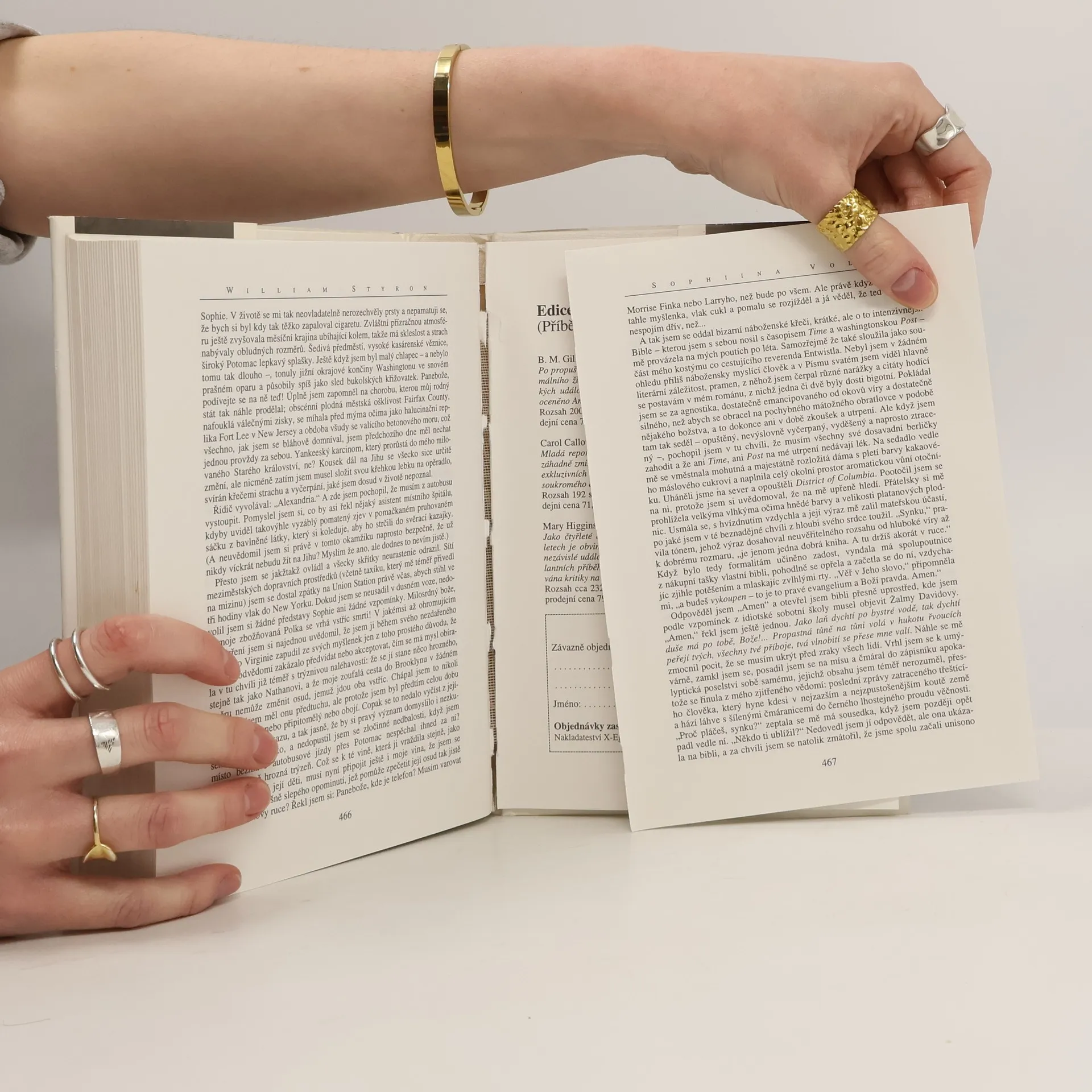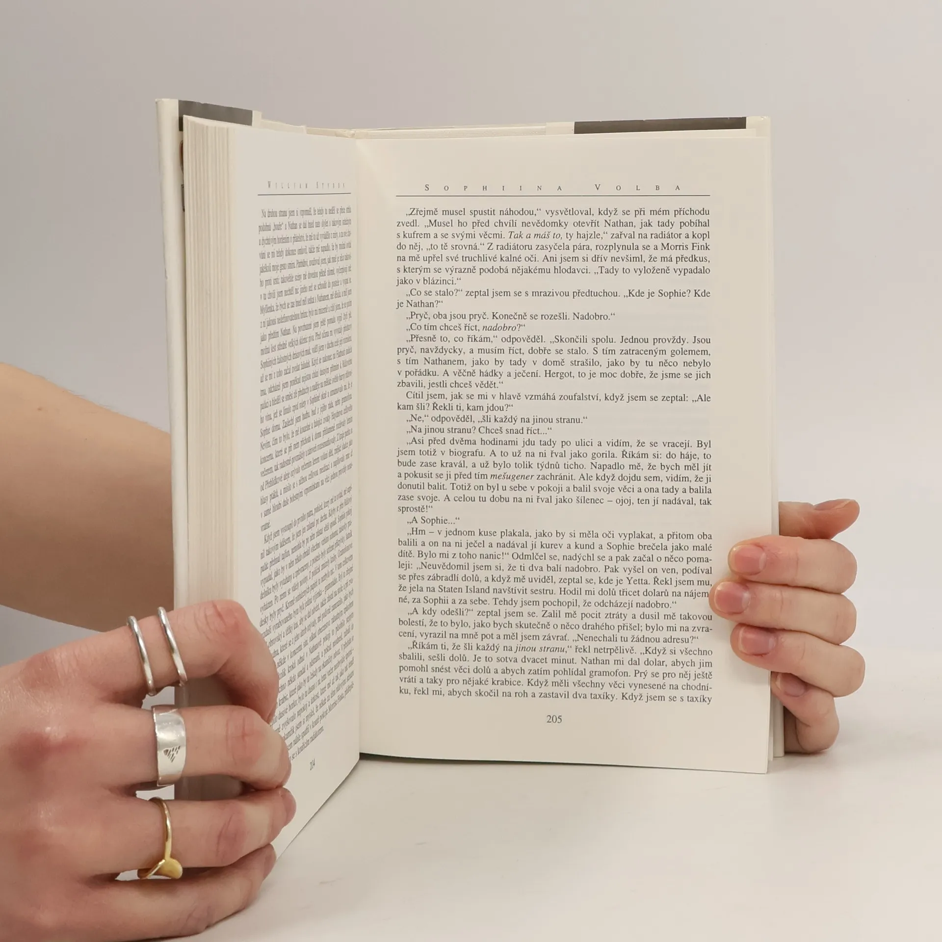 Román o mnoha volbách Sophie, která po ukončení druhé světové války přijíždí z rodné Varšavy do Spojených států, aby se zde pokusila začít nový život. Mnohavrstevný příběh, v němž se konfrontuje současnost reprezentovaná dychtivostí americké pováleční generace s návraty hlavní hrdinky do kruté minulosti, v sobě obsahuje mnohé prvky klasického dramatu. ten je však podán neobyčejně bohatým styronovským stylem, o němž o němž se často hovoří jako o téměř barokním. Hluboký ponor do psychologie postav střídají scény plné smyslnosti. Tato metoda protikladů umocňuje přesvědčivost jednání Sophie, která se marně snaží zbavit bolestných traumat a vybudovat si novou existenci.... celý text