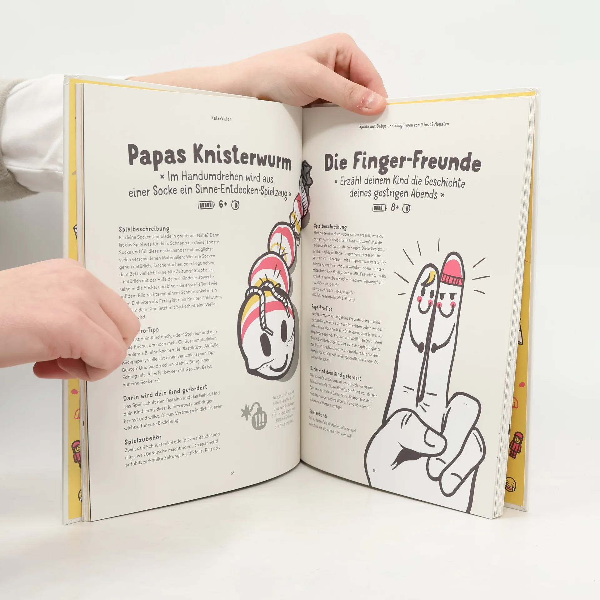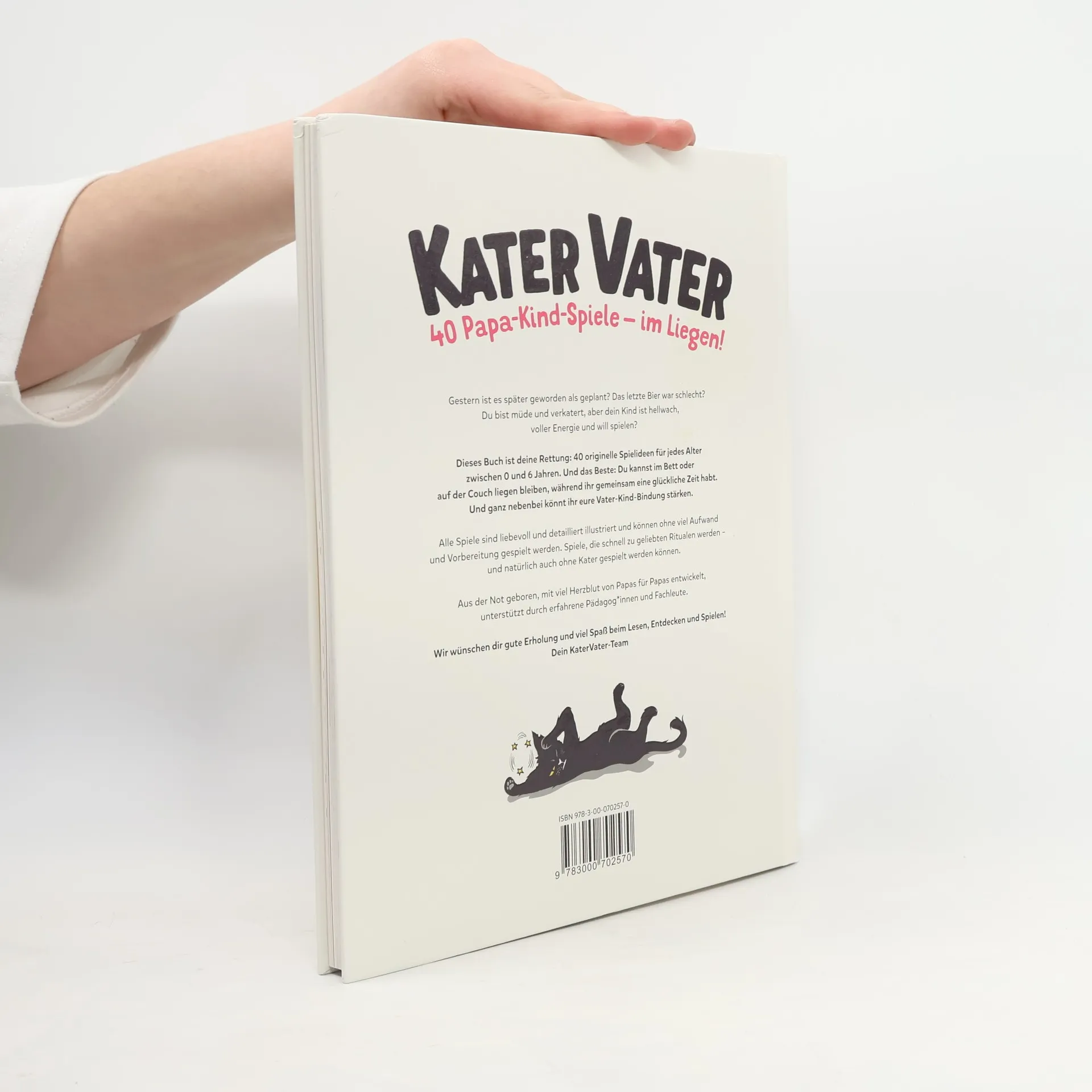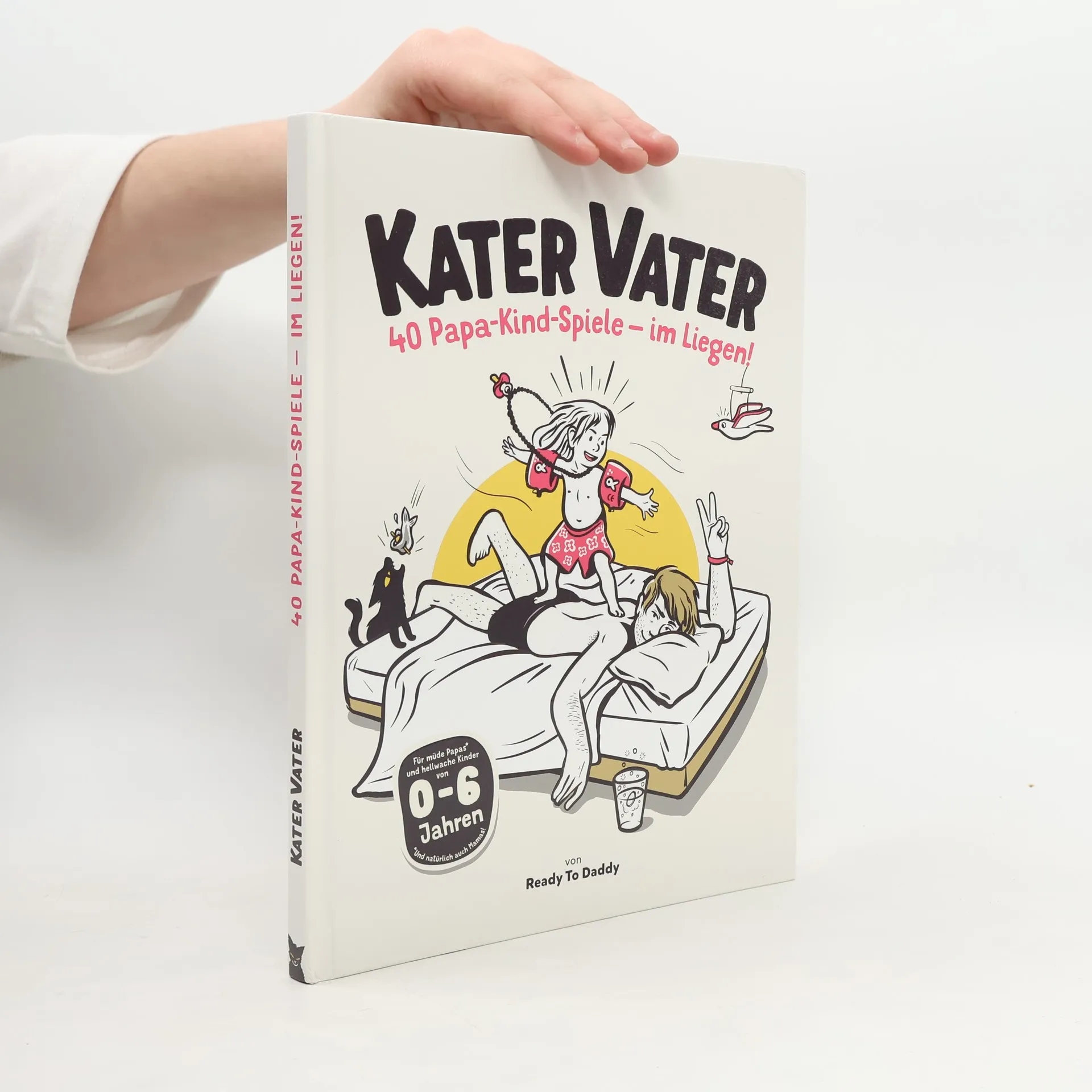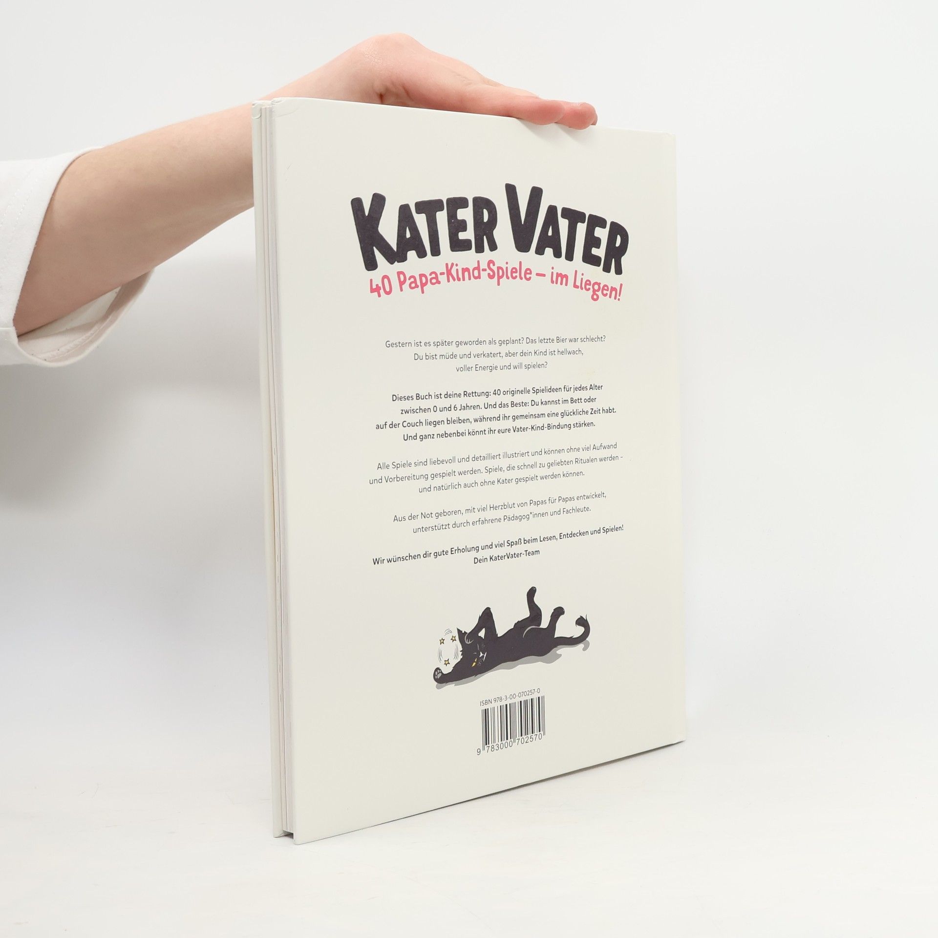 Kater Vater: 40 Papa-Kind-Spiele im Liegen – Für übermüdete Papas und hellwache Kinder. Gestern ist es später geworden als geplant? Das letzte Bier war schlecht? Du bist müde und verkatert, aber dein Kind ist hellwach, voller Energie und will spielen? Dieses Buch ist deine Rettung: 40 originelle Spielideen für jedes Alter zwischen 0 und 6 Jahren. Und das Beste: Du kannst im Bett oder auf der Couch liegen bleiben, während ihr gemeinsam eine glückliche Zeit habt. Und ganz nebenbei könnt ihr eure Vater-Kind-Bindung stärken. Alle Spiele sind liebevoll und detailliert illustriert und können ohne viel Aufwand und Vorbereitung gespielt werden. Spiele, die schnell zu geliebten Ritualen werden – und natürlich auch ohne Kater gespielt werden können. Aus der Not geboren, mit viel Herzblut von Papas für Papas entwickelt, unterstützt durch erfahrene Pädagog*innen und Fachleute. Wir wünschen dir gute Erholung und viel Spaß beim Lesen, Entdecken und Spielen! Originelle Spielideen für übermüdete und/oder verkaterte Papas. Spielbar im Bett oder auf der Couch, katergerecht im Liegen. Zusammen mit deinem Kind eine gute, qualitative Zeit verbringen – ohne Handy! Stärkt die Vater-Kind-Bindung und das Selbstbewusstsein deiner Kinder. Spielerisch lernen und fördern: kreativ und fantasievoll. Entwickelt von Papas für Papas mit Hilfe erfahrener Pädagog*innen und Fachleute Aufwändig und liebevoll illustriert.