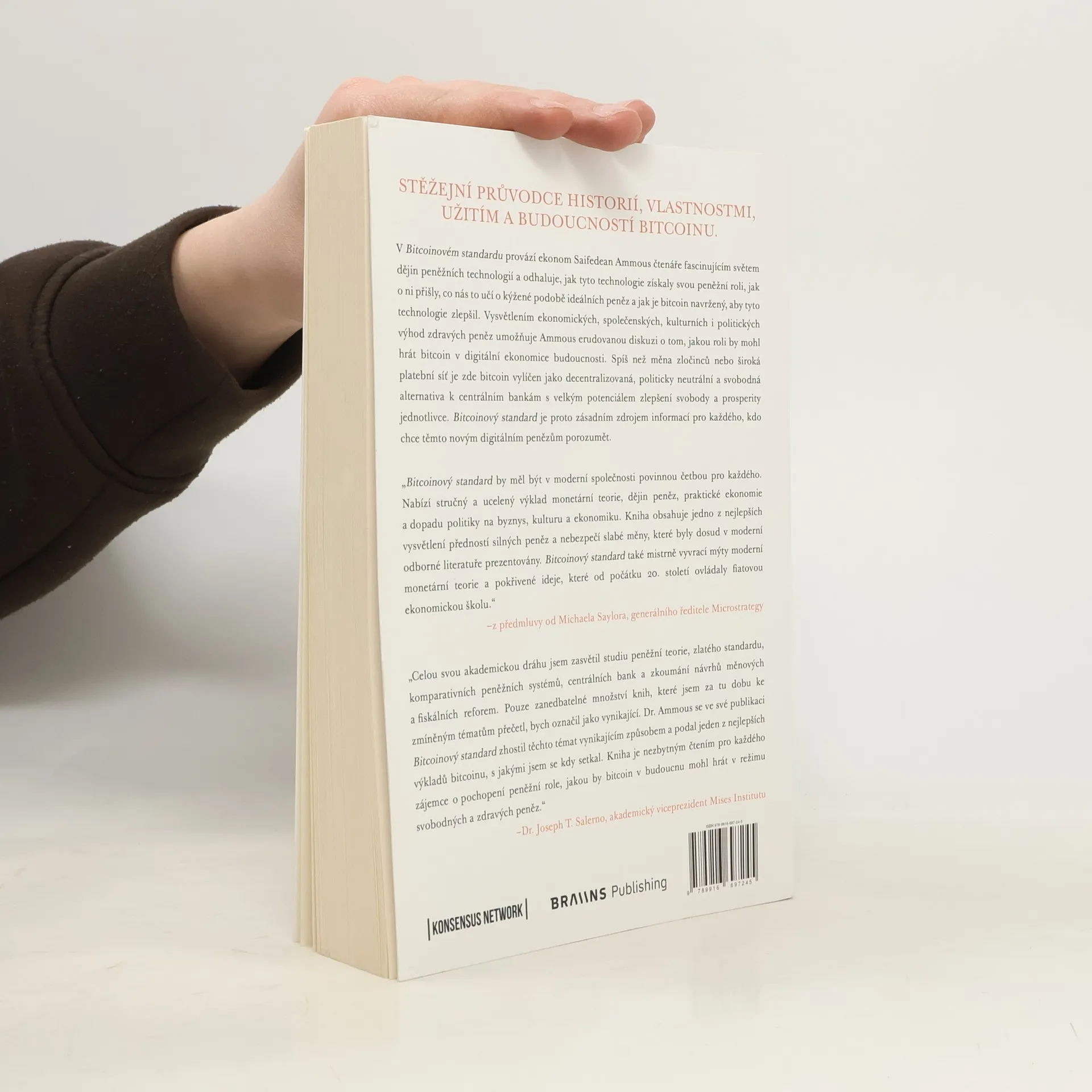 Stěžejní průvodce historií, vlastnostmi, užitím a budoucností bitcoinu. Ekonom Saifedean Ammous provází čtenáře fascinujícím světem peněžních technologií, odhaluje, jak tyto technologie získaly svou peněžní roli, jak o ni přišly a co nás to učí o ideálních penězích. Vysvětlením ekonomických, společenských, kulturních a politických výhod zdravých peněz umožňuje Ammous erudovanou diskuzi o roli bitcoinu v digitální ekonomice budoucnosti. Bitcoin je zde vylíčen jako decentralizovaná, politicky neutrální a svobodná alternativa k centrálním bankám, s potenciálem zlepšit svobodu a prosperitu jednotlivce. Kniha je zásadním zdrojem informací pro každého, kdo chce porozumět těmto novým digitálním penězům. „Bitcoinový standard by měl být povinnou četbou pro každého. Nabízí stručný a ucelený výklad monetární teorie, dějin peněz a dopadu politiky na byznys, kulturu a ekonomiku. Obsahuje jedno z nejlepších vysvětlení předností silných peněz a nebezpečí slabé měny v moderní odborné literatuře. Mistrně vyvrací mýty moderní monetární teorie a pokřivené ideje ovládající fiatovou ekonomickou školu.“ –z předmluvy od Michaela Saylora, generálního ředitele Microstrategy „Dr. Ammous se ve své publikaci zhostil těchto témat vynikajícím způsobem a podal jeden z nejlepších výkladů bitcoinu, s jakými jsem se kdy setkal. Kniha je nezbytným čtením pro každého, kdo chce pochopit peněžní roli bitcoinu v budoucnu.“ –Dr. Joseph T. Salerno, akademický vi