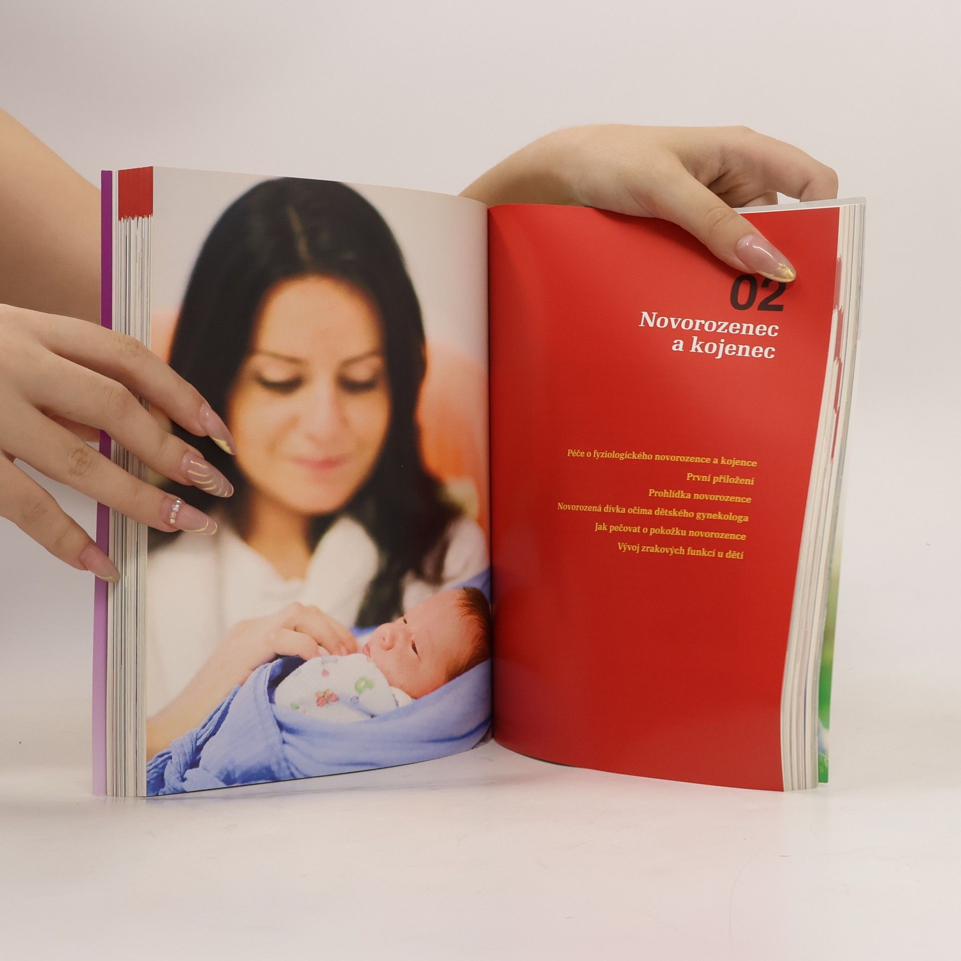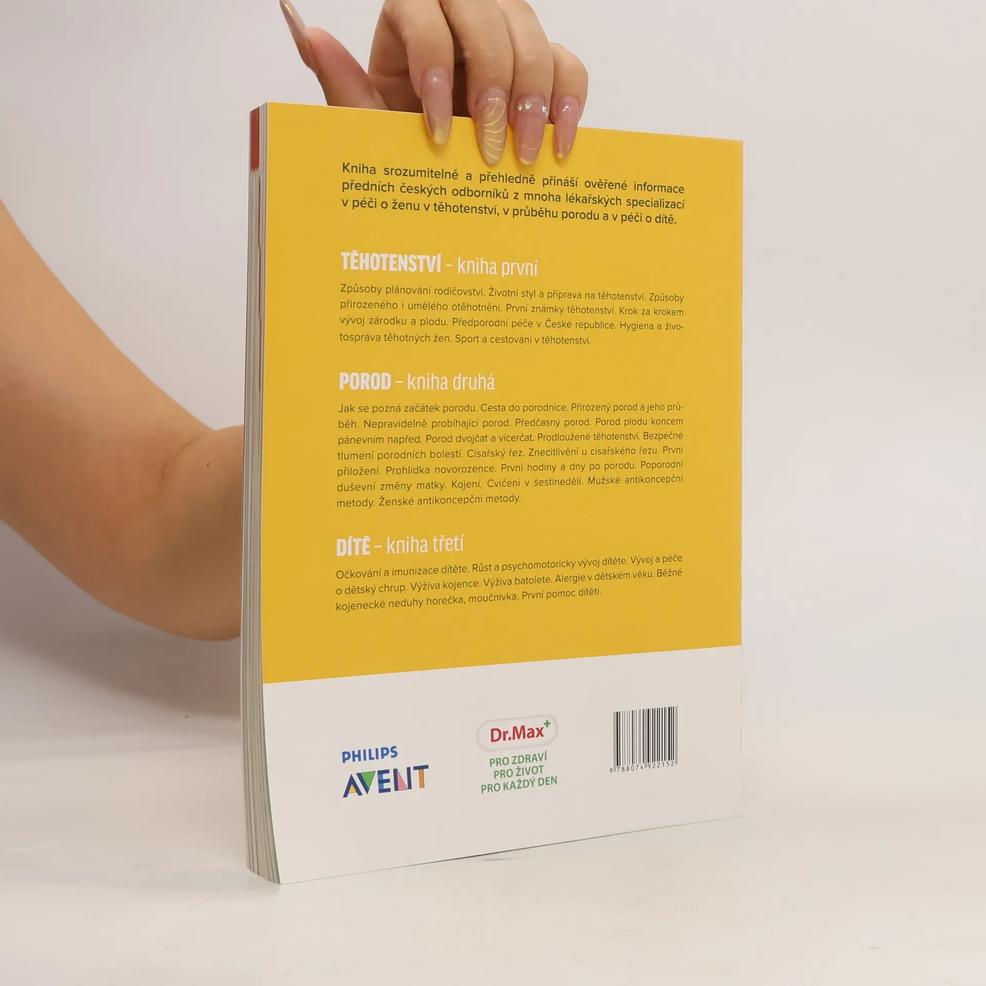 Kniha srozumitelně a přehledně přináší ověřené informace předních českých odborníků z mnoha lékařských oborů o těhotenství, porodu a péči o dítě. Jak se pozná začátek porodu. Cesta do porodnice. Porod přirozený. Průběh porodu. Nepravidelně probíhající porod. Předčasný porod. Porod plodu koncem pánevním napřed. Porod dvojčat a vícerčat. Prodloužené těhotenství. Bezpečné tlumení porodních bolestí. Císařský řez. Znecitlivění u císařského řezu. Prohlídka novorozence. První hodiny a dny po porodu. Poporodní duševní změny matky. Kojení. Cvičení v šestinedělí. Mužské antikoncepční metody. Ženské antikoncepční metody.