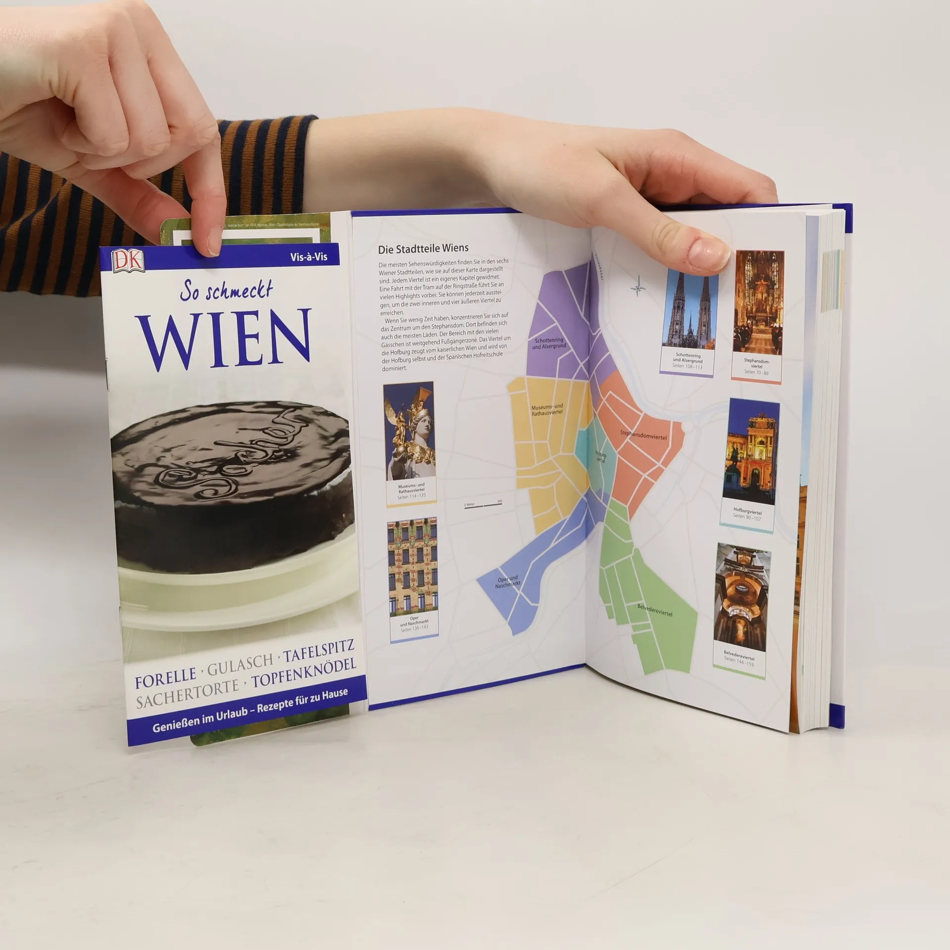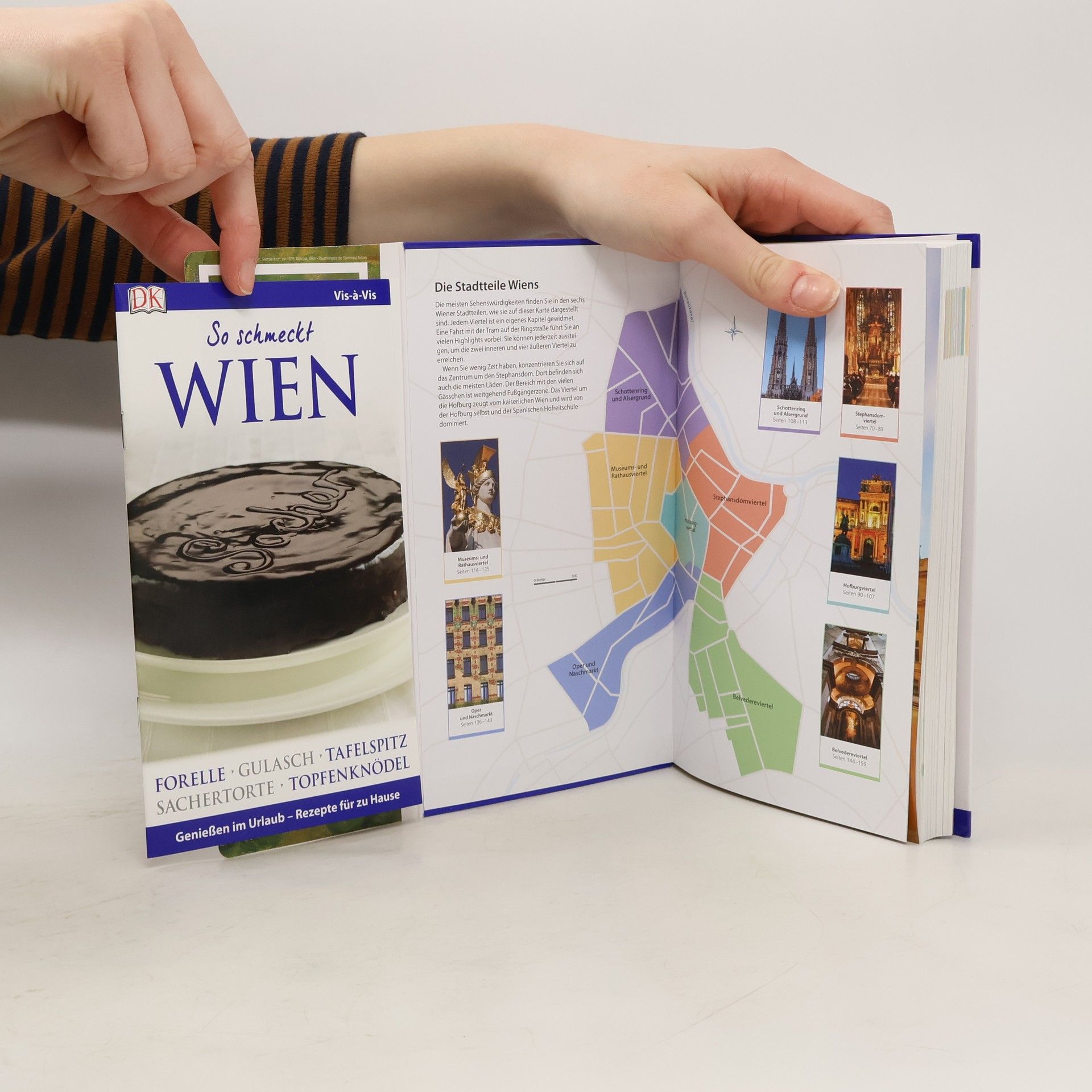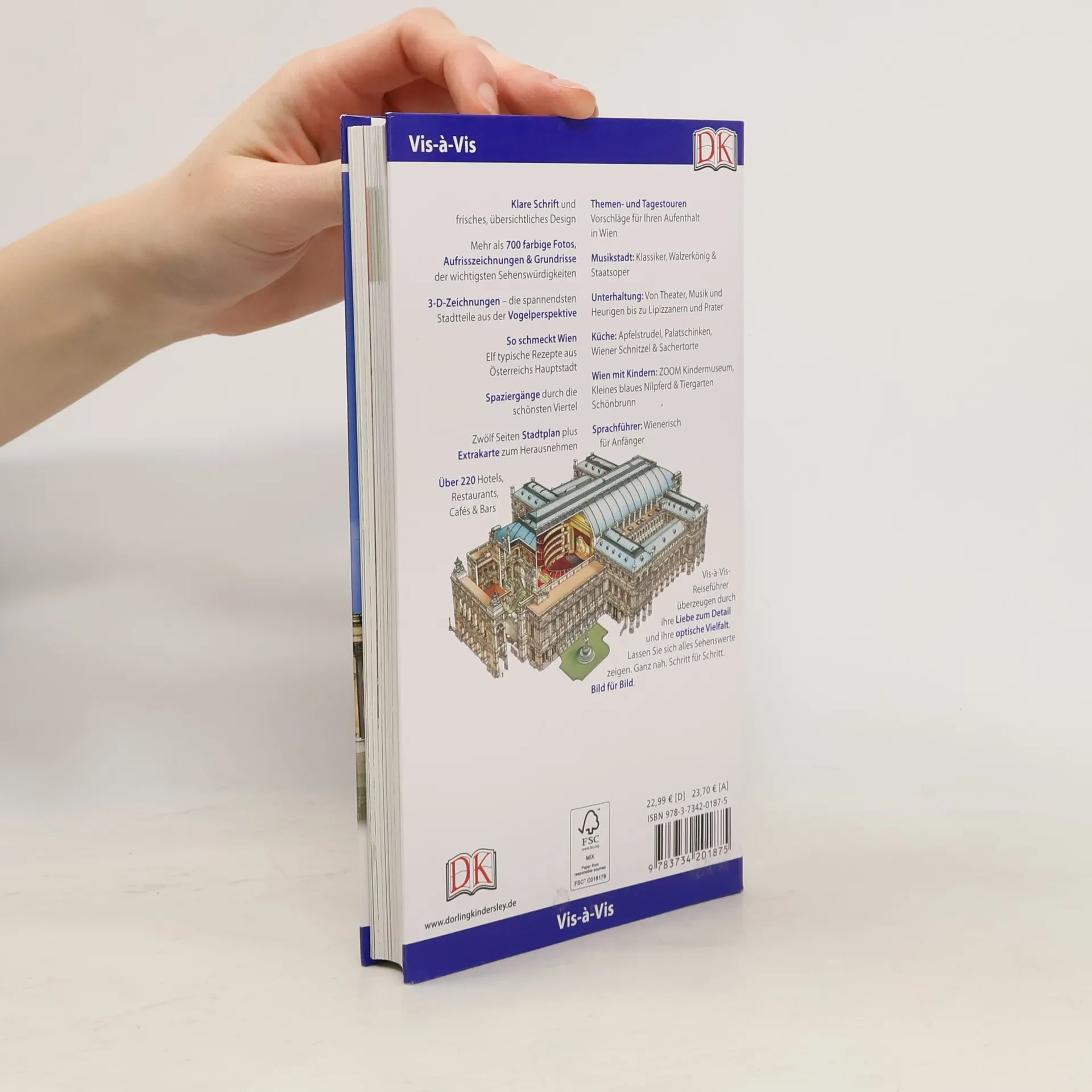 Mit dem Fiaker durch die Altstadt kutschieren, im Kaffeehaus-Ambiente ein Stück Sachertorte genießen oder im Schloss Schönbrunn auf Sissis Spuren wandeln – das historische Flair und die Kulturdenkmäler machen Wien zu einem der romantischsten Reiseziele Europas. Im Vis-à-Vis Wien finden Sie alle Informationen für Ihre Vorhaben: Umfangreiche Porträts zeigen die beeindruckende Kultur und Architektur, von Kaffeehäusern und Jugendstil bis hin zu historischen Gebäuden und Palais. Im Kapitel „Zu Gast in Wien“ erhalten Sie Tipps zu Restaurants, Shopping, Unterhaltung und Aktivitäten für Kinder. Flanieren Sie über den Kohlmarkt oder genießen Sie eine Vorstellung in der Wiener Staatsoper. 3D-Aufrisszeichnungen vom Burgtheater und Stephansdom sowie über 700 hochwertige Farbfotografien bieten spannende Einblicke in Land und Leute. Ein detaillierter Stadtplan und eine herausnehmbare Extrakarte erleichtern die Orientierung vor Ort. Besondere Hintergründe zur Musikszene und Aktivitäten wie den Tiergarten Schönbrunn oder das ZOOM Kindermuseum inspirieren Ihre Reiseplanung. Ein Mini-Kochbuch mit typischen Gerichten wie Gulaschsuppe und Sachertorte vermittelt die kulinarische Seite Wiens. Entdecken Sie die Facettenreichtum der österreichischen Hauptstadt!
